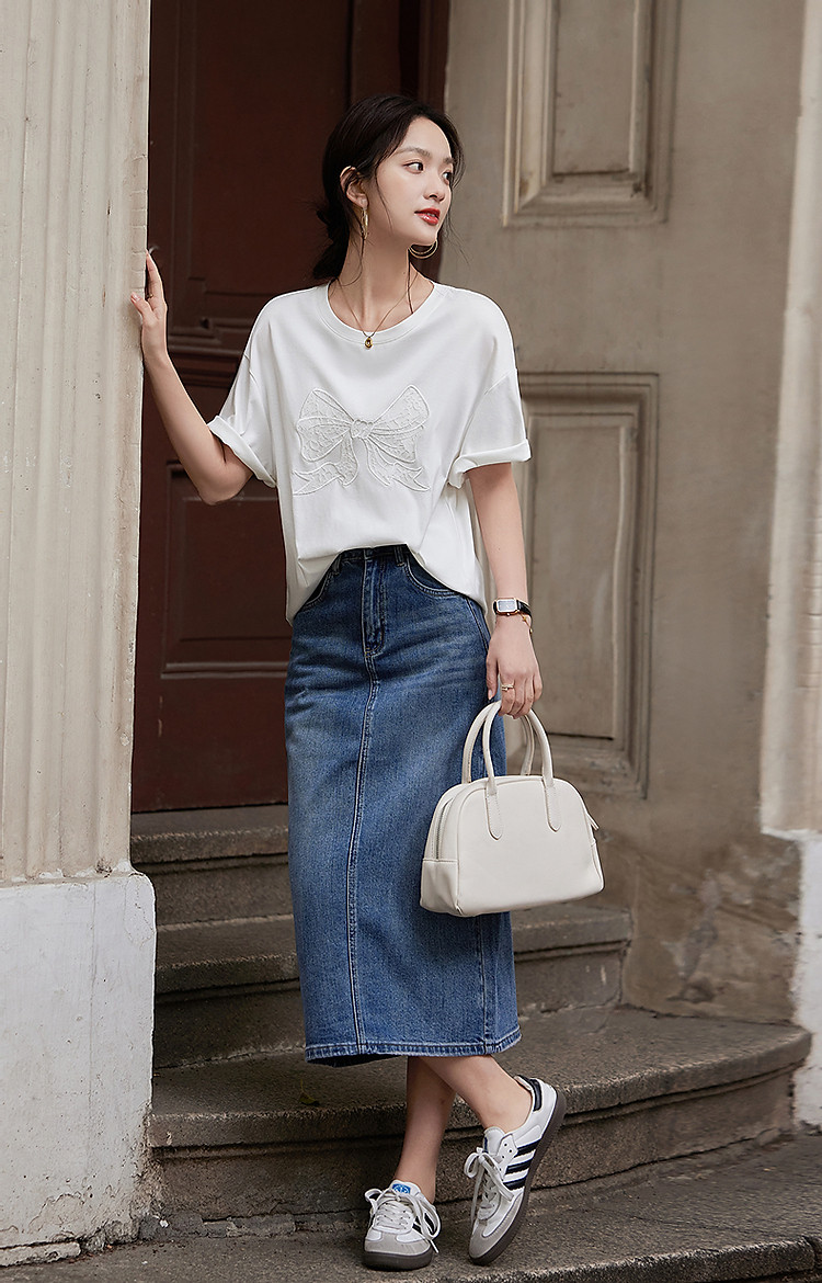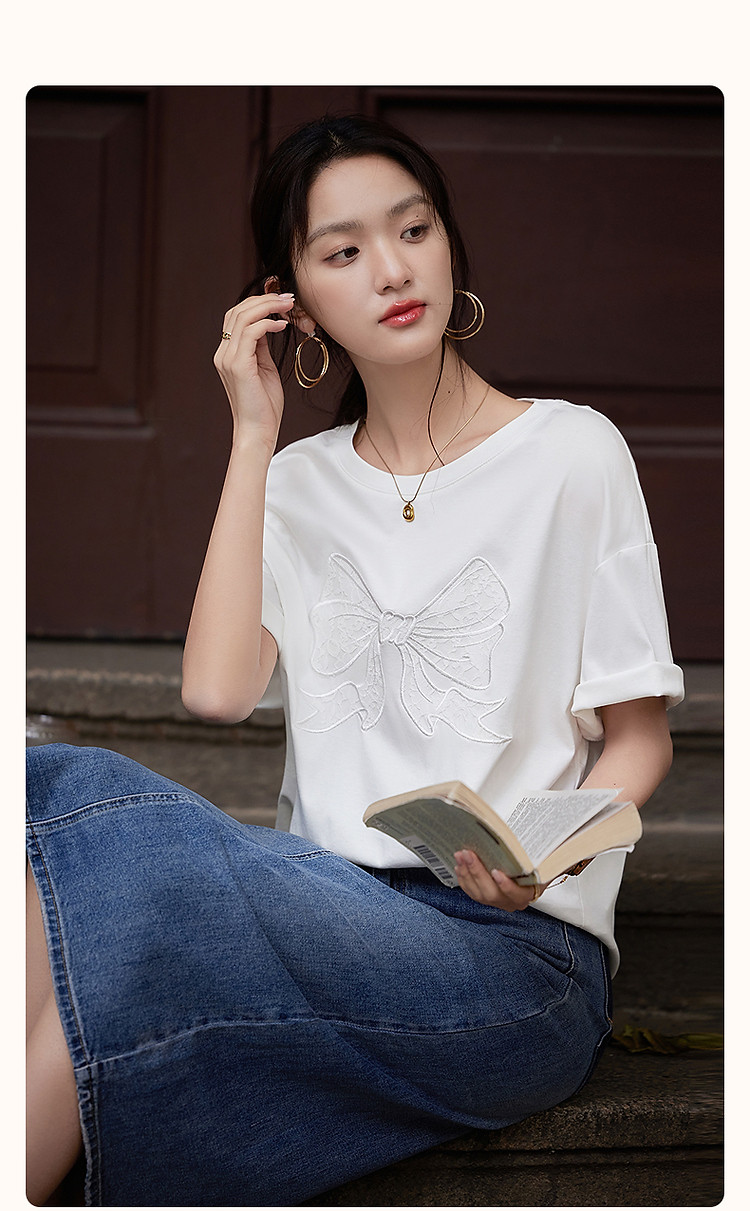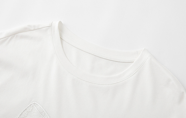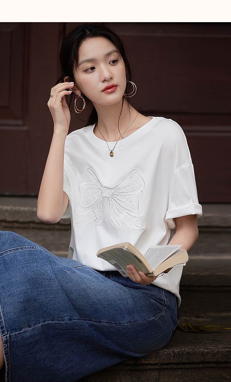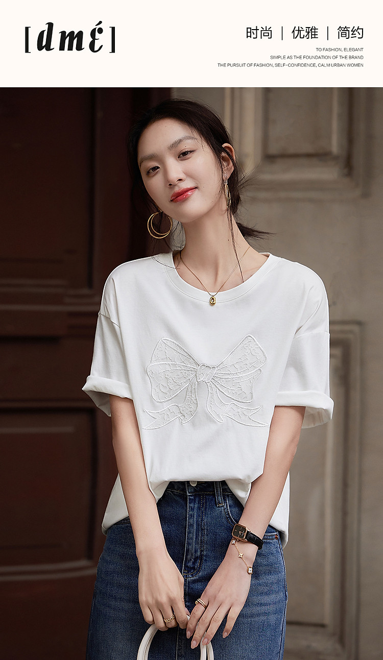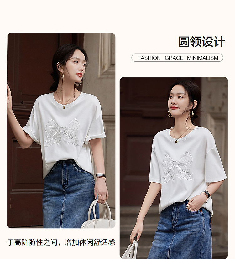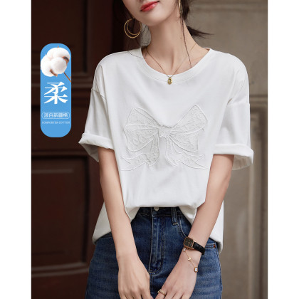 【面膜t恤】春季180G棉氨短袖t恤女刺绣蕾丝蝴蝶结女式t恤