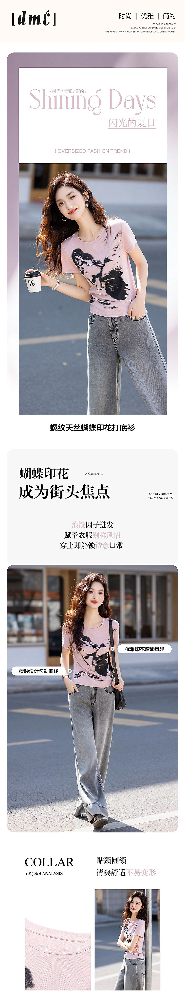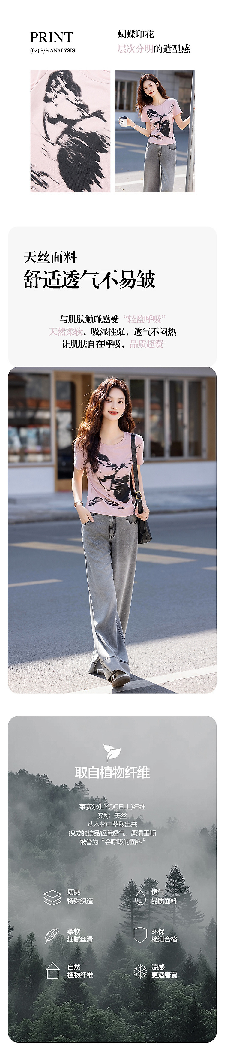 【210G罗纹天丝】夏季气质蝴蝶印花打底衫修身弹力遮肉女t恤