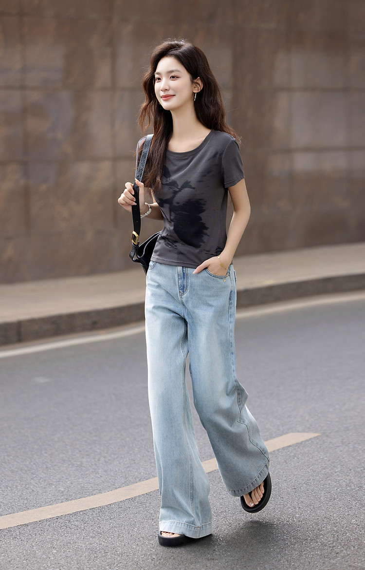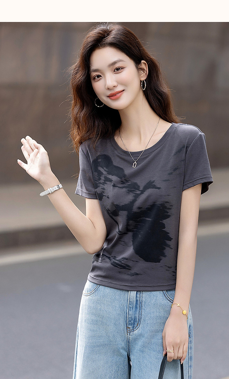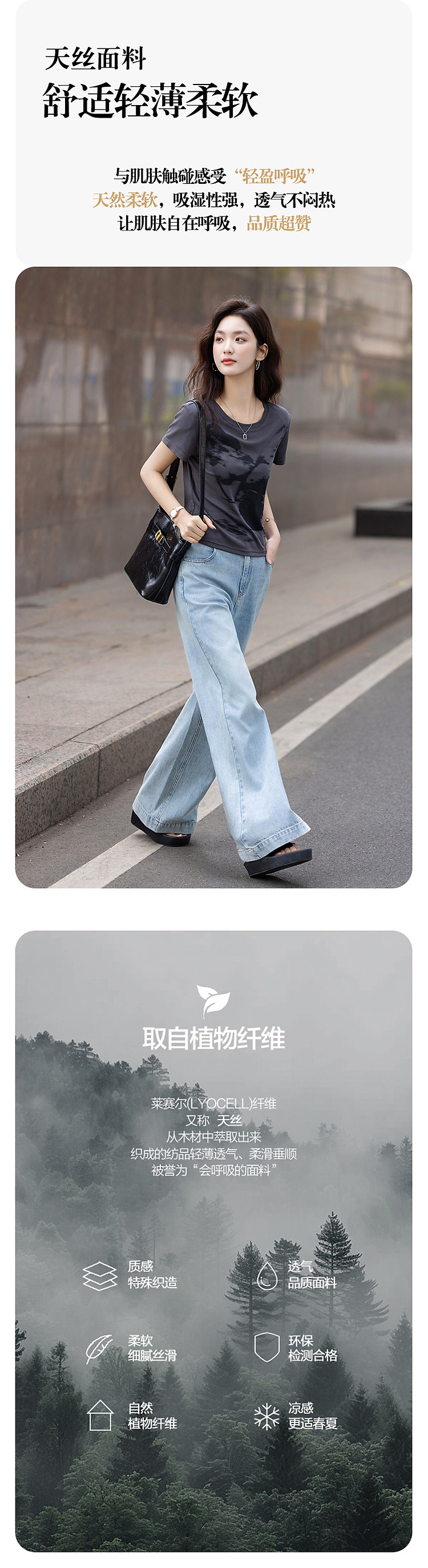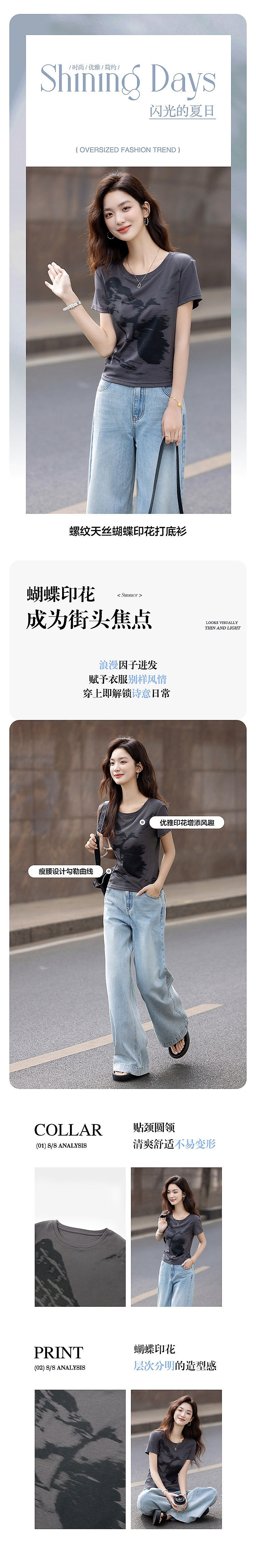 【210G罗纹天丝】夏季气质蝴蝶印花打底衫修身弹力遮肉女t恤