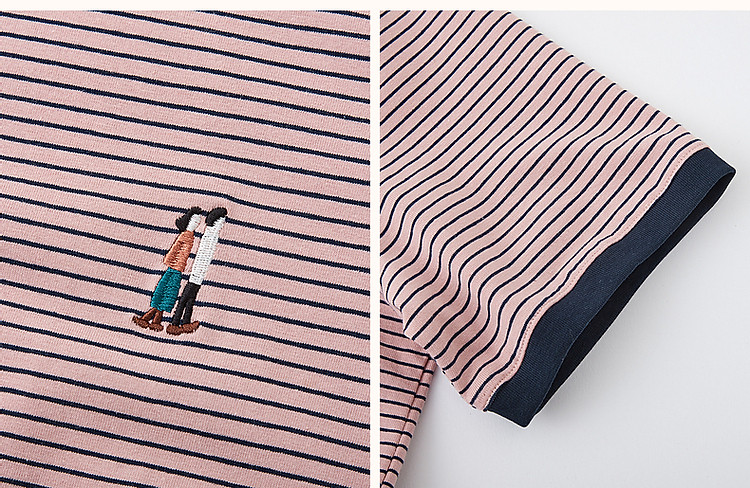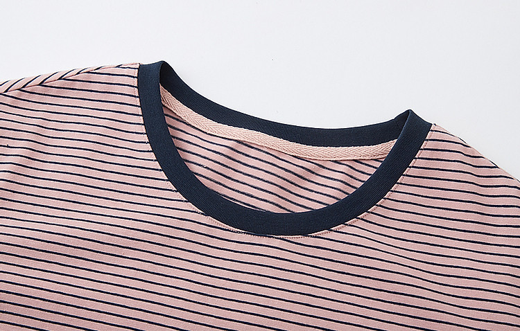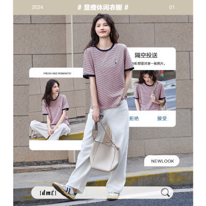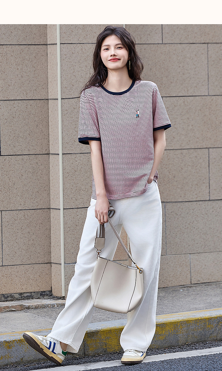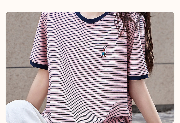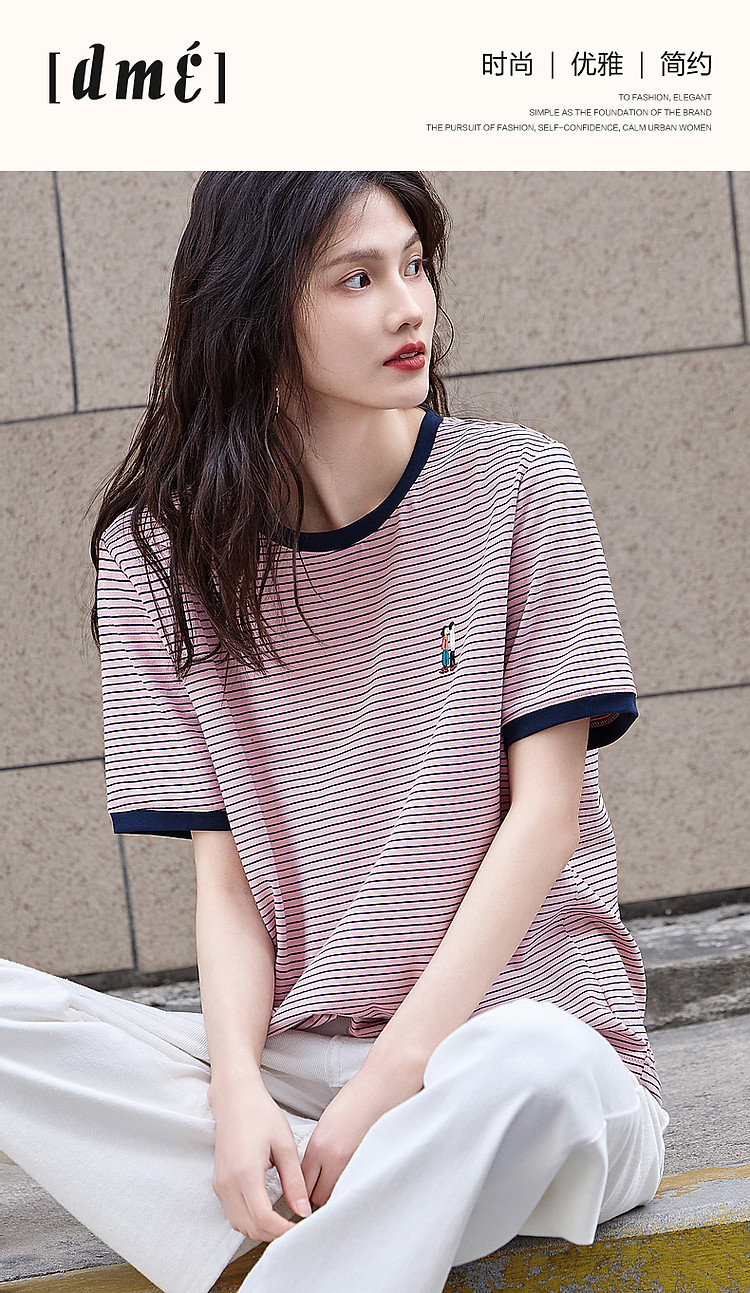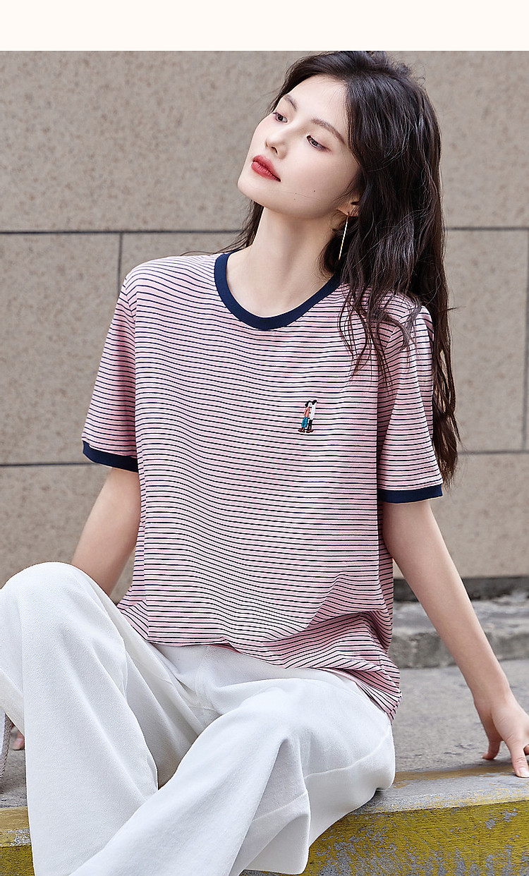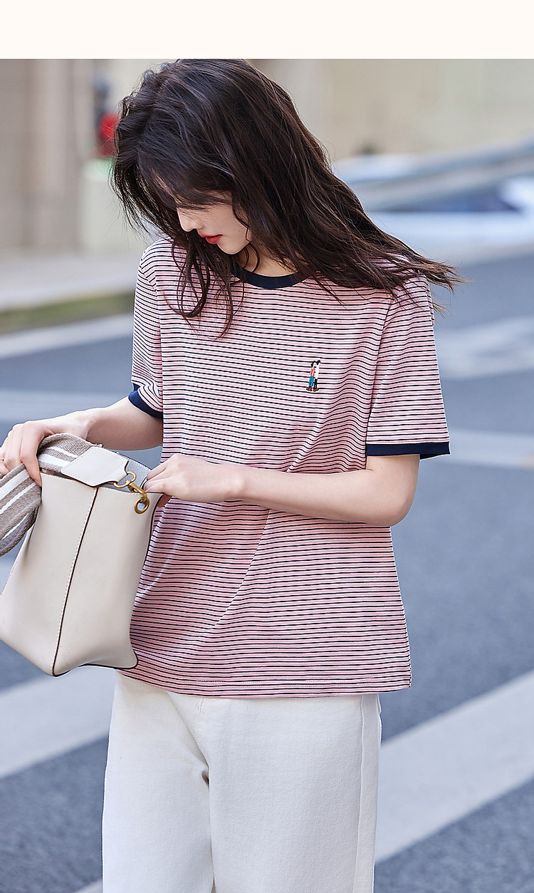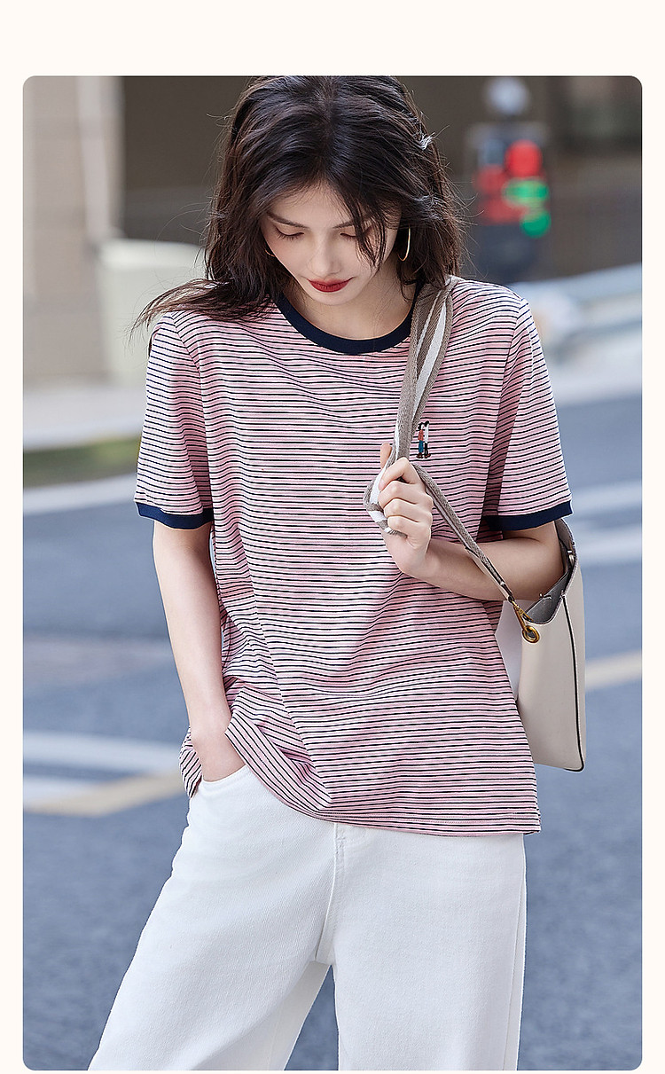 【复古情怀】圆领条纹撞色短袖t恤女刺绣时髦舒适女式t恤