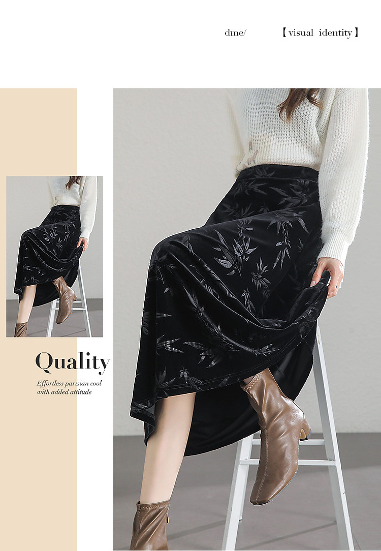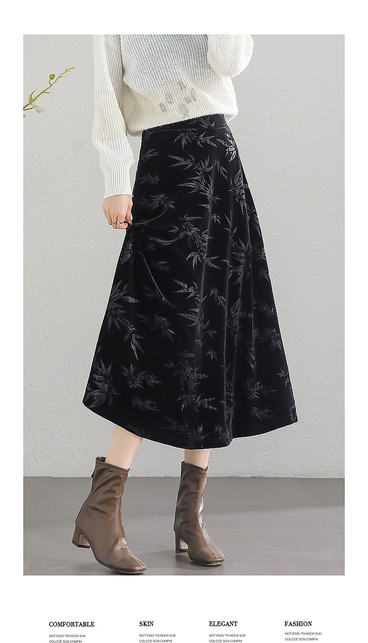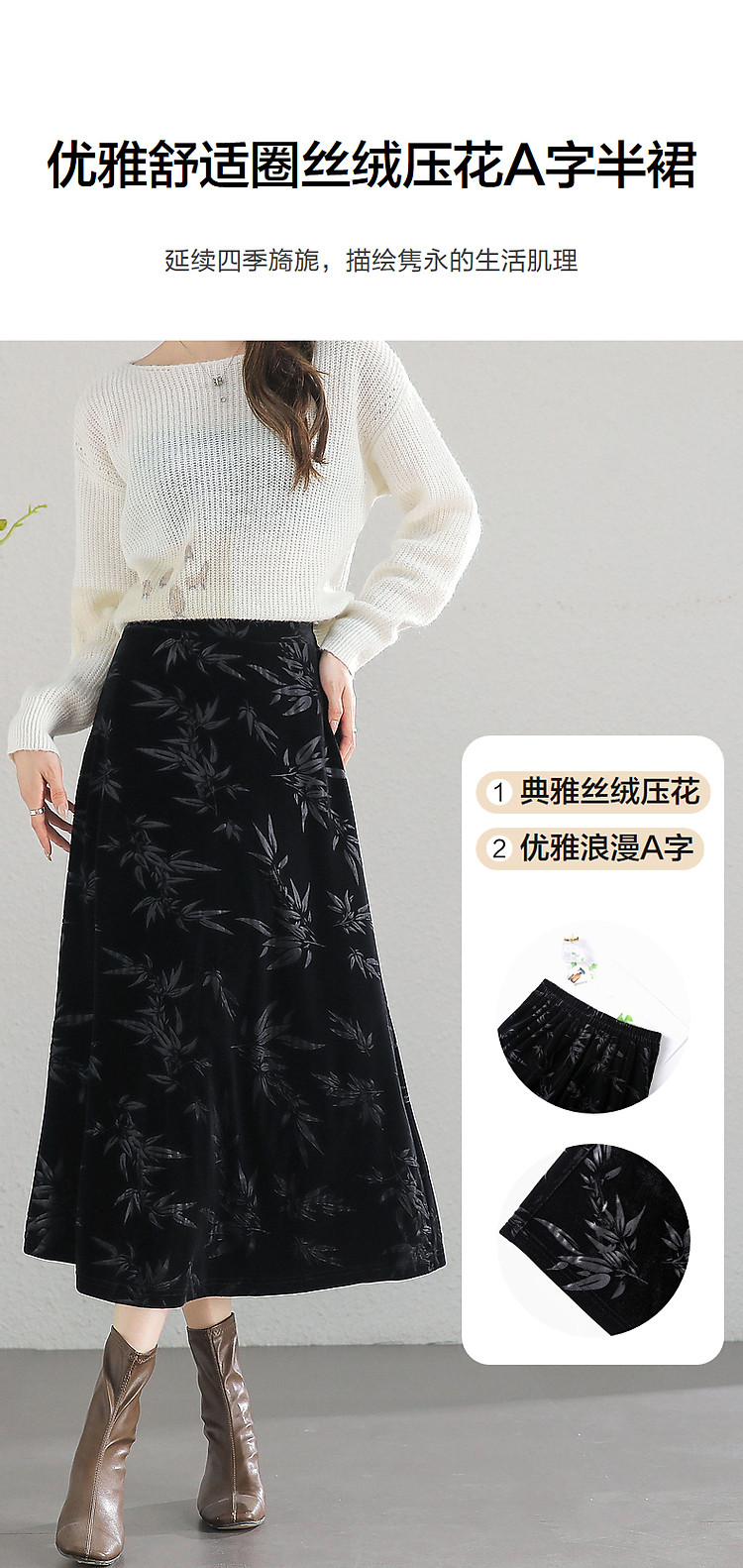 【优雅舒适圈】秋简约风后橡筋腰典雅丝绒压花A字藏肉半身裙女