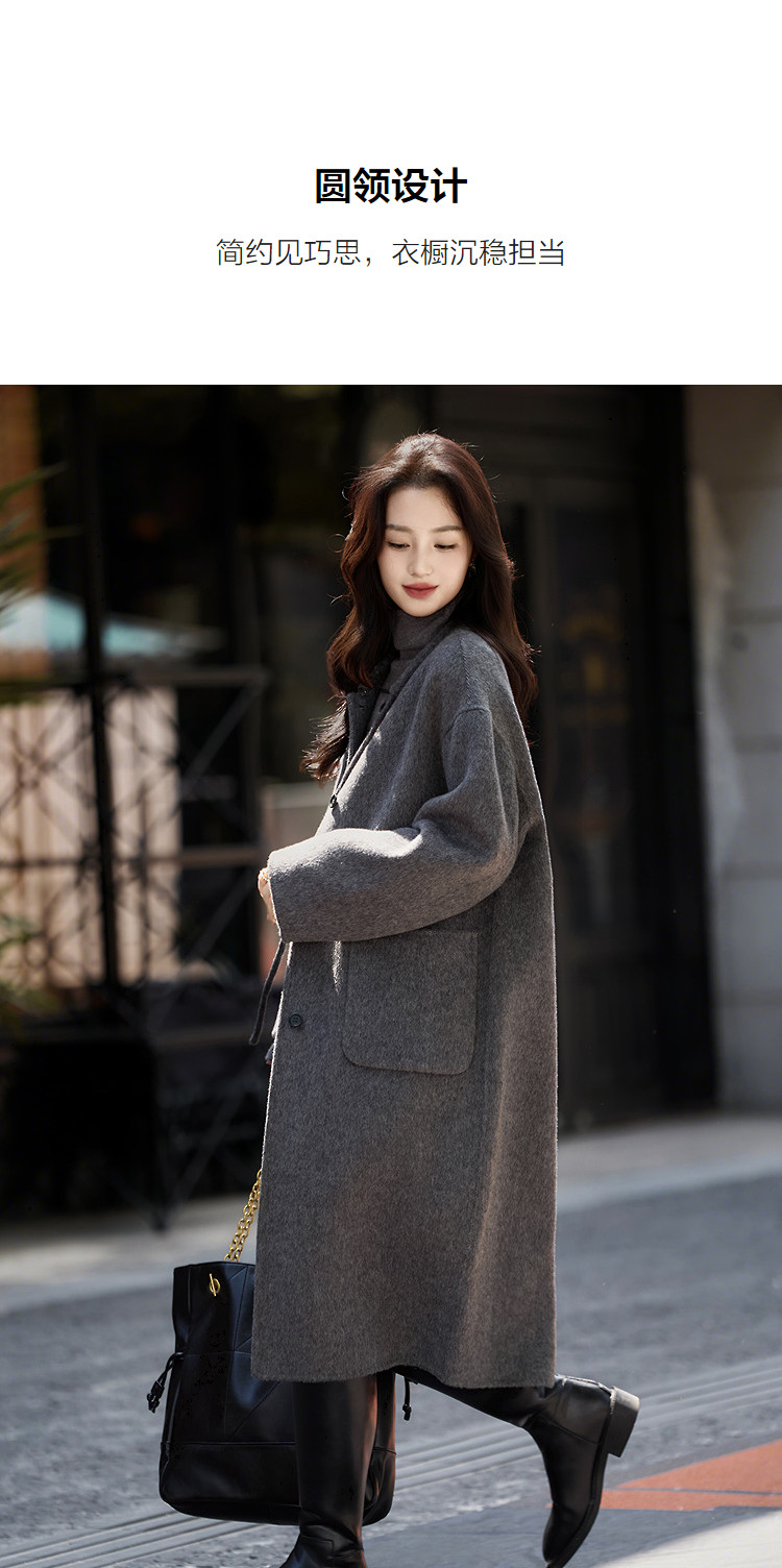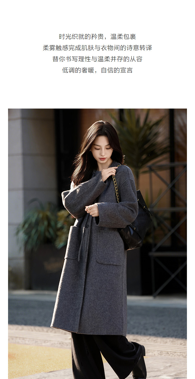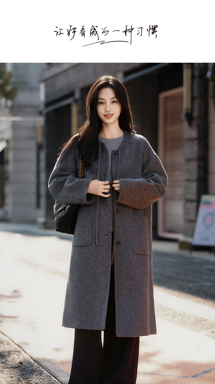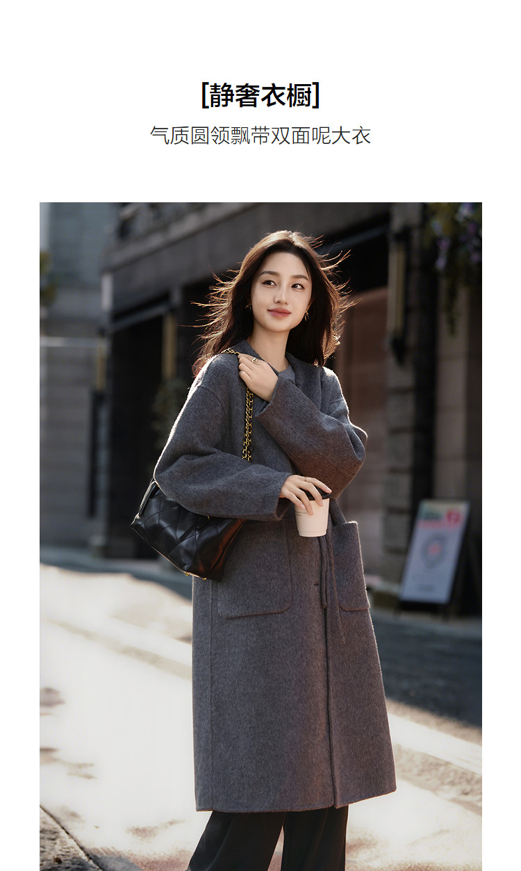 【100绵羊毛双面呢】冬季静奢圆领飘带大衣加长款女式毛呢外套