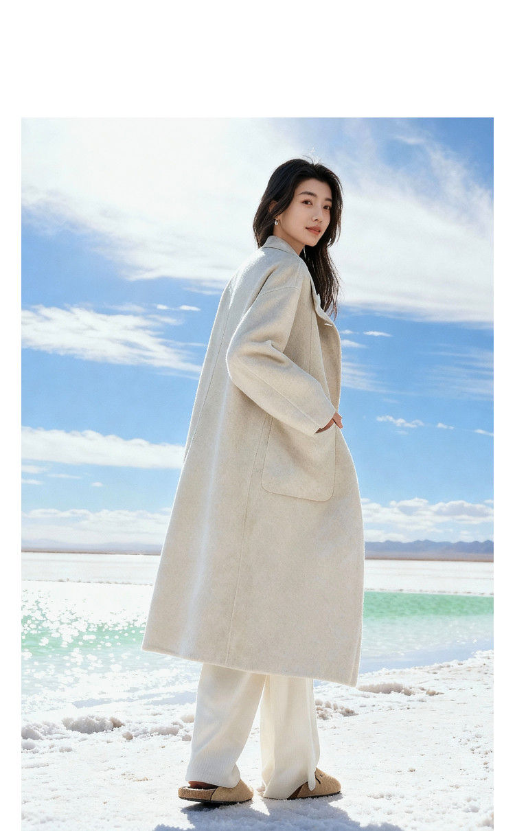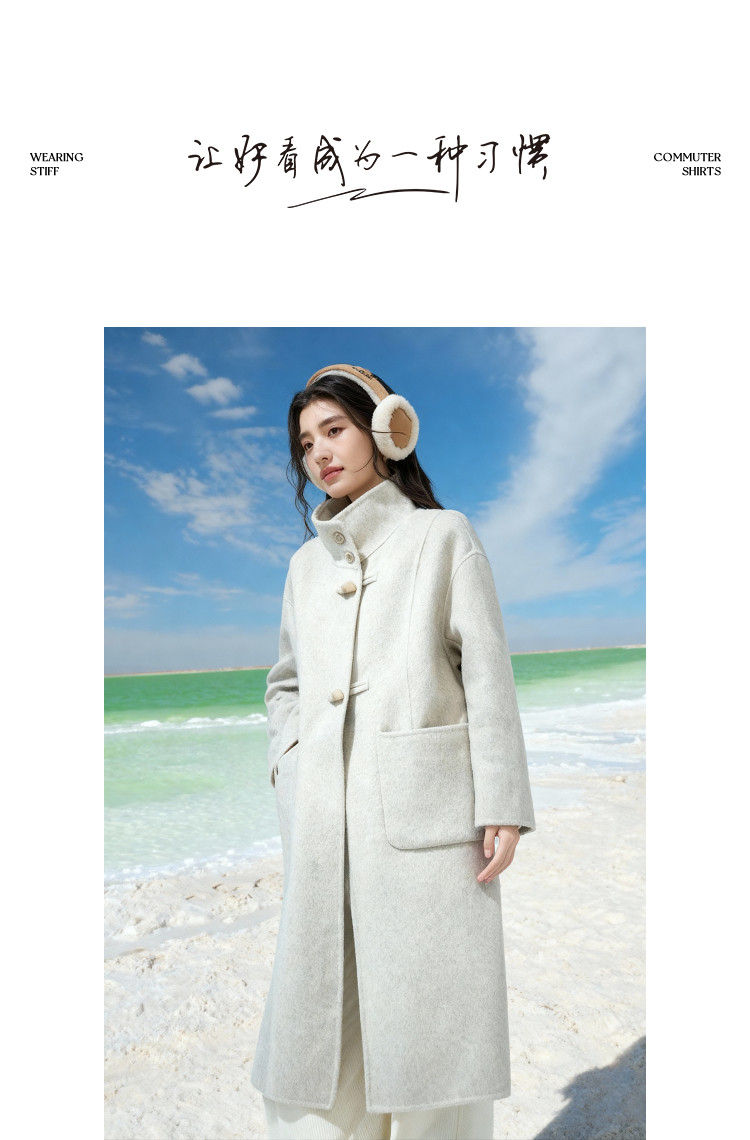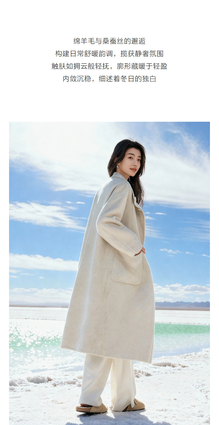 【绵羊毛桑蚕丝混纺】冬季静奢立领双面呢大衣加长款女式毛呢外套