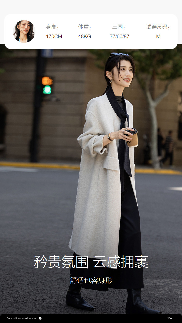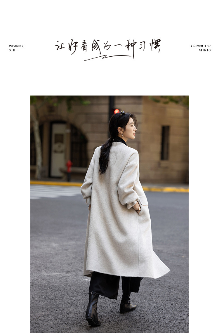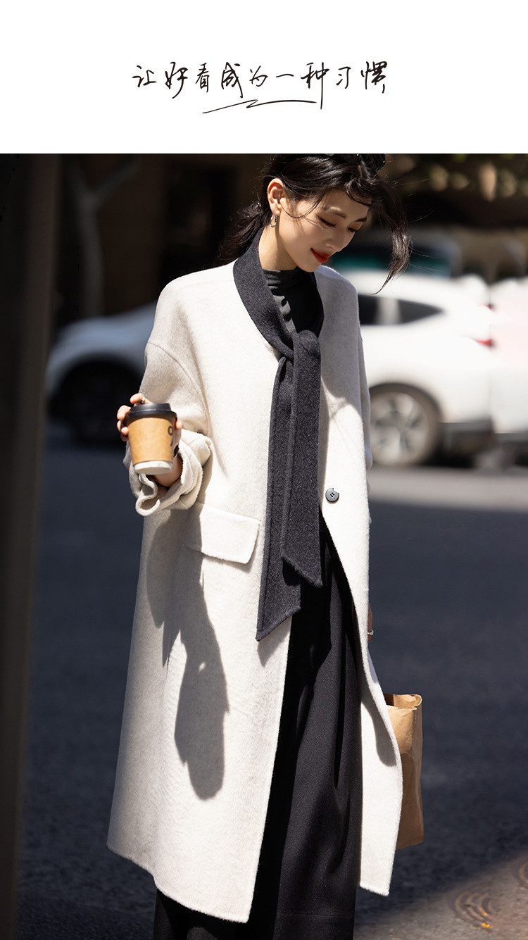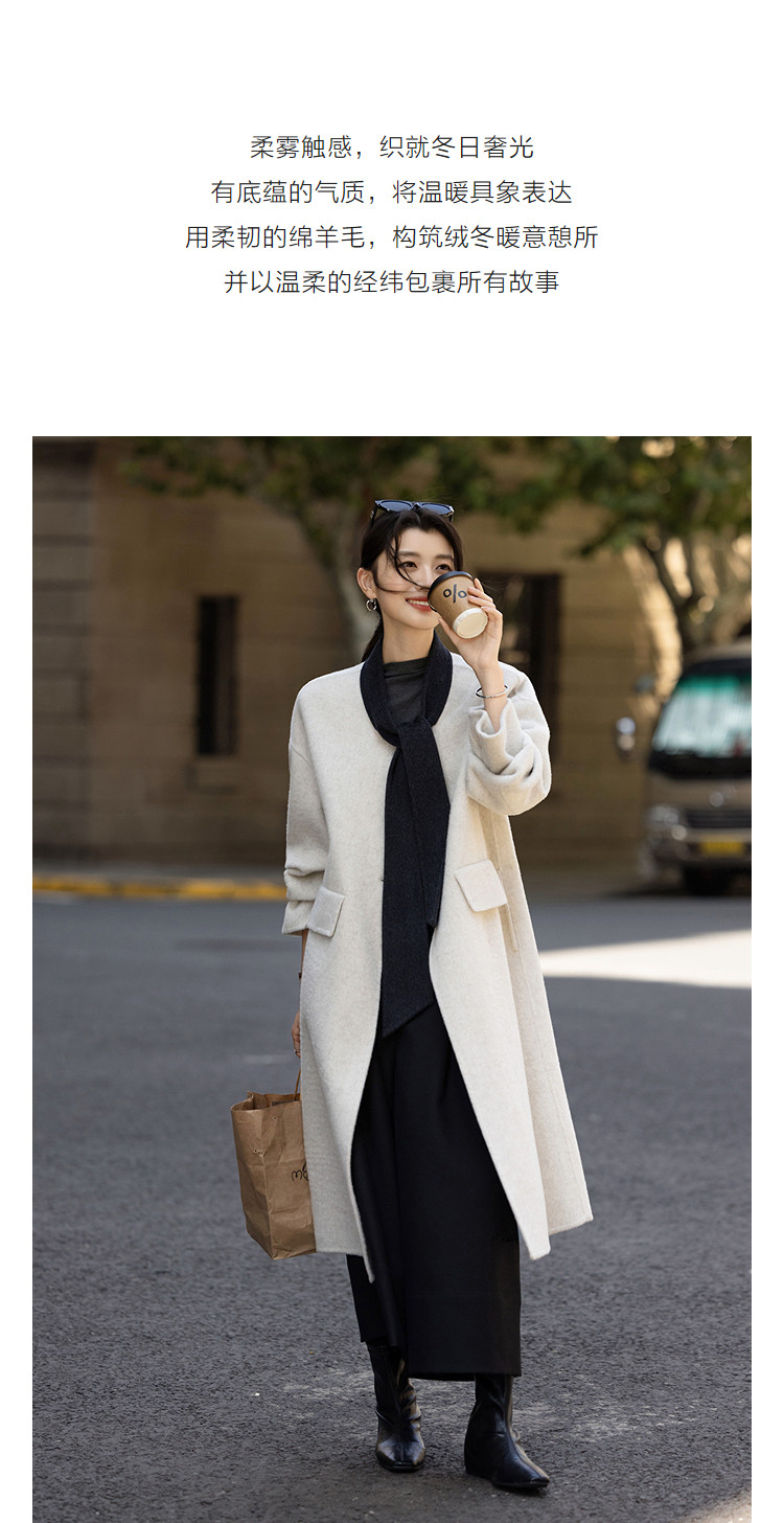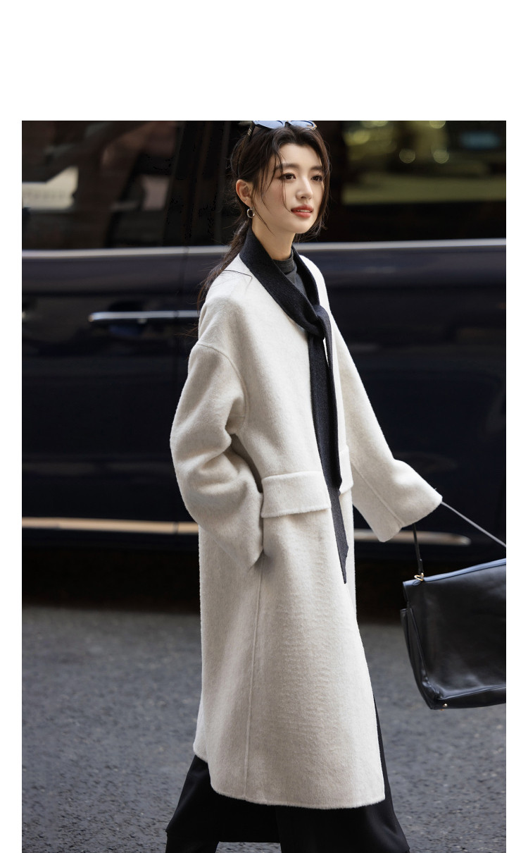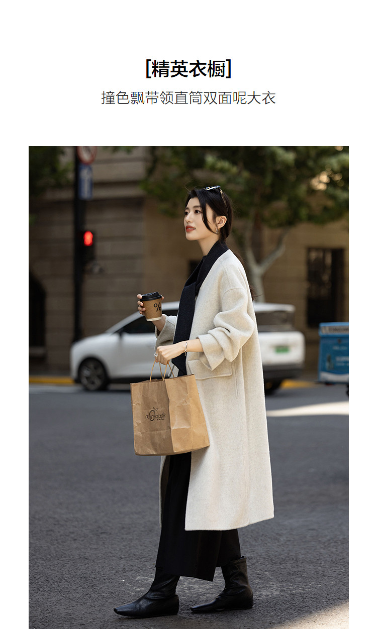 【精英衣橱】冬季绵羊毛撞色飘带领大衣直筒中长气质女式毛呢外套