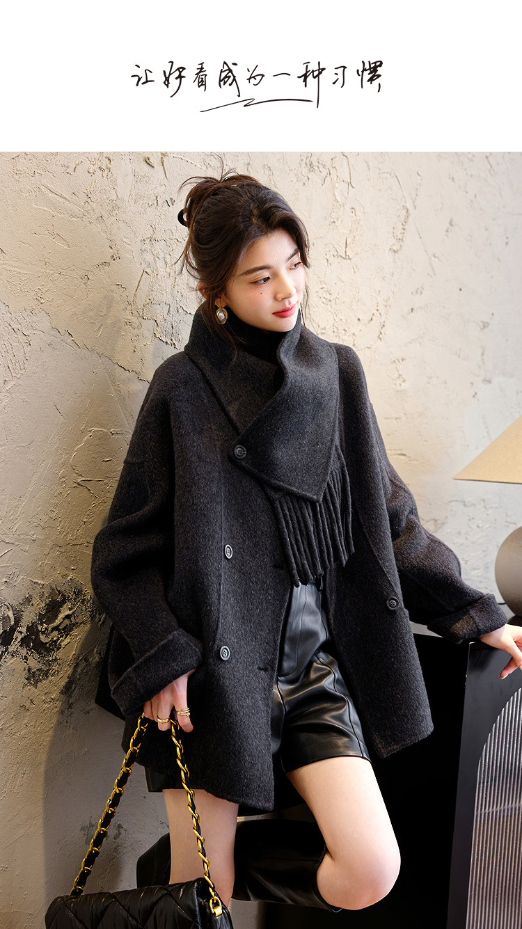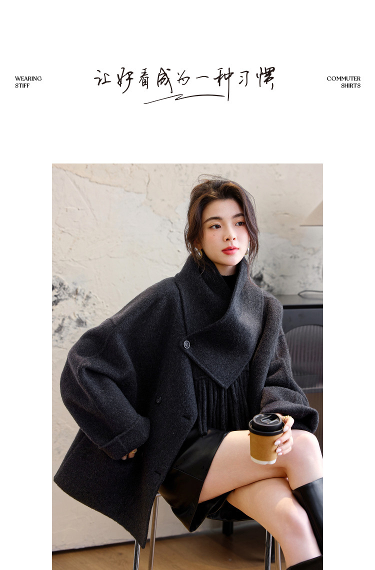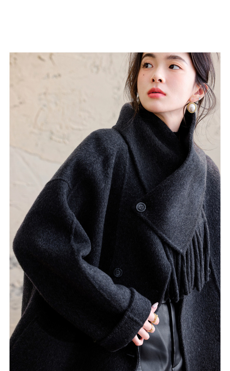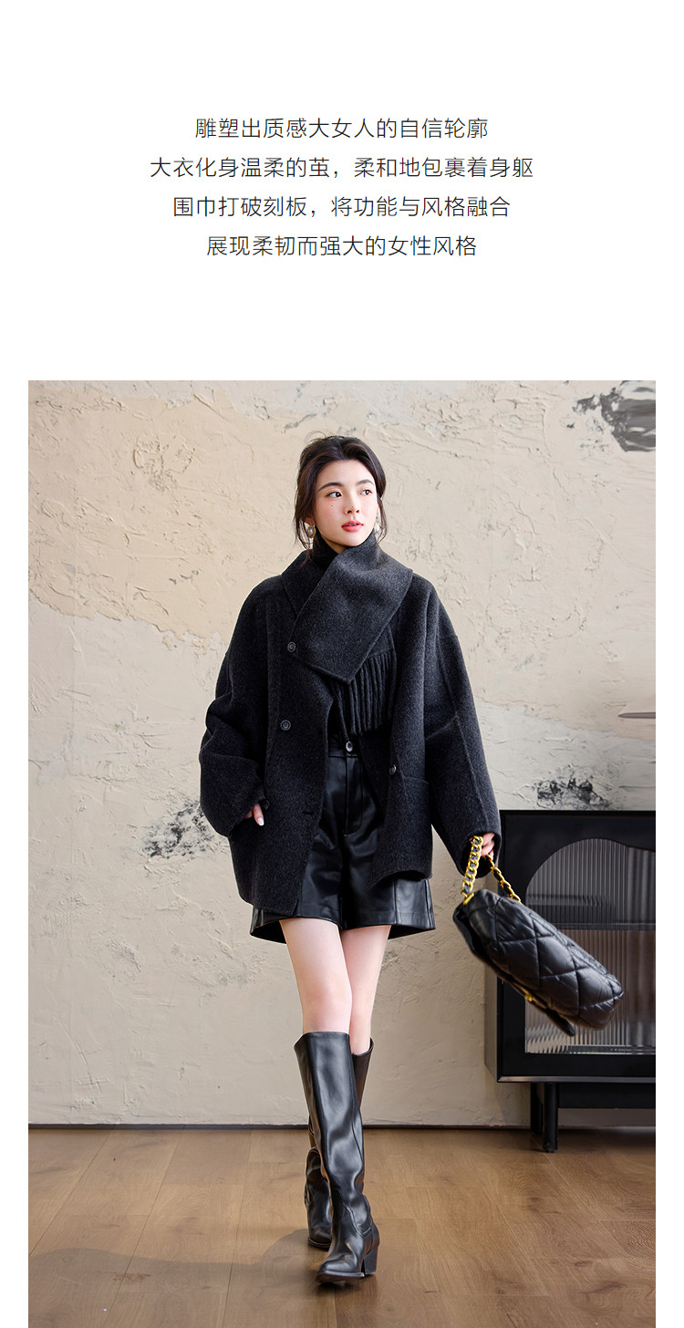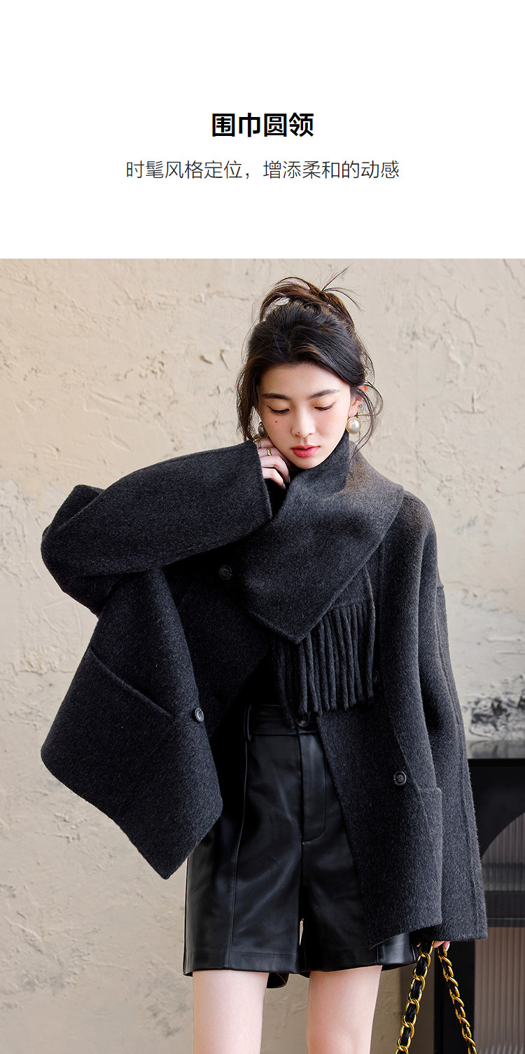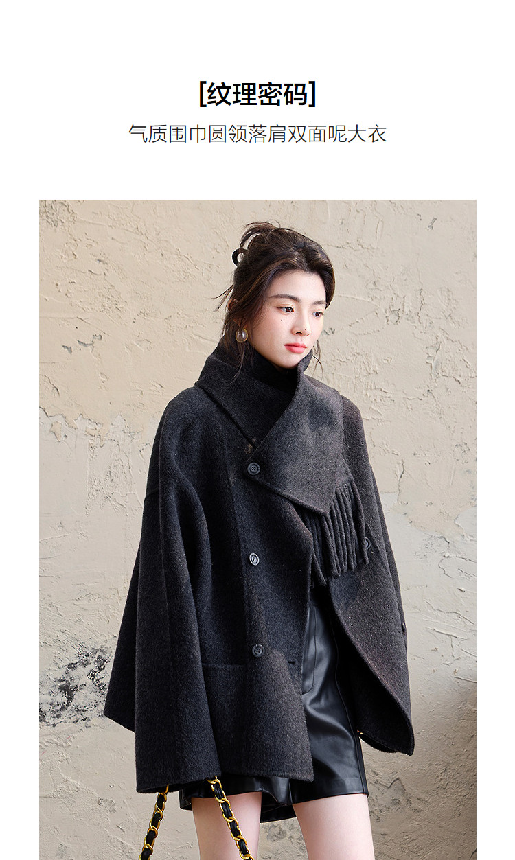 【手工双面呢】冬季纹理密码绵羊毛混纺大衣围巾圆领女式毛呢外套