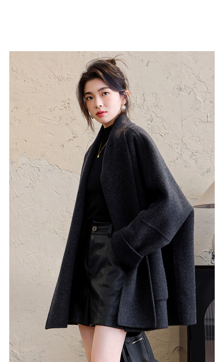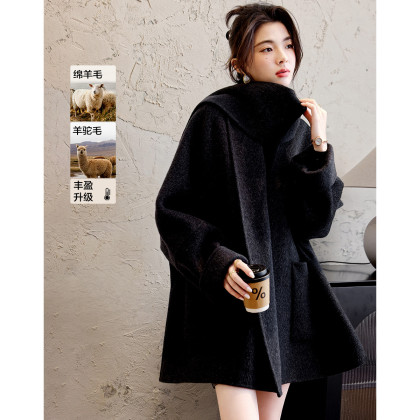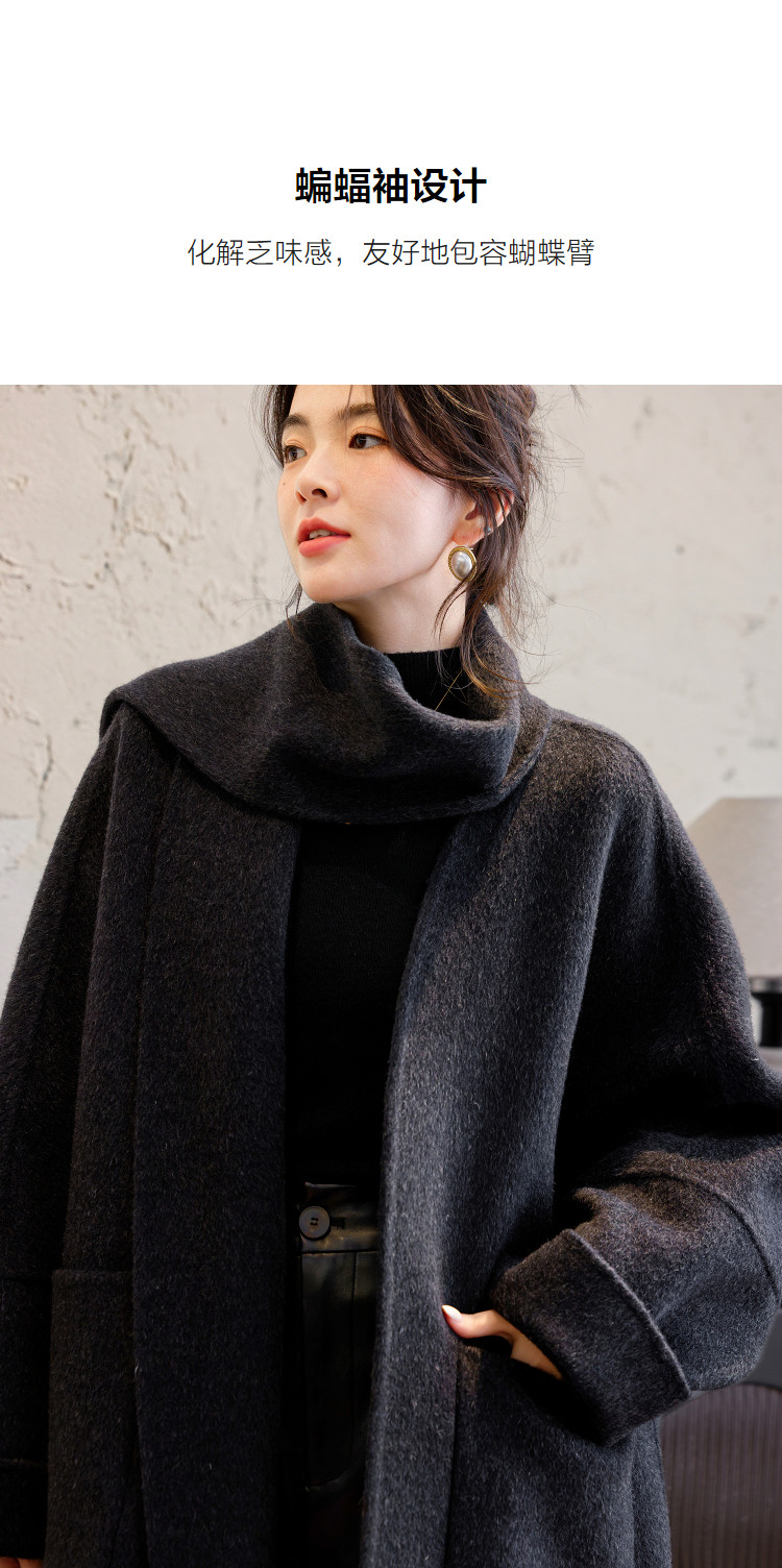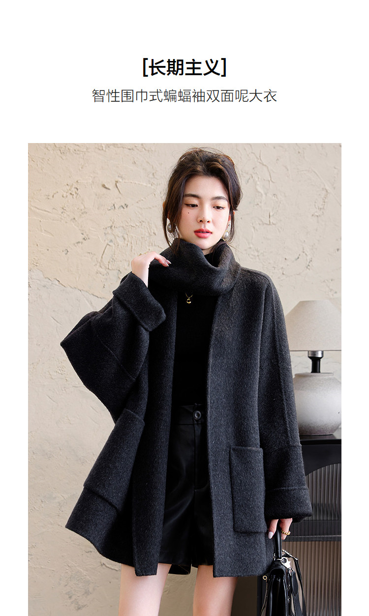 【羊驼毛绵羊毛混纺】冬季智性围巾式开襟蝙蝠袖双面呢大衣女外套