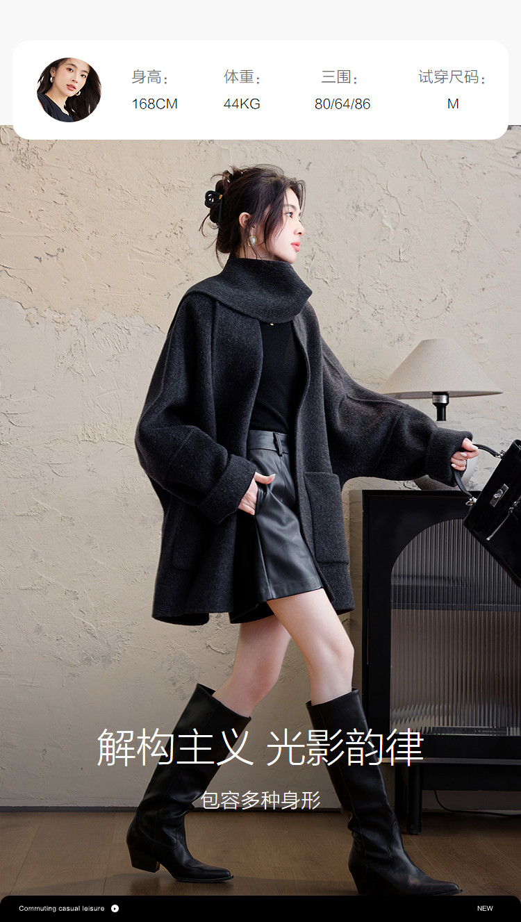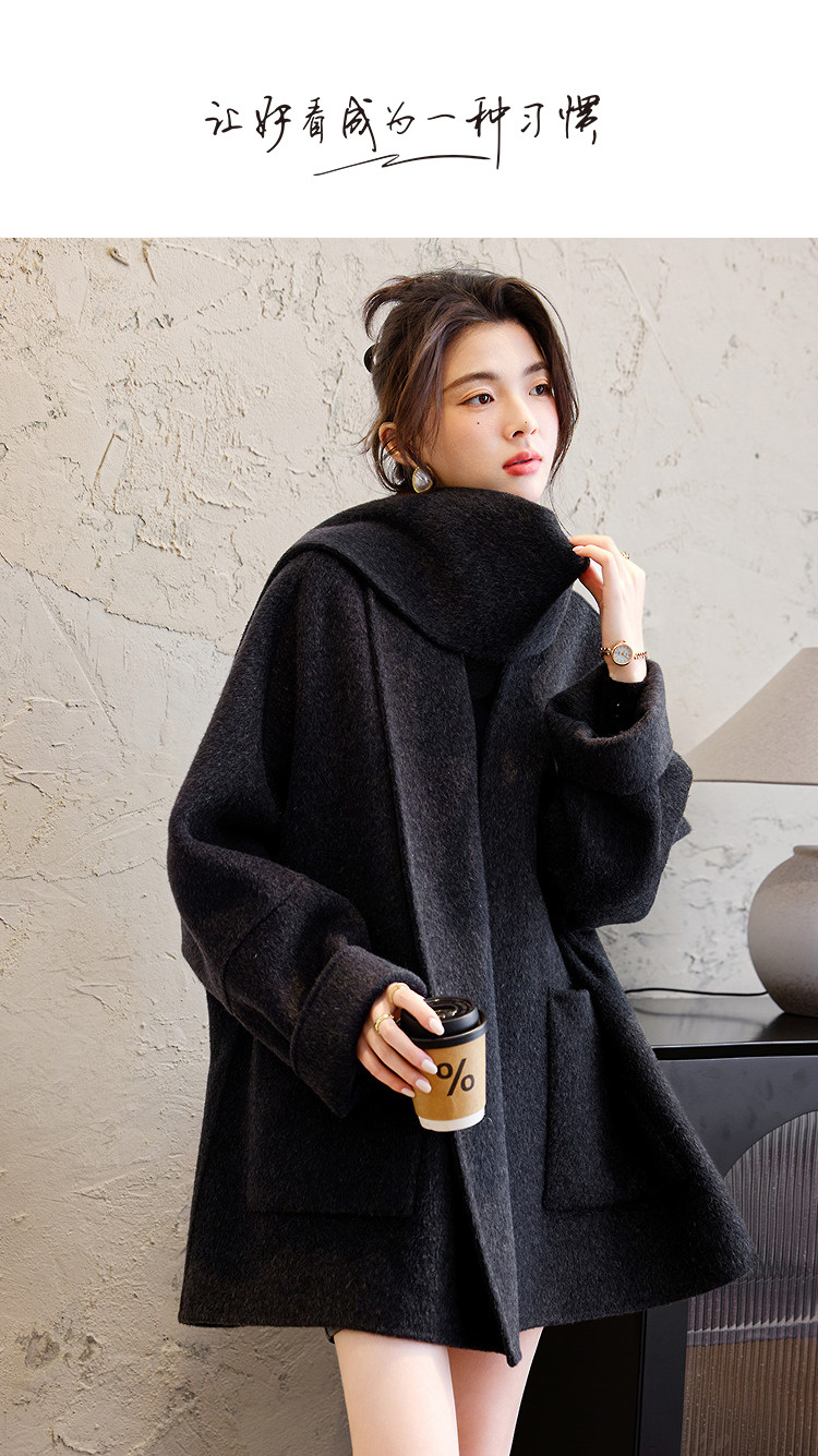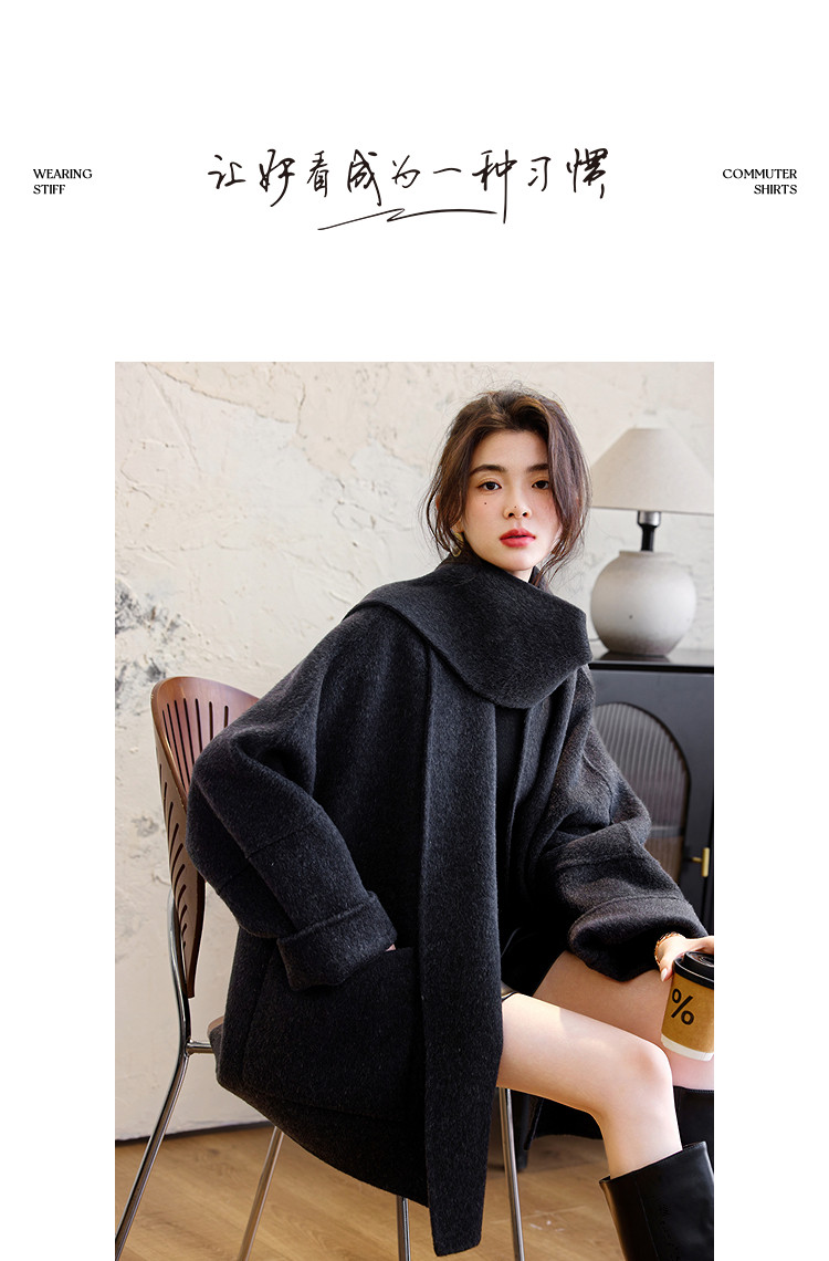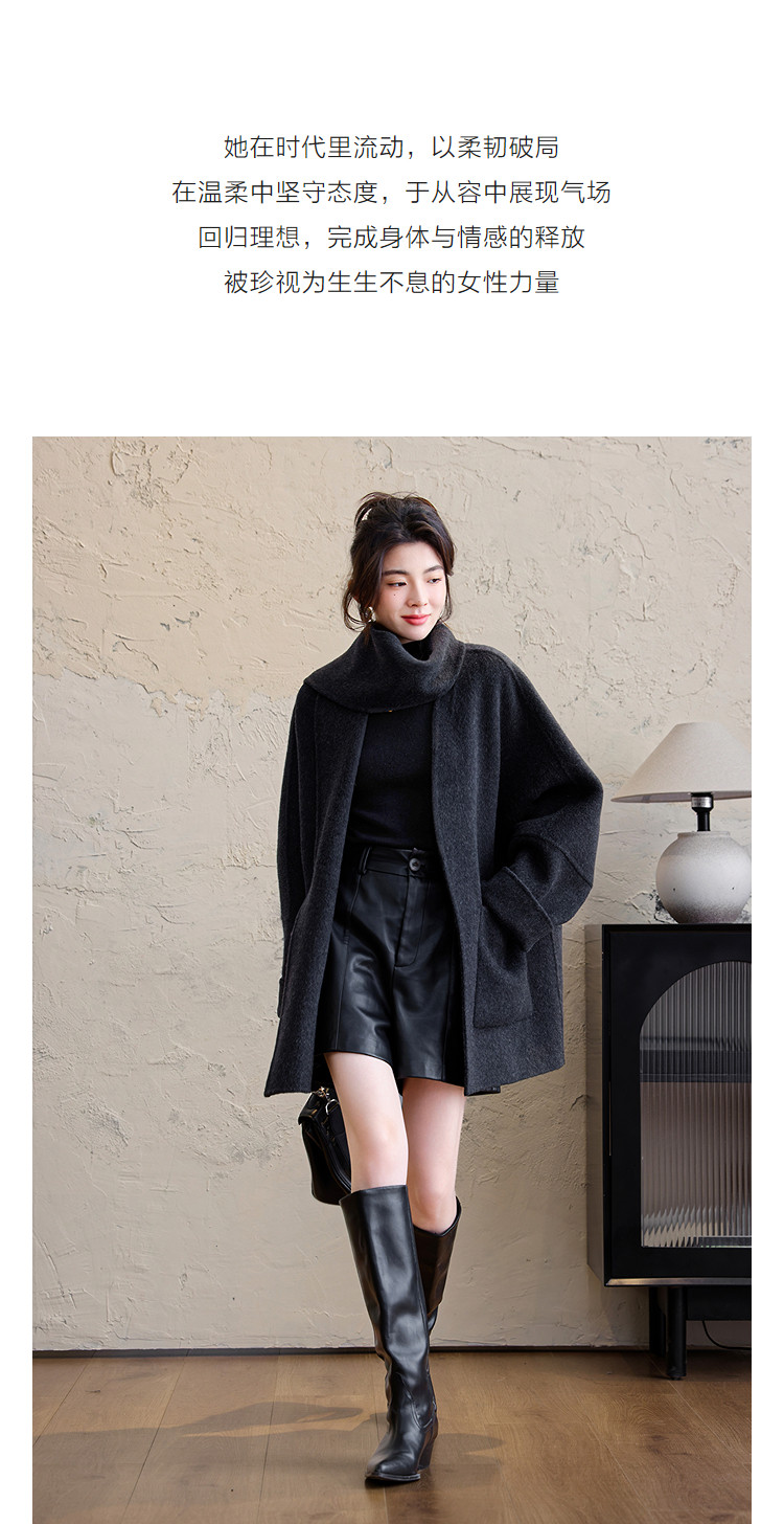 【羊驼毛绵羊毛混纺】冬季智性围巾式开襟蝙蝠袖双面呢大衣女外套