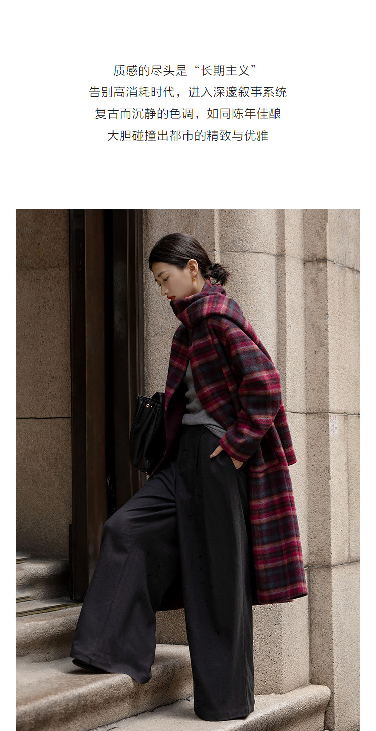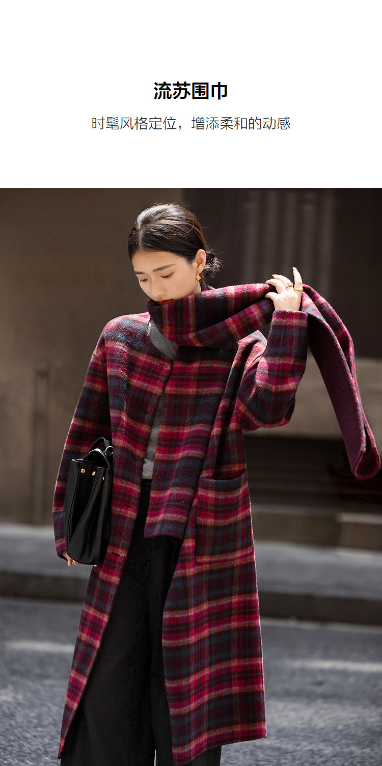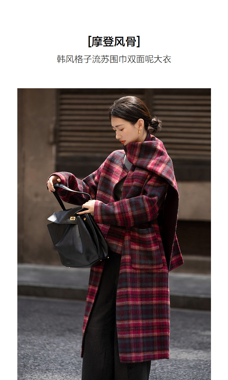 【手工双面呢】冬季摩登风骨绵羊毛混纺大衣格子流苏围巾女式外套
