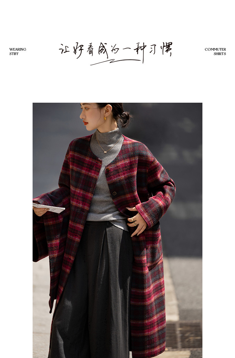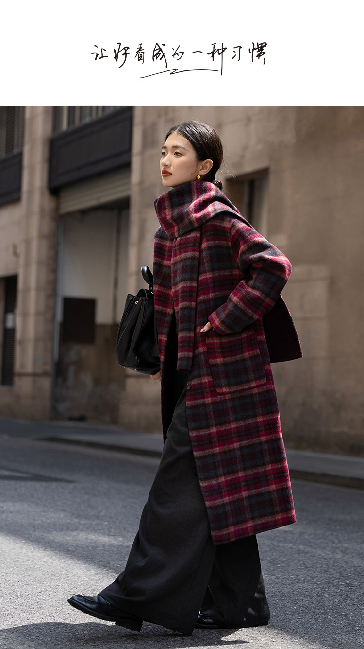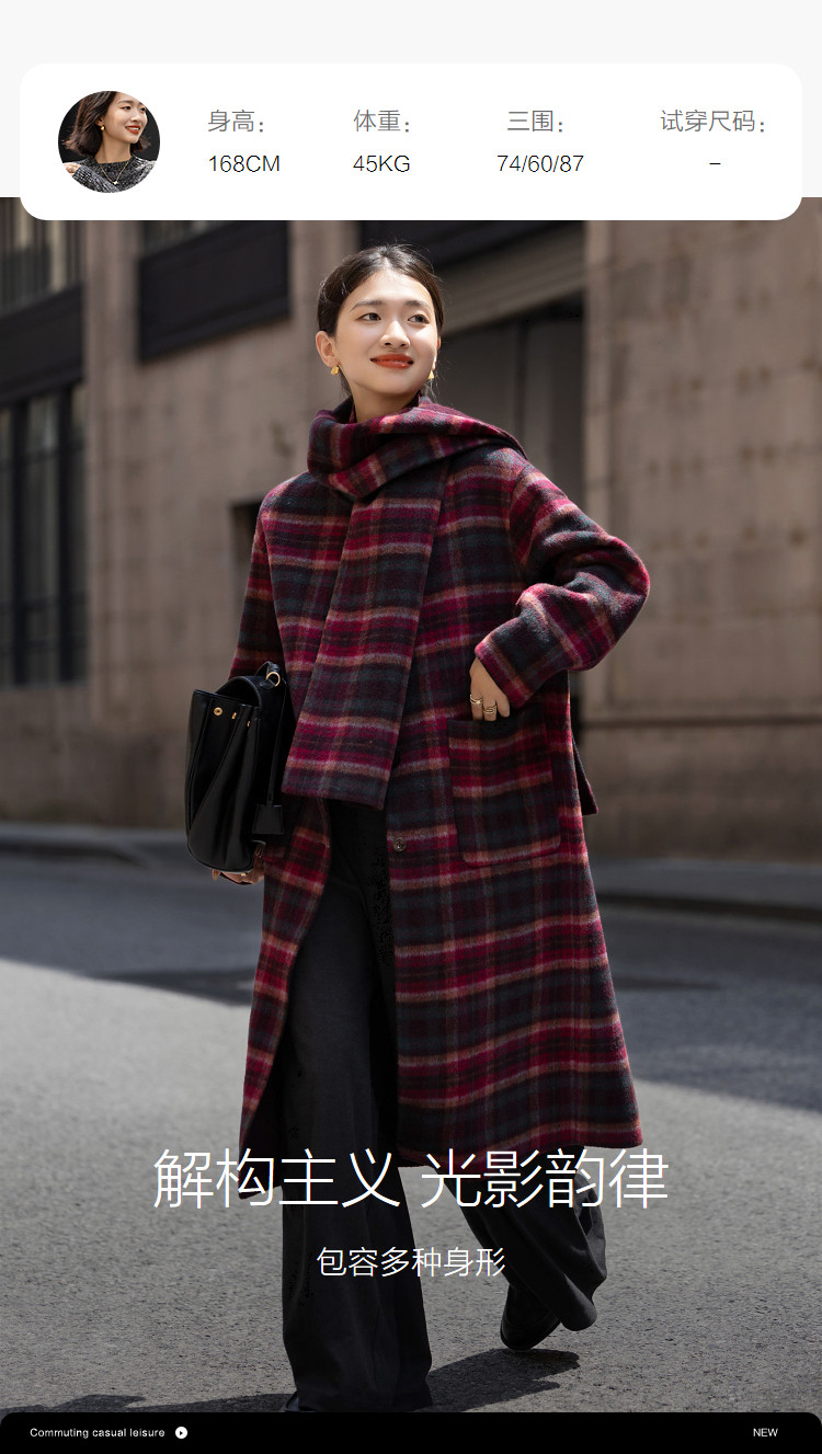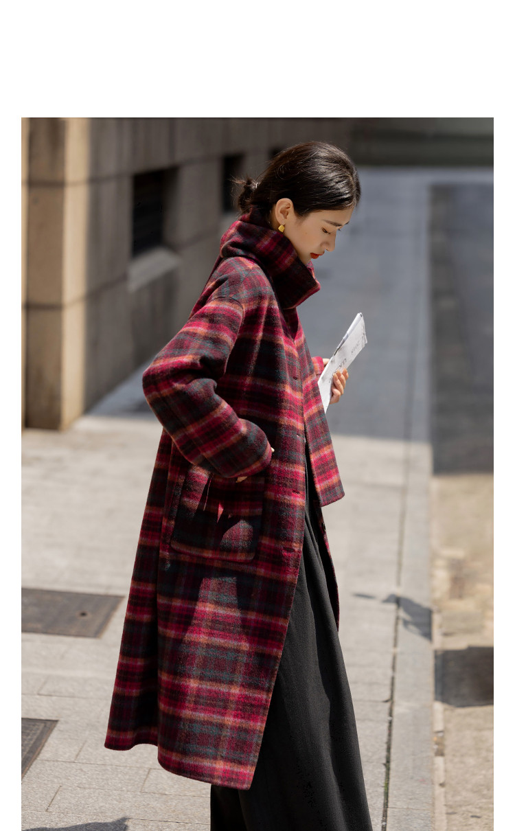 【手工双面呢】冬季摩登风骨绵羊毛混纺大衣格子流苏围巾女式外套