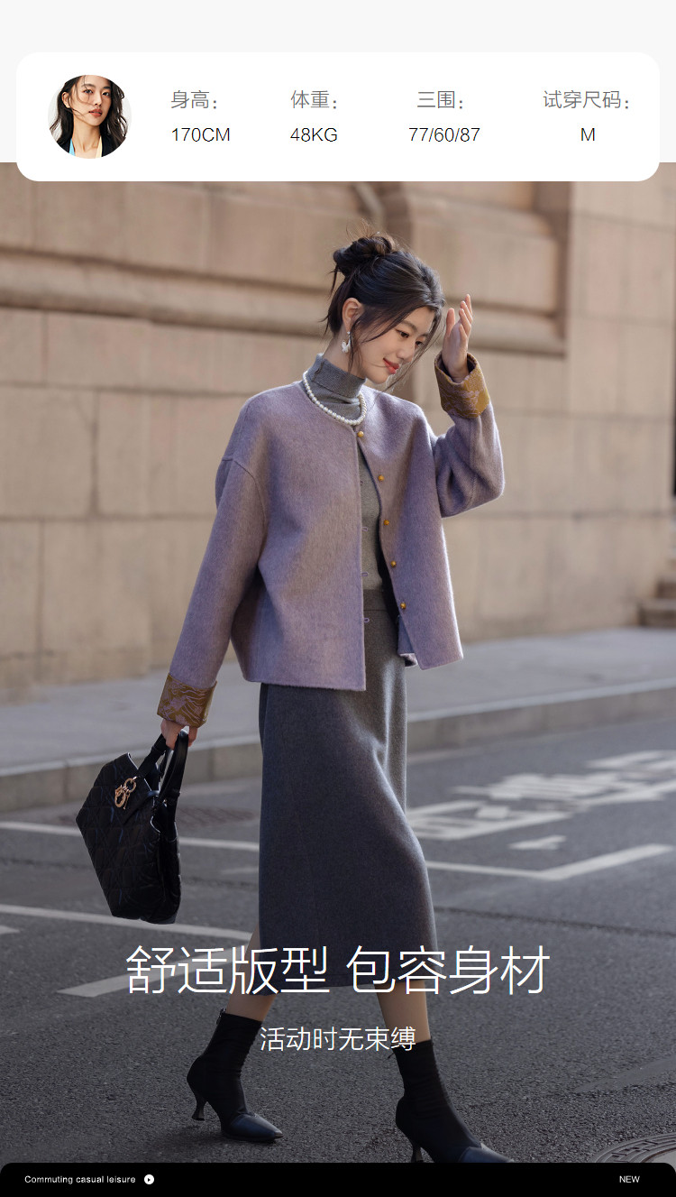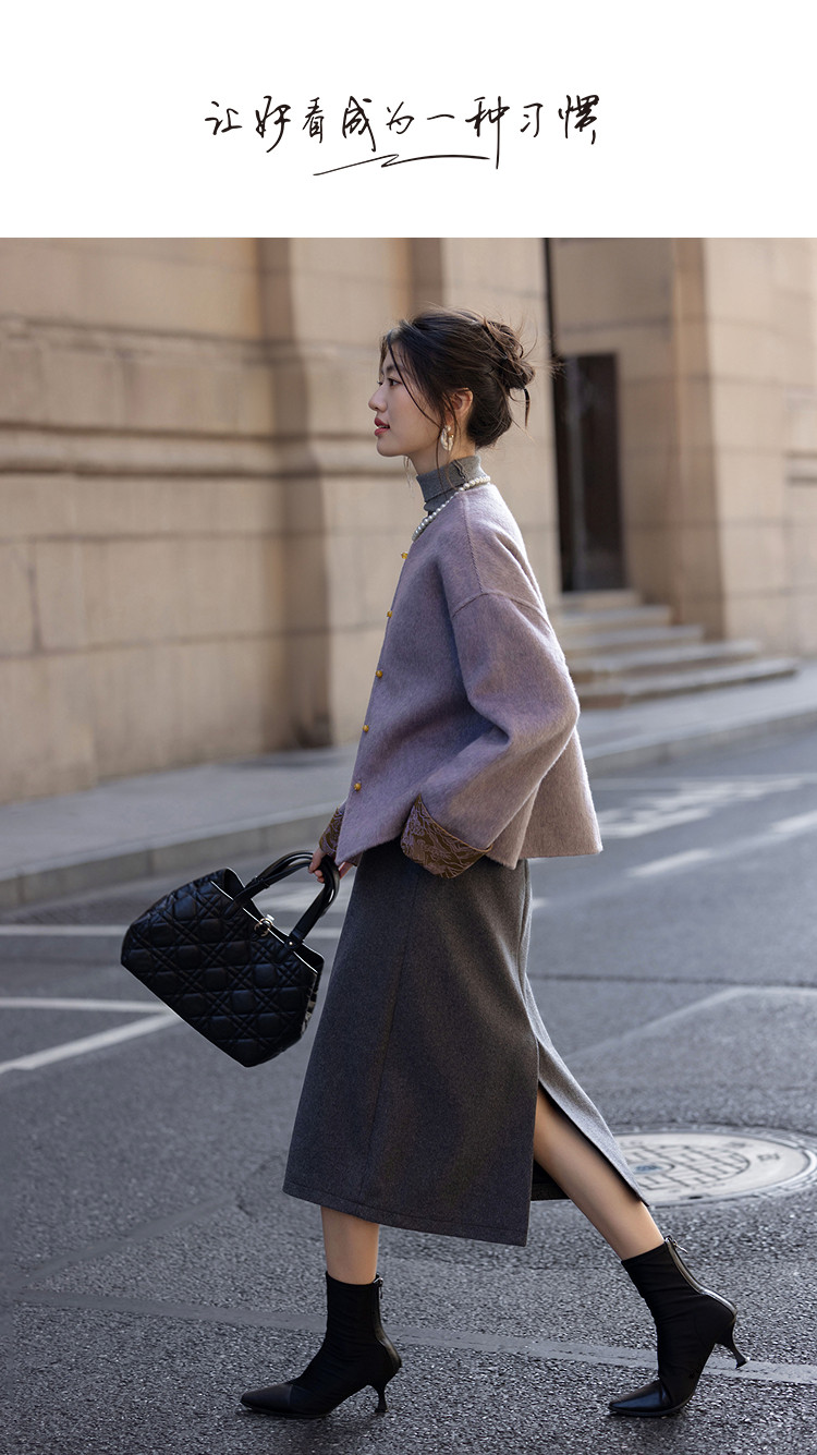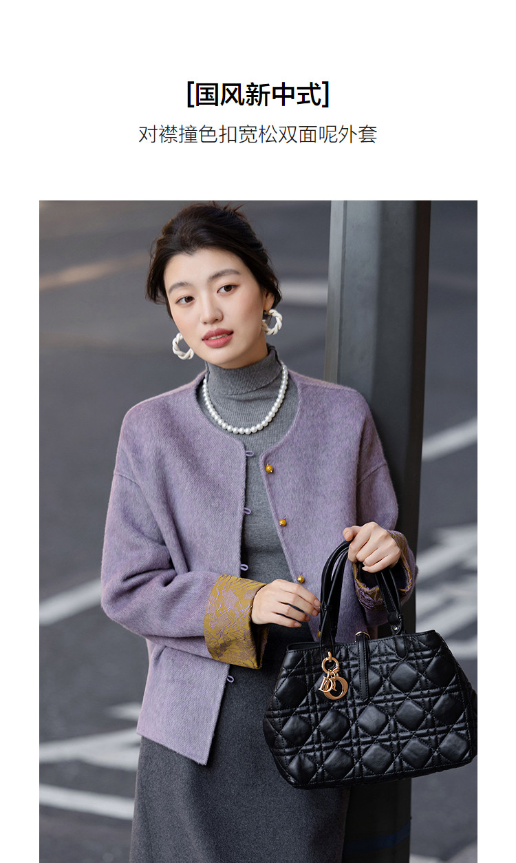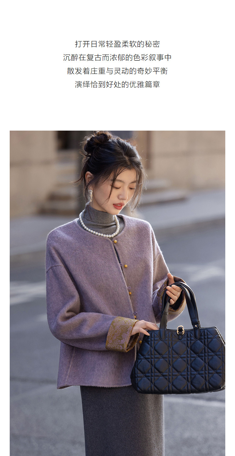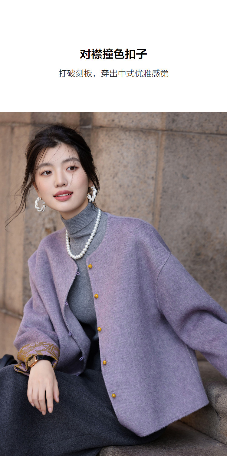 【桑蚕丝绵羊毛混纺双面呢】冬季国风新中式对襟撞色扣宽松女外套
