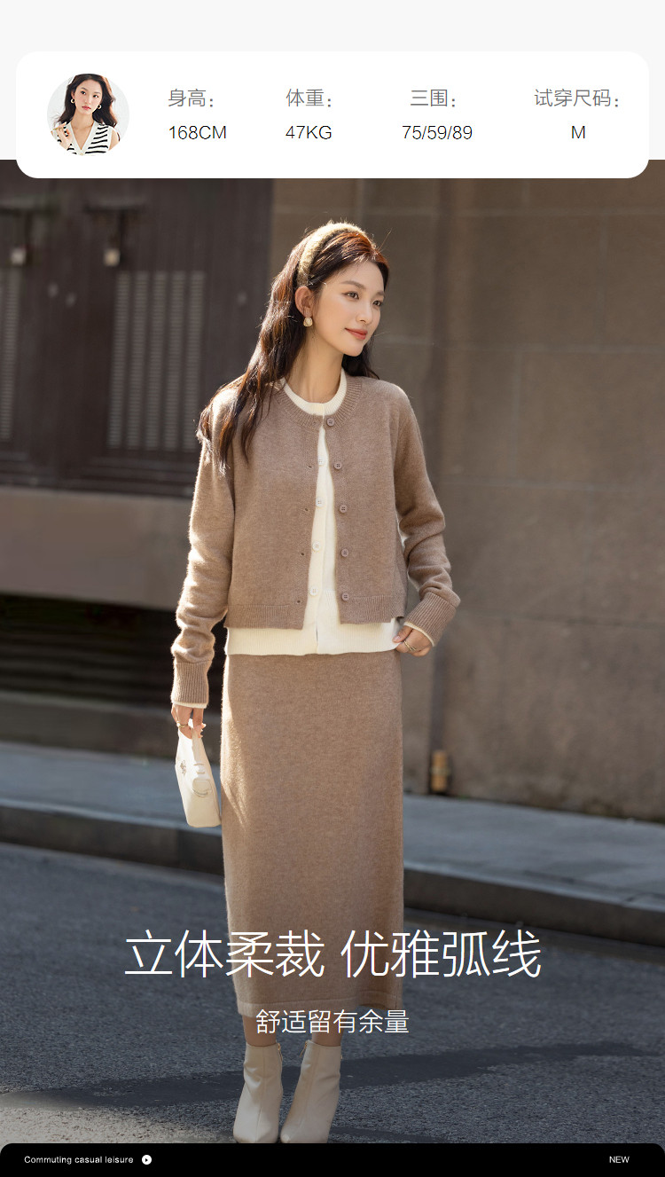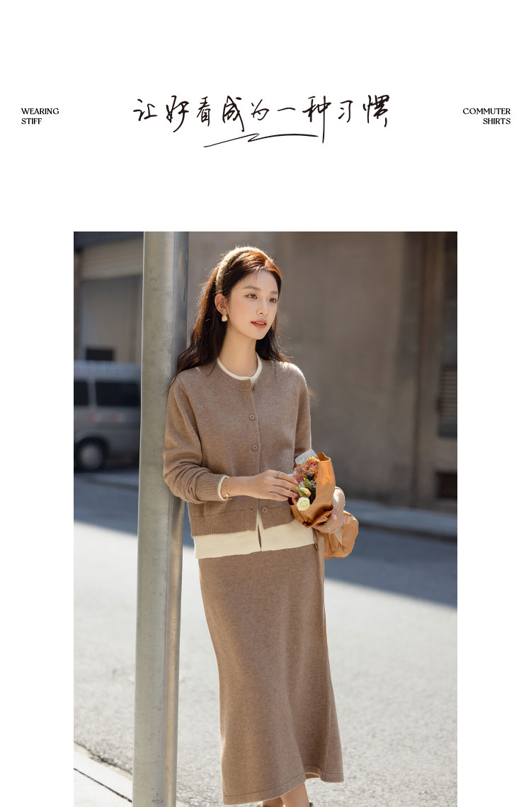 【省心通勤套装】冬季撞色圆领上衣双层门襟松紧腰直筒半裙两件套