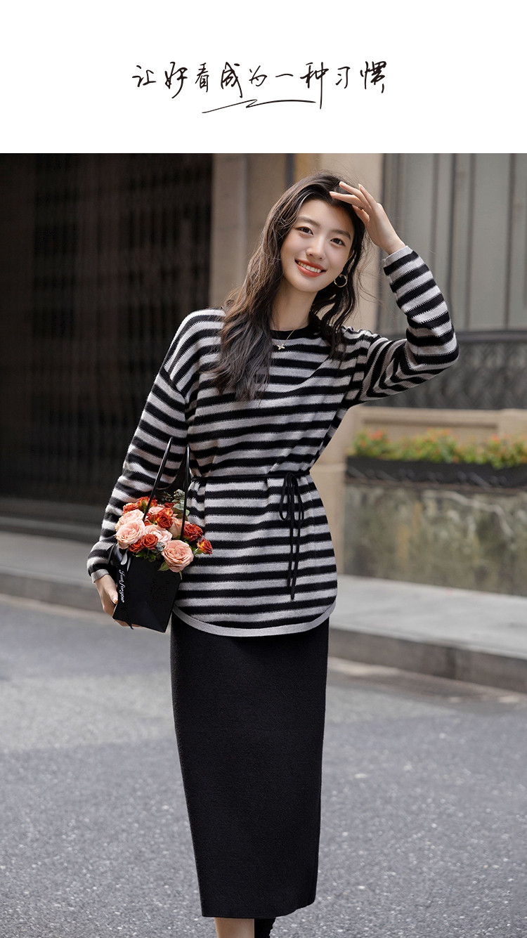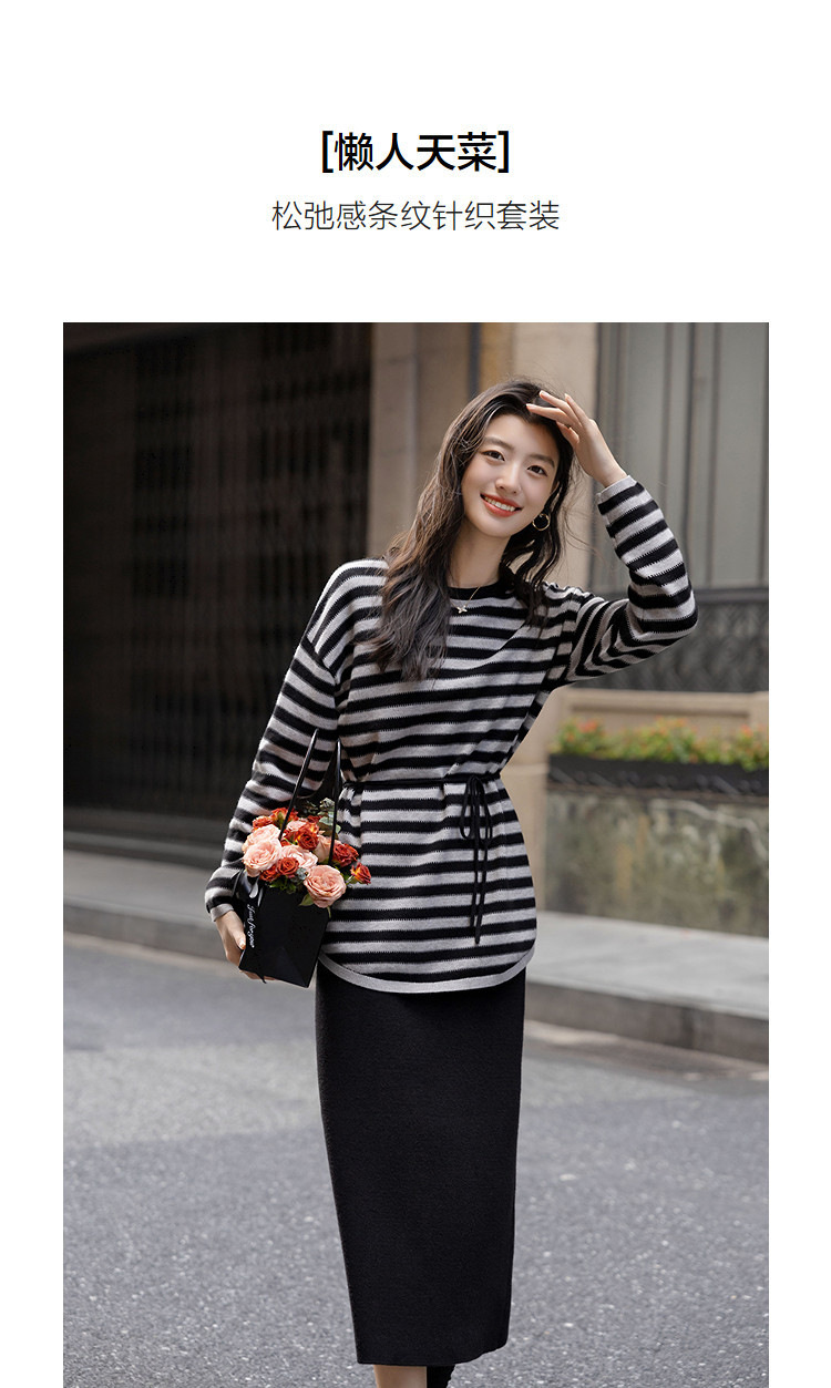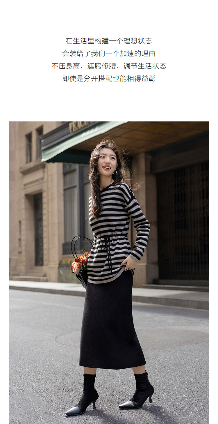 【含温润绵羊毛】冬季松弛感条纹上衣侧边抽绳开叉半裙针织女套装