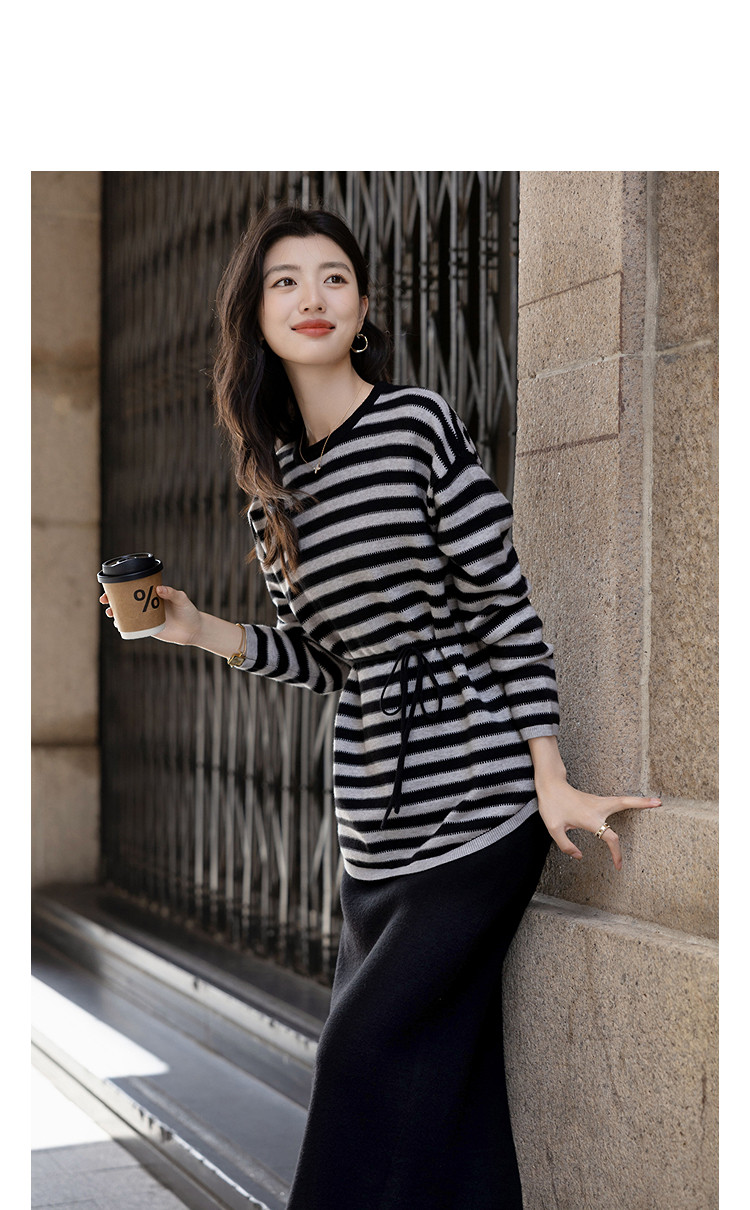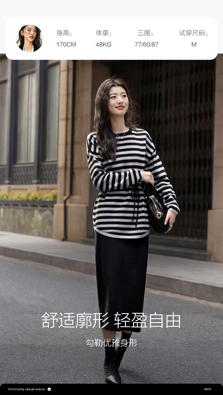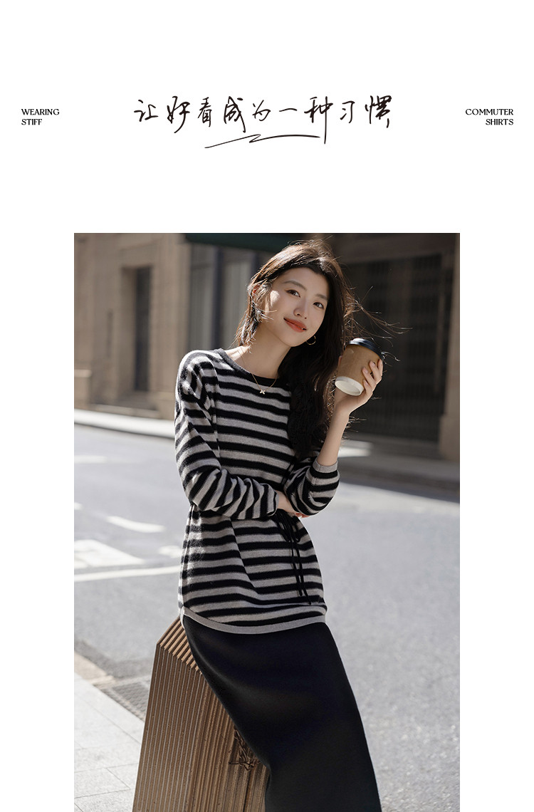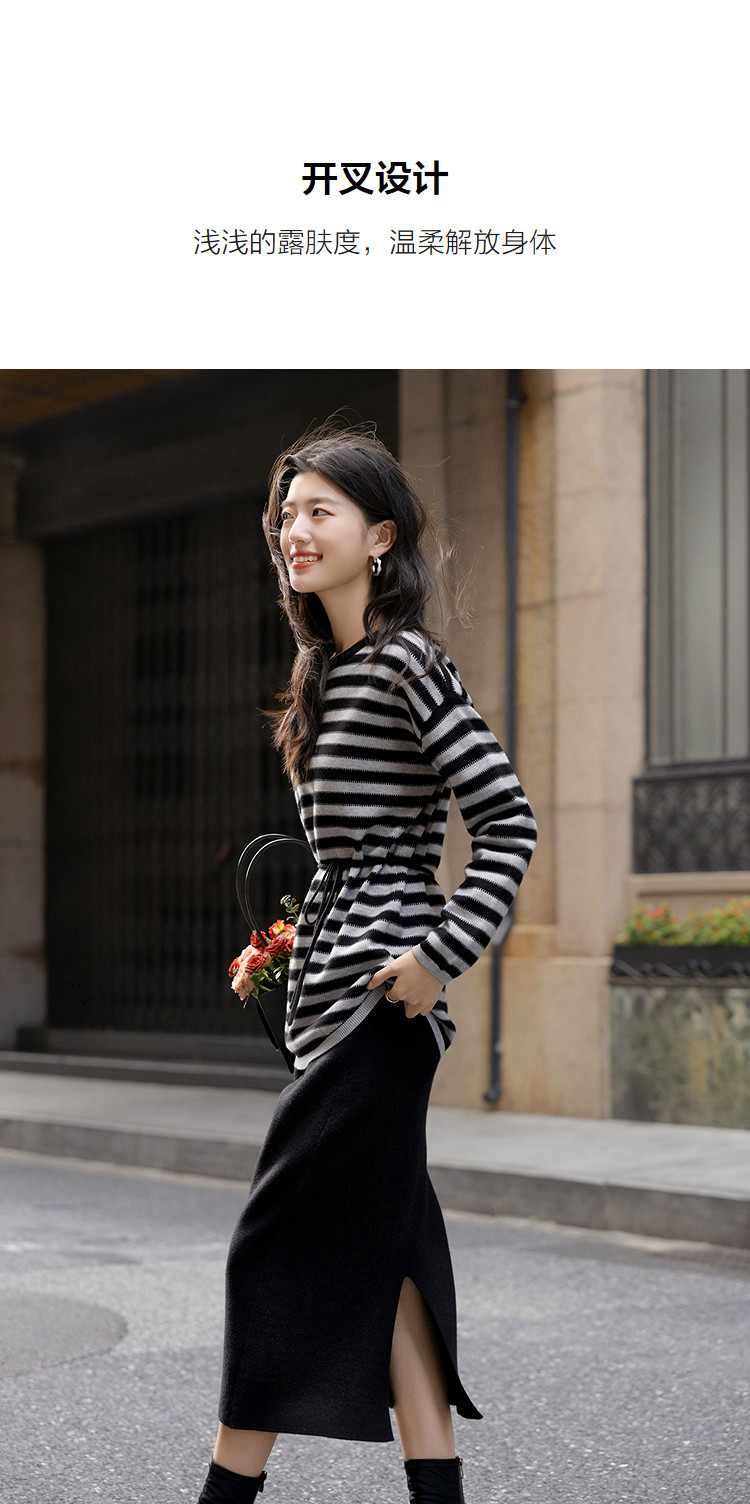 【含温润绵羊毛】冬季松弛感条纹上衣侧边抽绳开叉半裙针织女套装