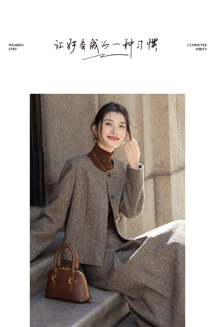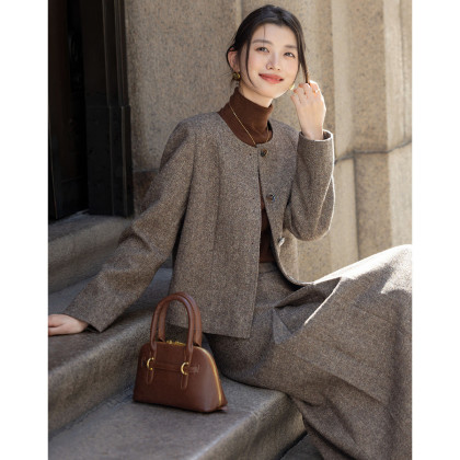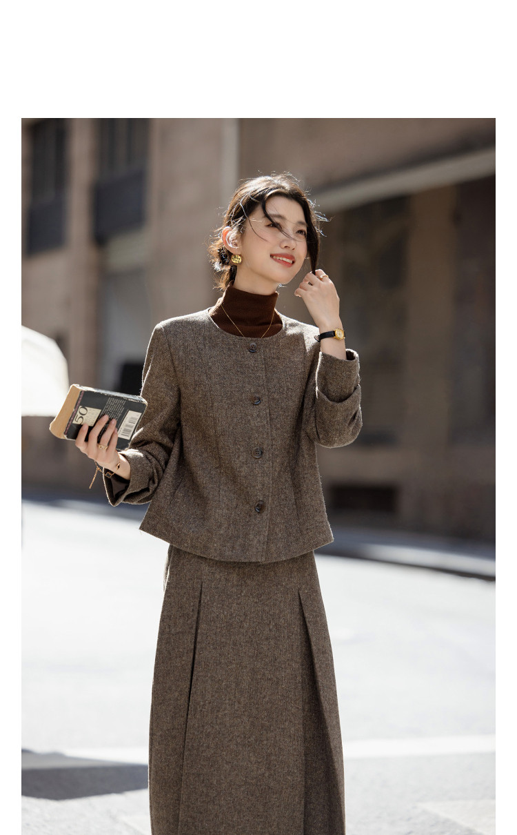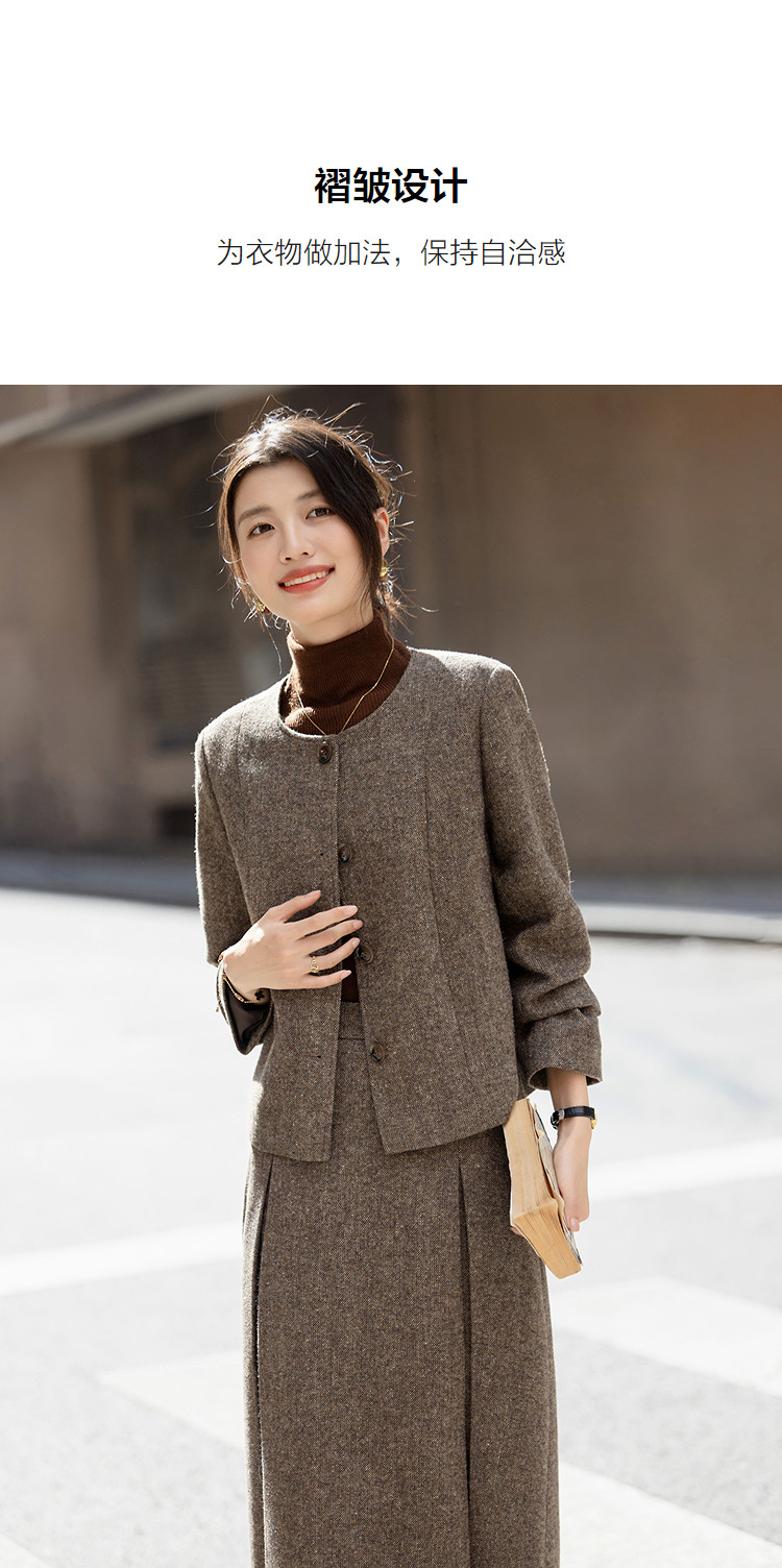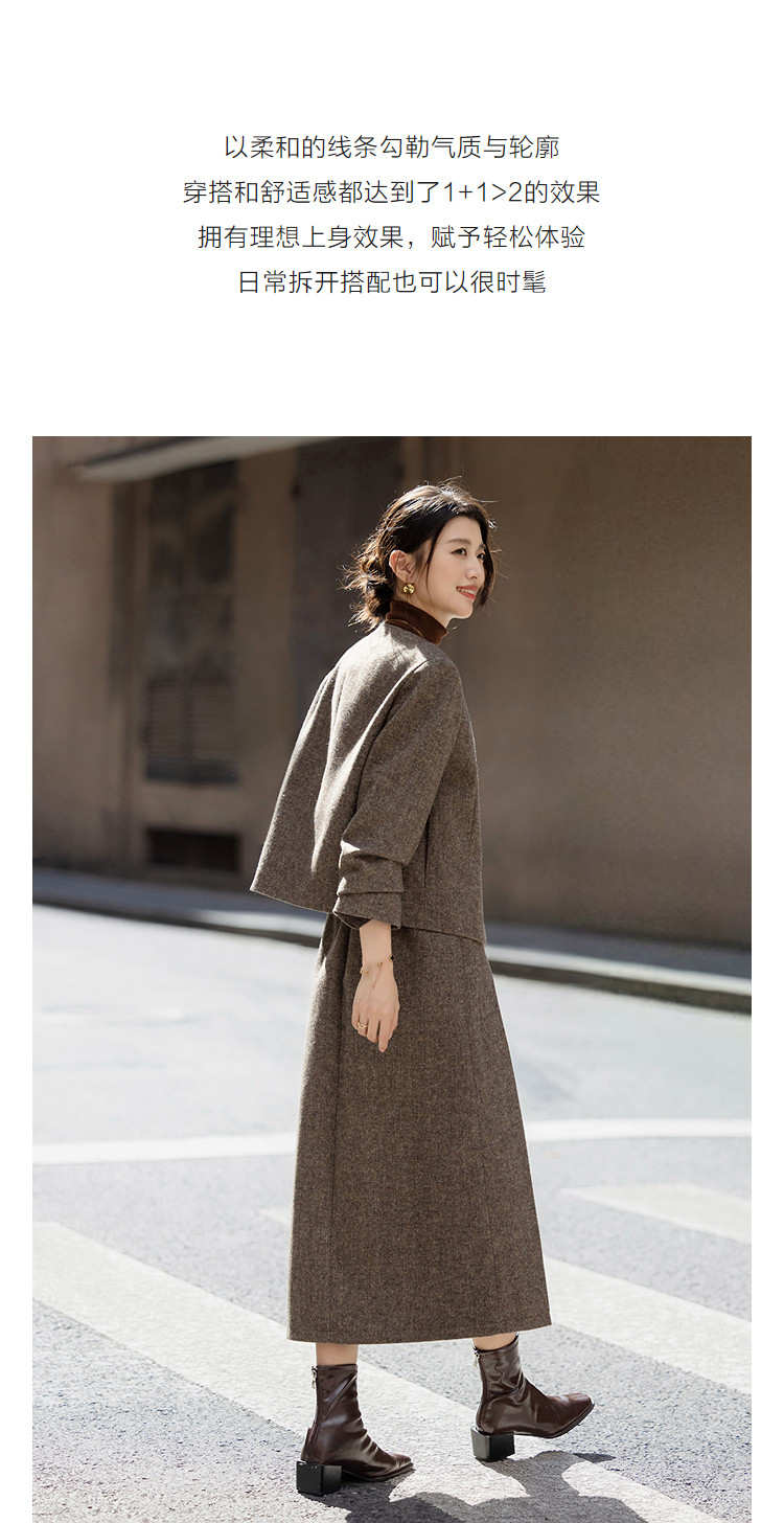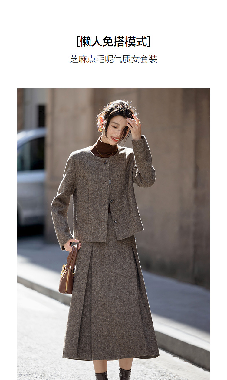 【含绵羊毛】冬季芝麻点毛呢套装圆领短上衣褶皱A字半裙女两件套