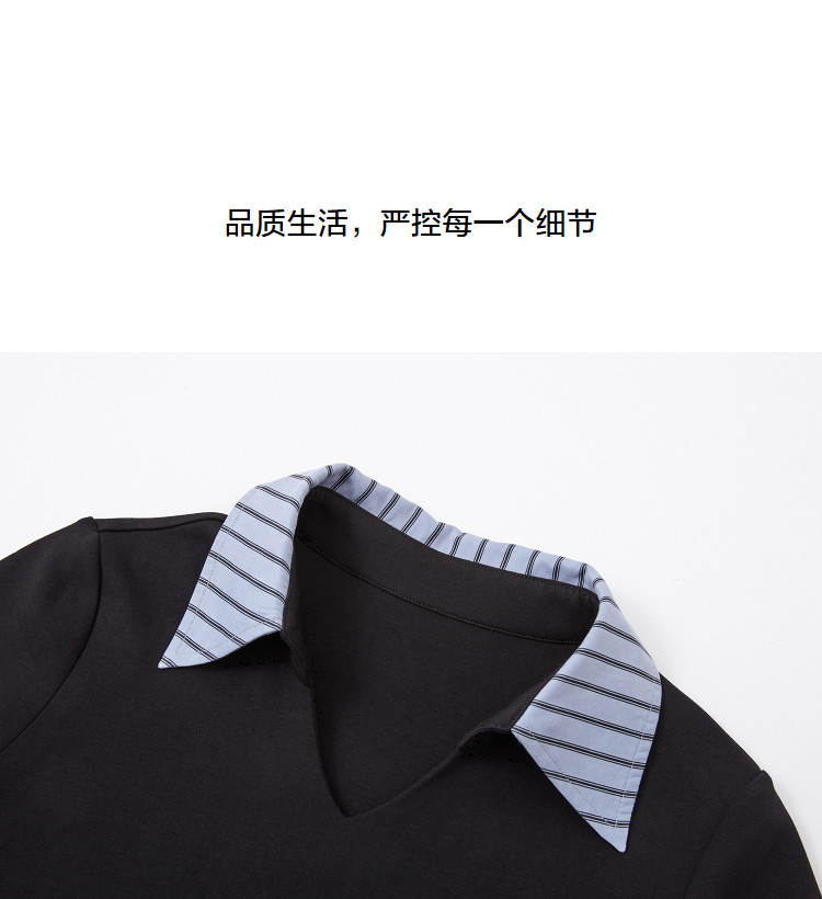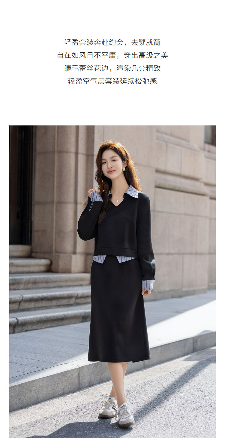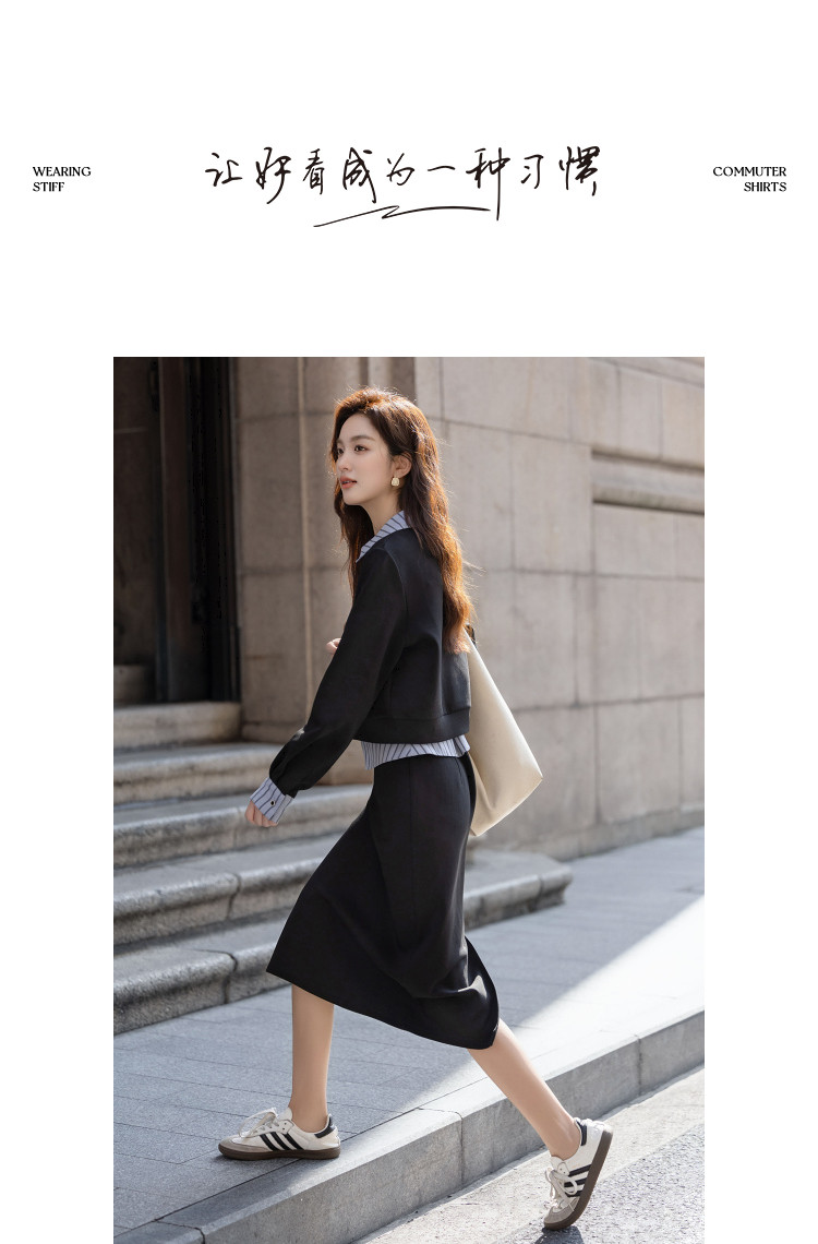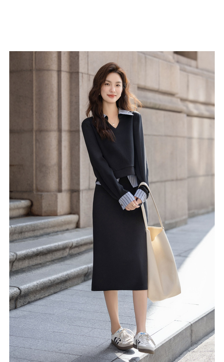 【空气层套装】秋季撞色V字条纹翻领卫衣时髦翻片半身裙女两件套