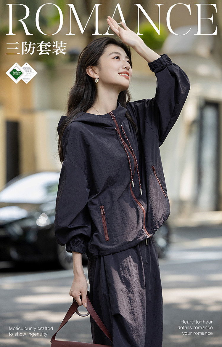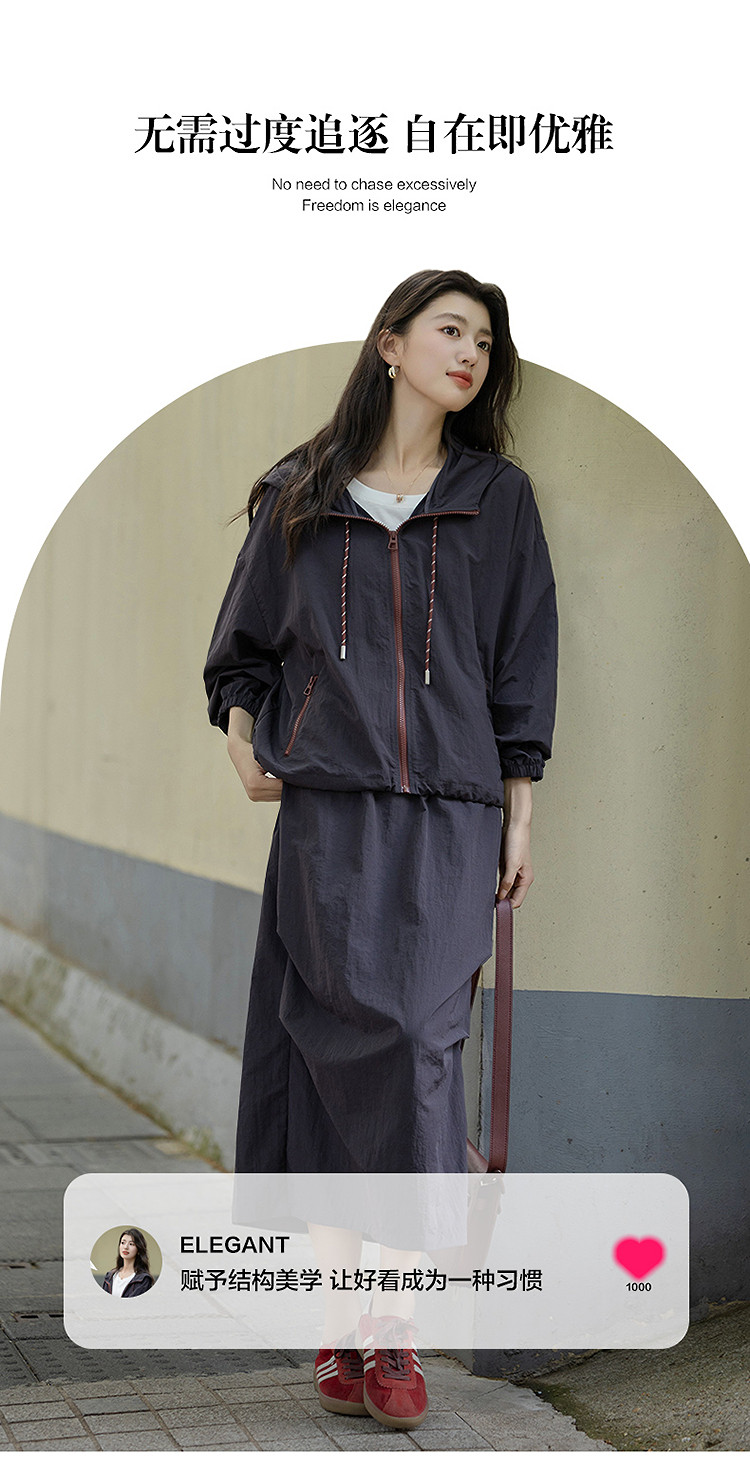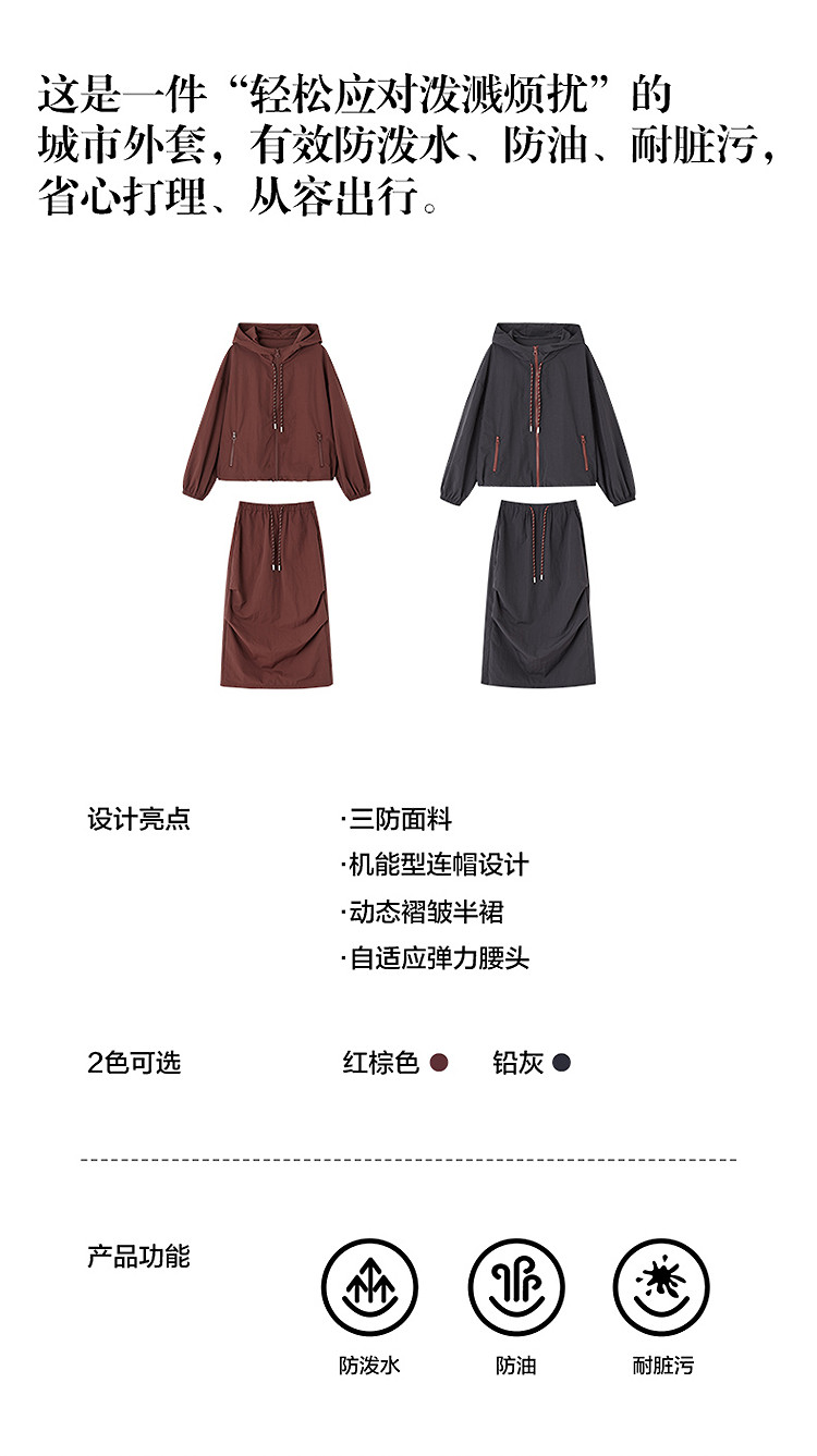 【黑科技三防】秋季运动风连帽撞色拉链上衣松紧腰半裙套装两件套