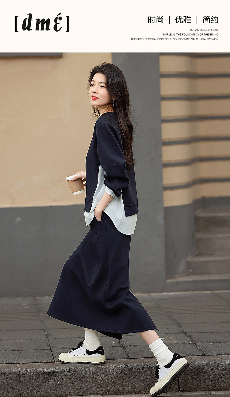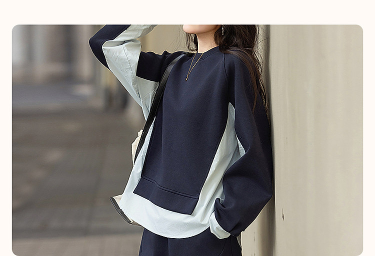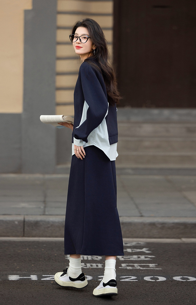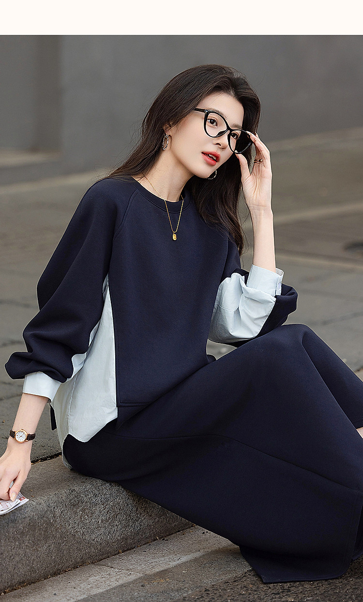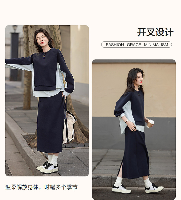 【350G空气层套装】春秋时髦拼色卫衣橡筋腰开叉半裙女两件套