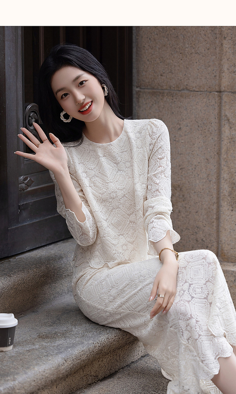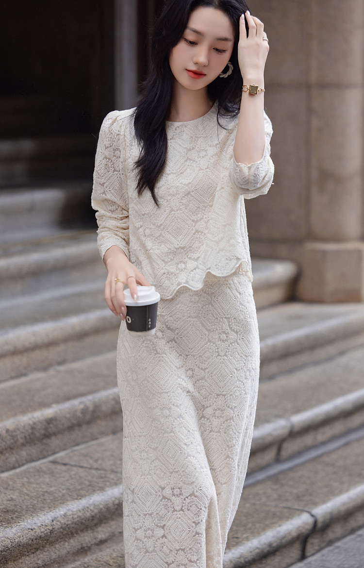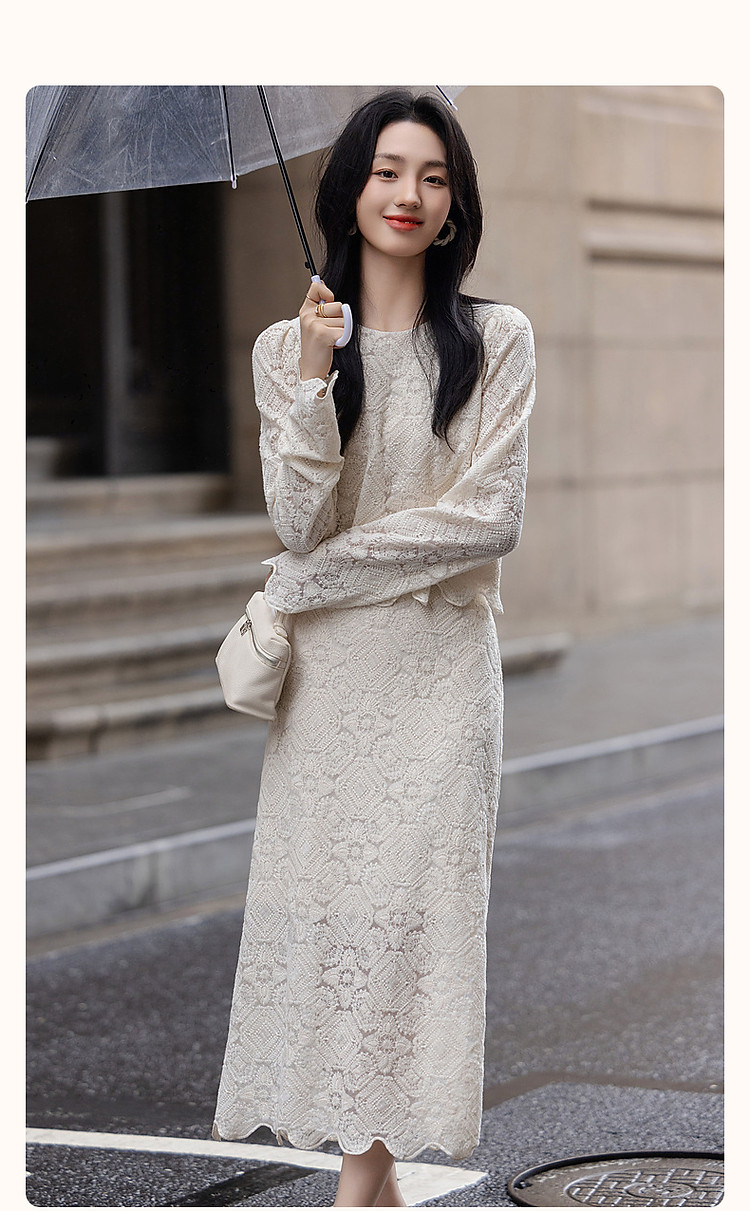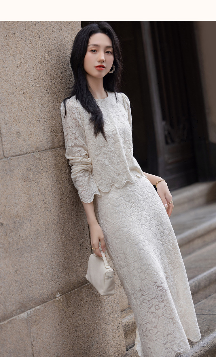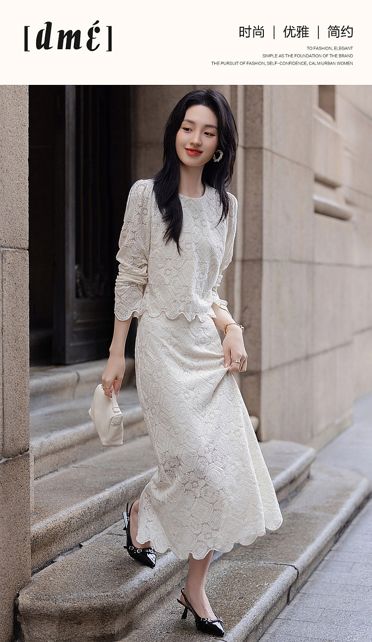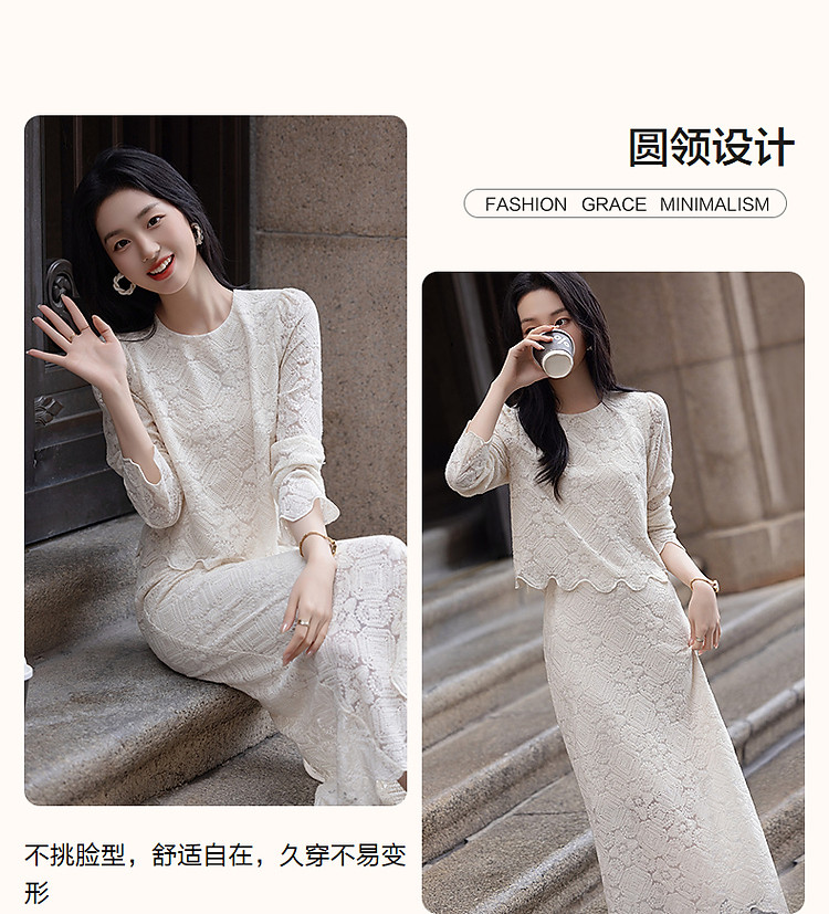 【法式淑女蕾丝套装】秋名媛风通勤圆领短款上衣开叉半身裙两件套
