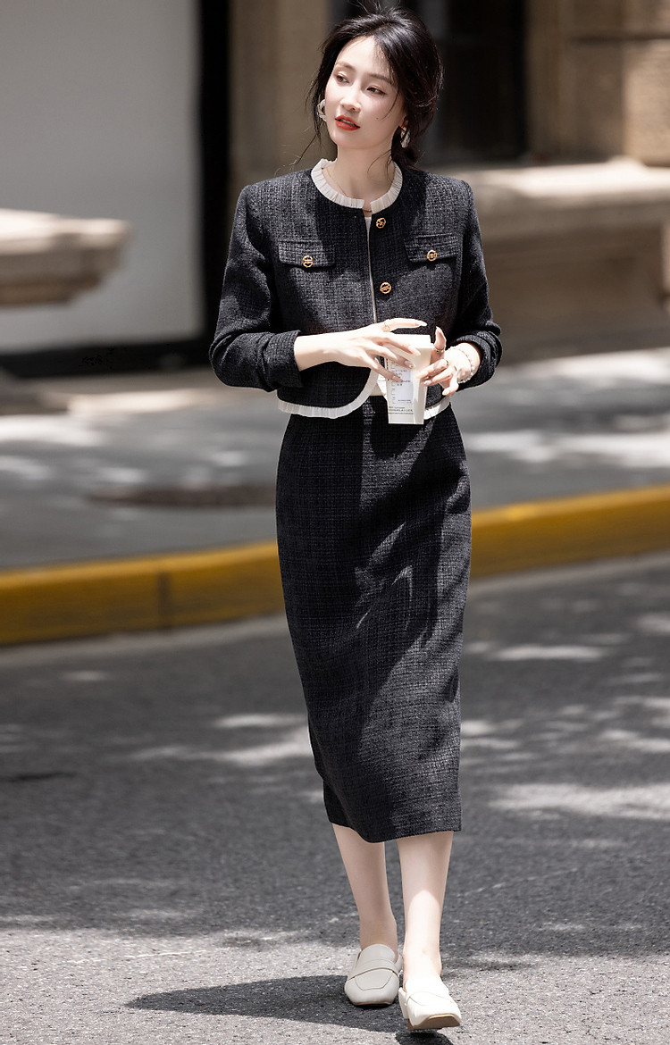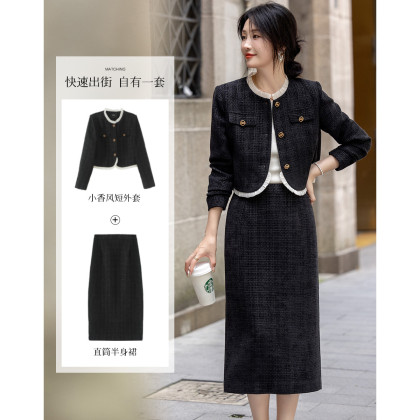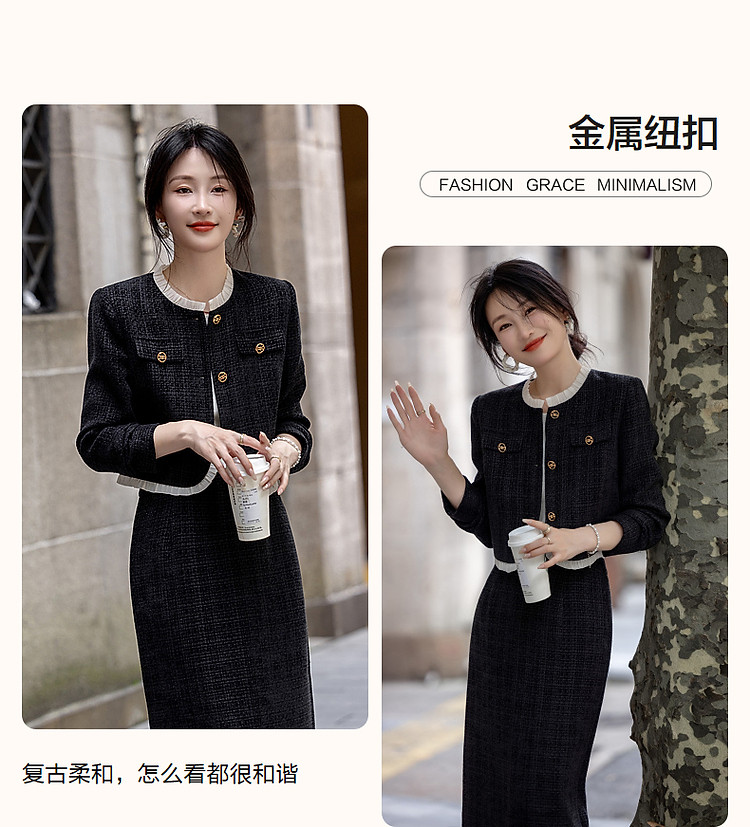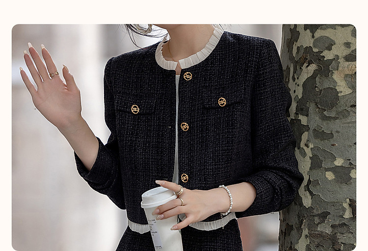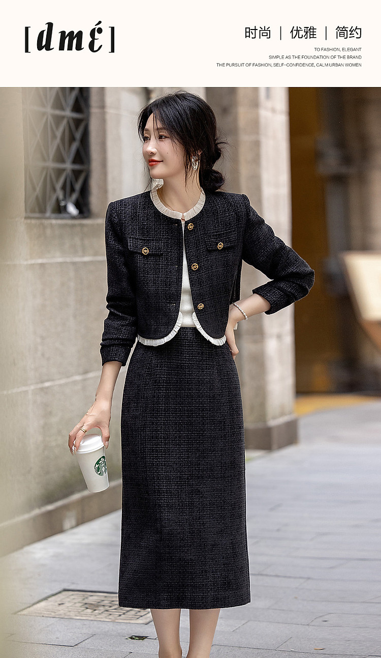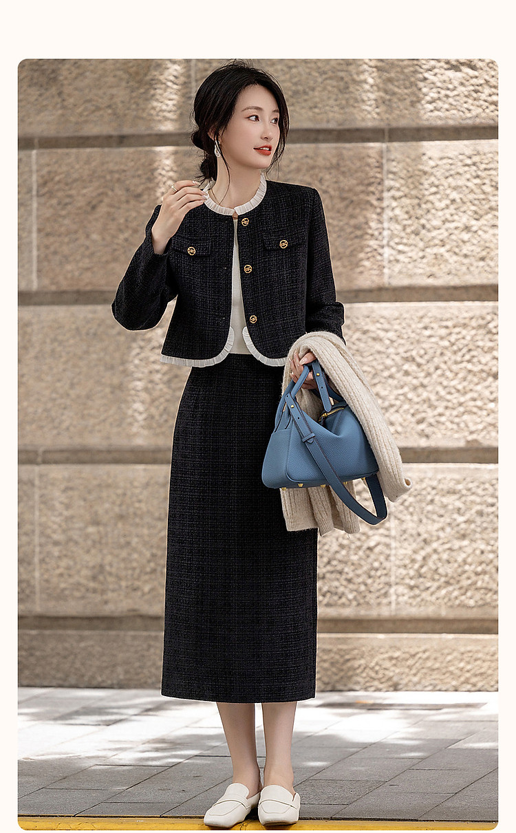 【富家千金套装】秋冬小香风木耳边上衣藏肉半裙小个子女式两件套