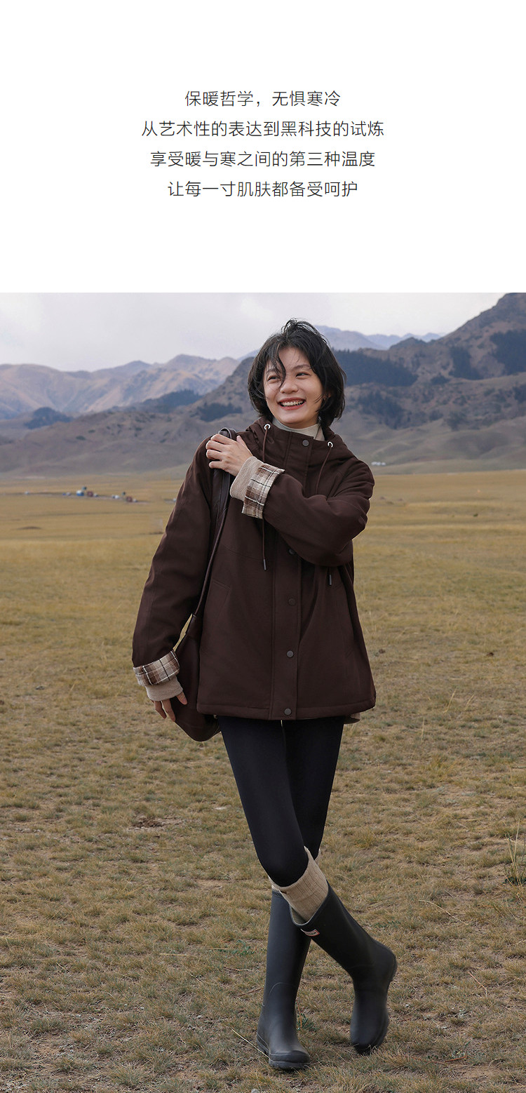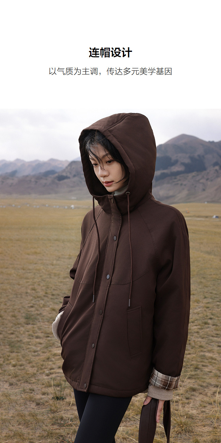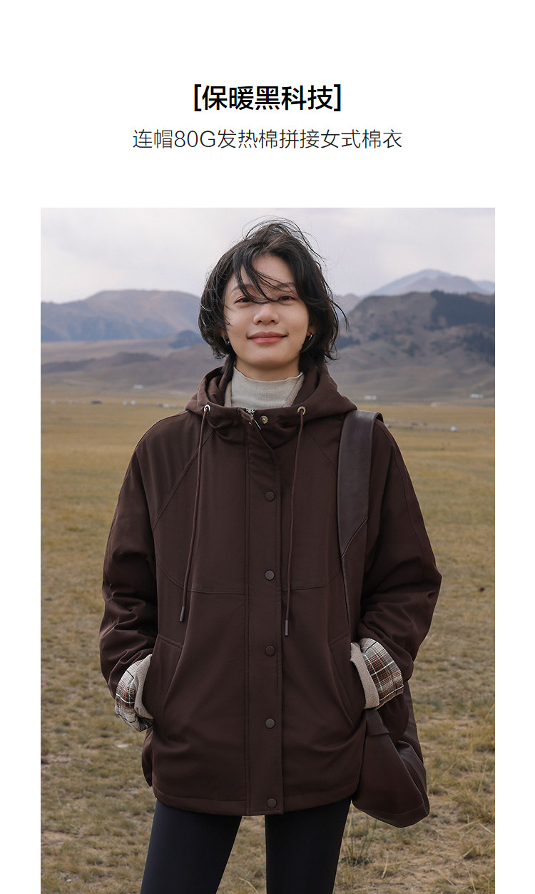 【发热棉】冬季保暖黑科技抽绳连帽拼接厚口袋气质小火炉女式棉衣