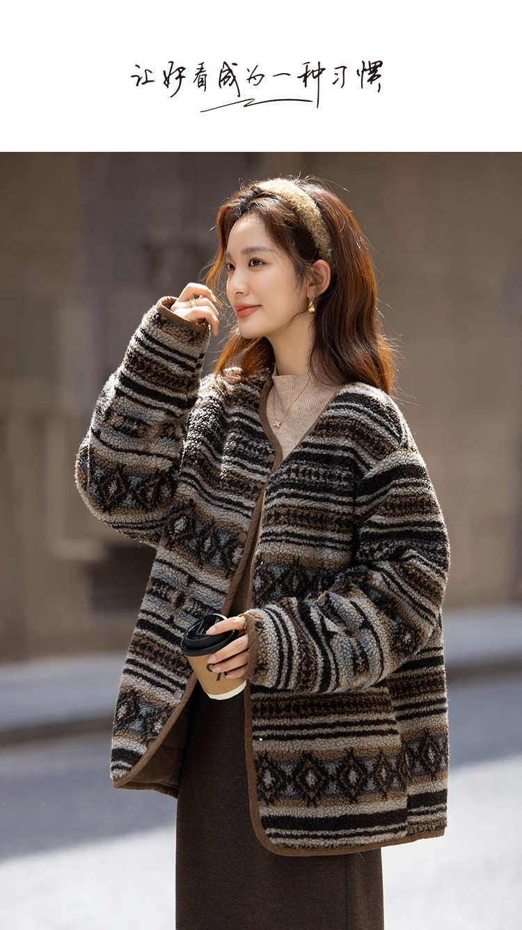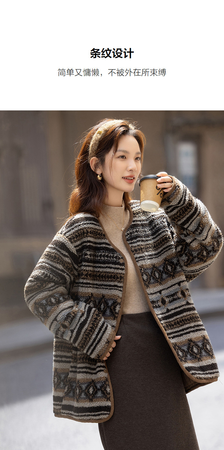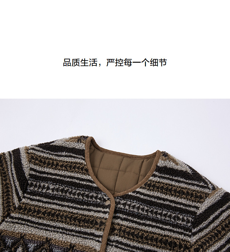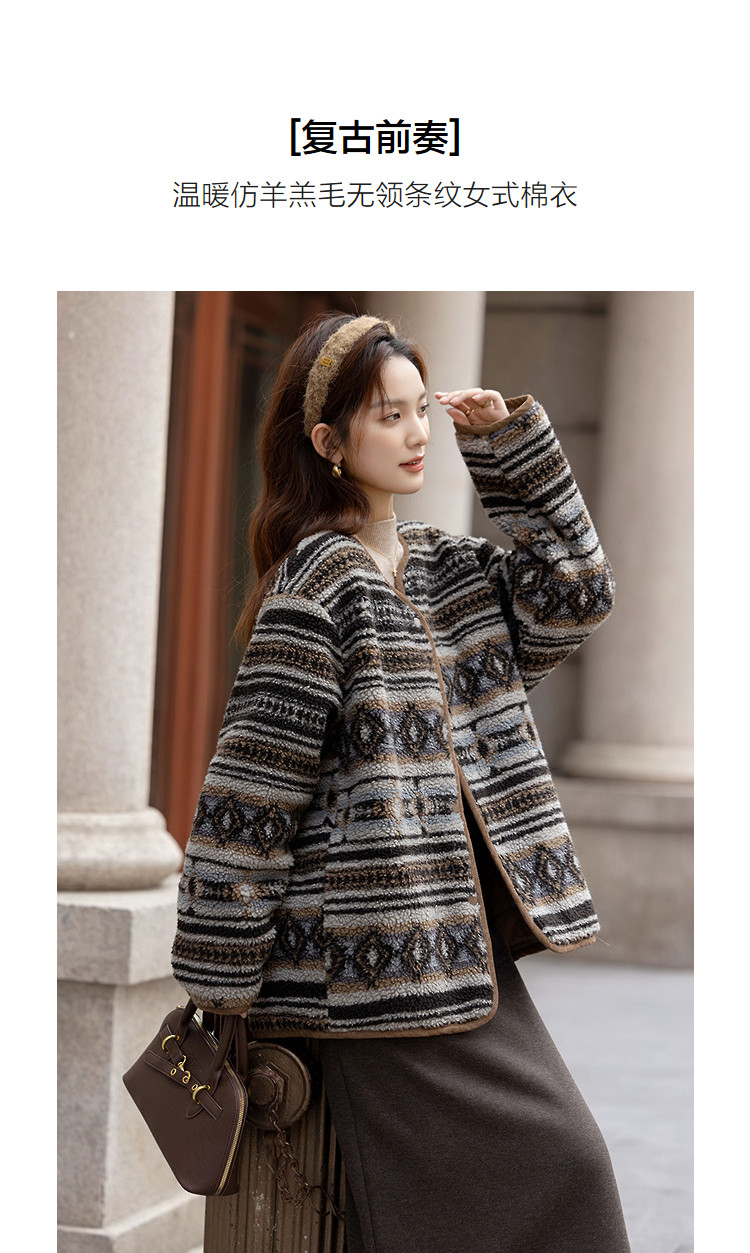 【复古前奏】冬季保暖仿羊羔毛无领条纹几何棉衣圆领宽松女式棉服