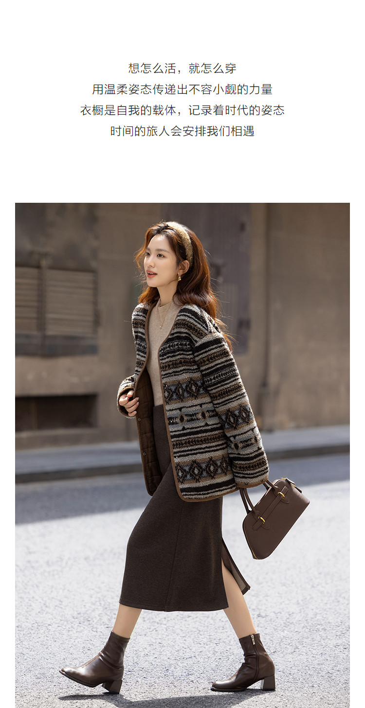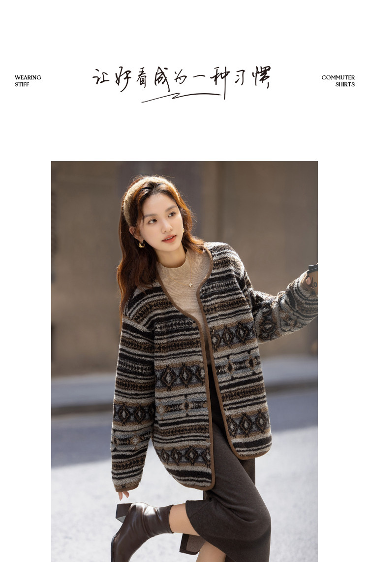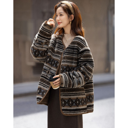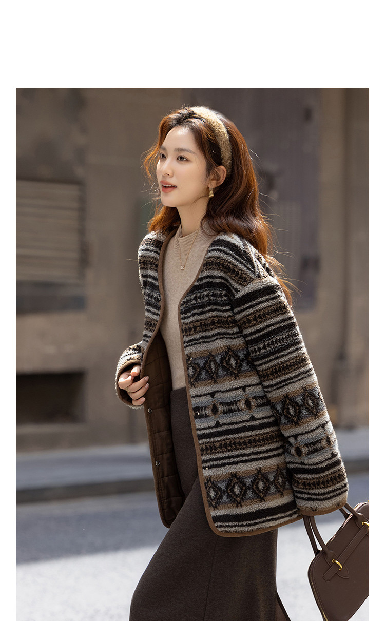 【复古前奏】冬季保暖仿羊羔毛无领条纹几何棉衣圆领宽松女式棉服