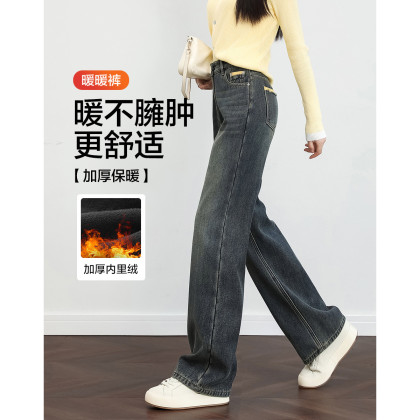 【暖暖舒芙绒】冬季呼吸云感棉薄绒长裤磨白藏肉大长腿女式牛仔裤