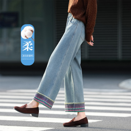 【大长腿get】秋简约舒适棉直筒藏肉复古磨白脚口印花牛仔裤女