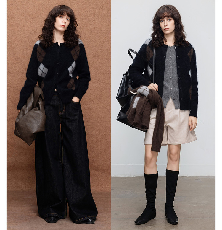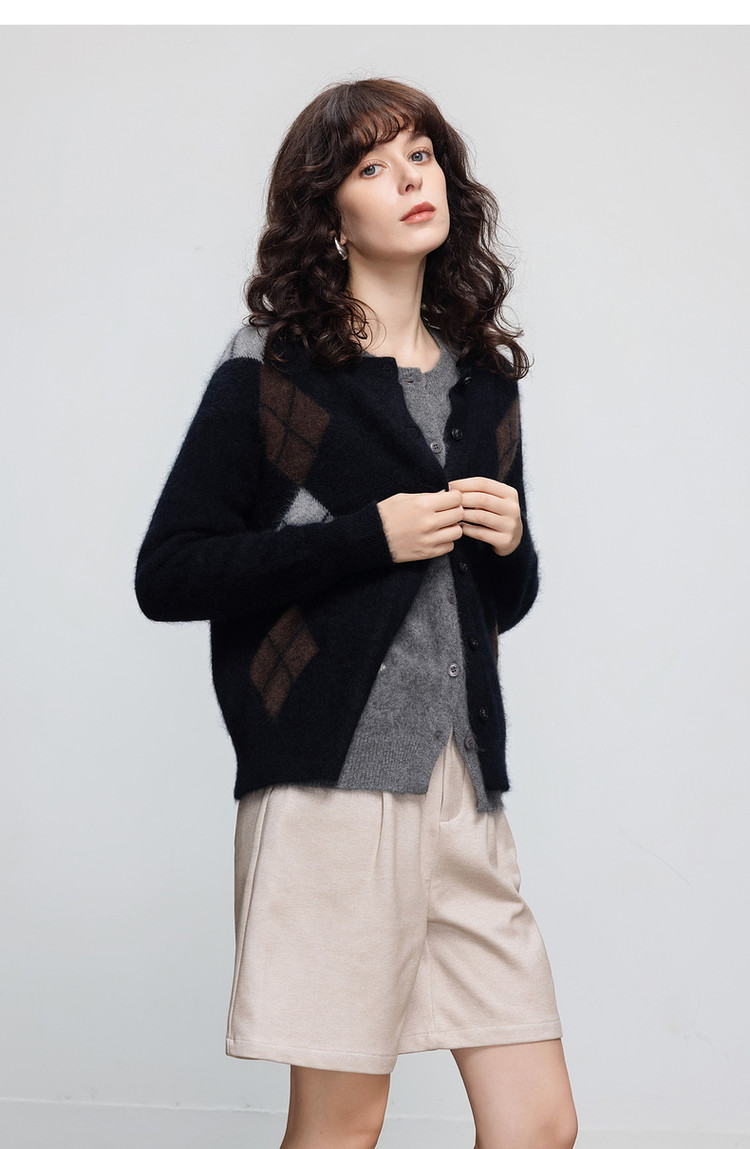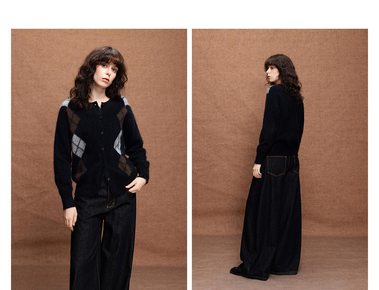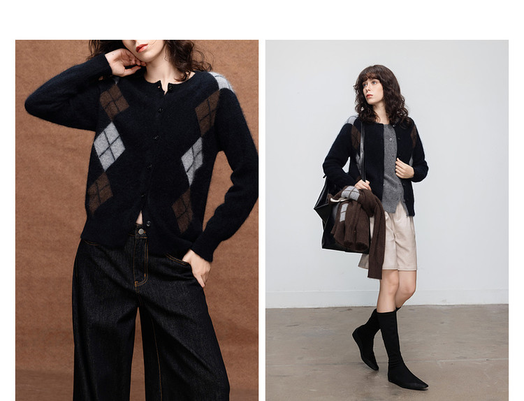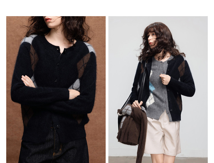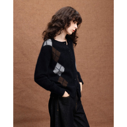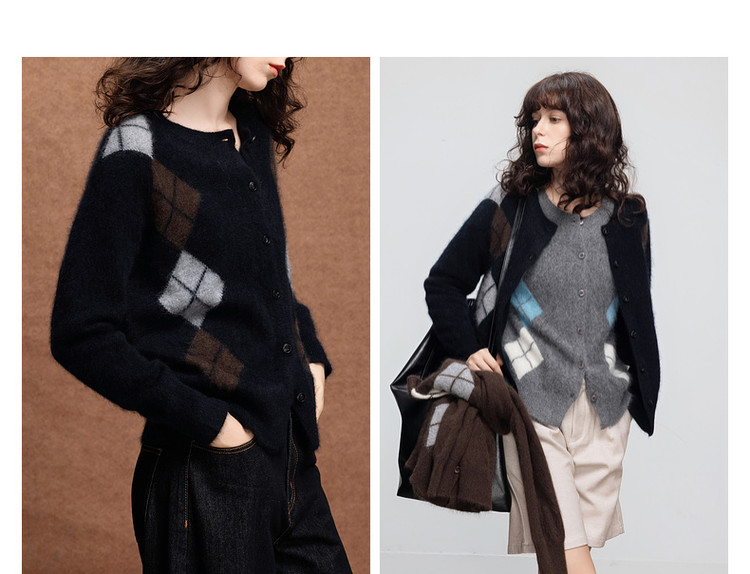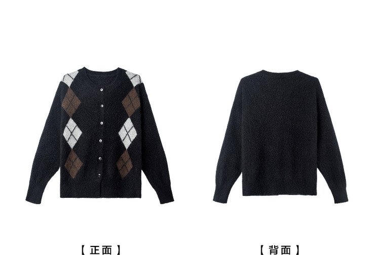 德玛纳复古绵羊毛菱格纹开衫女冬季绒感圆领舒适针织衫上衣