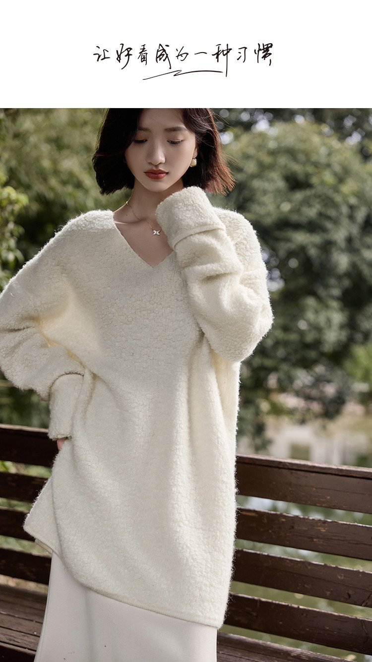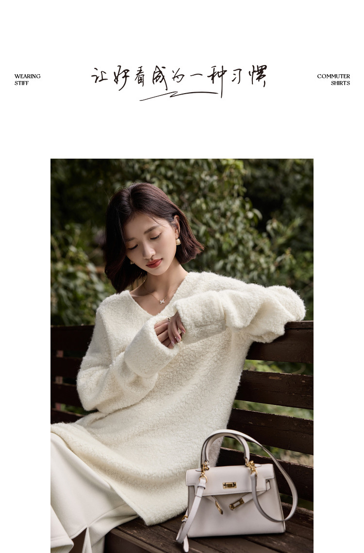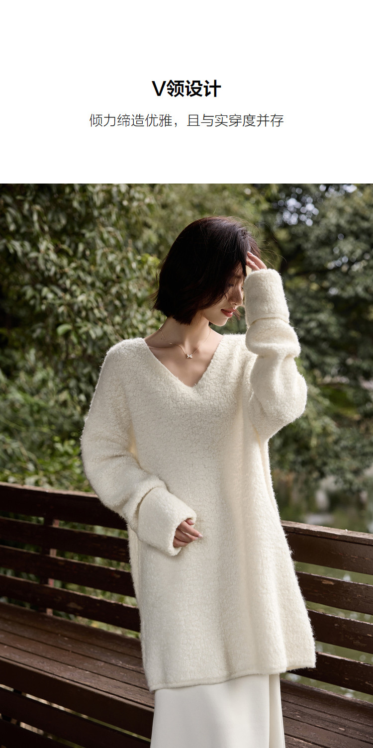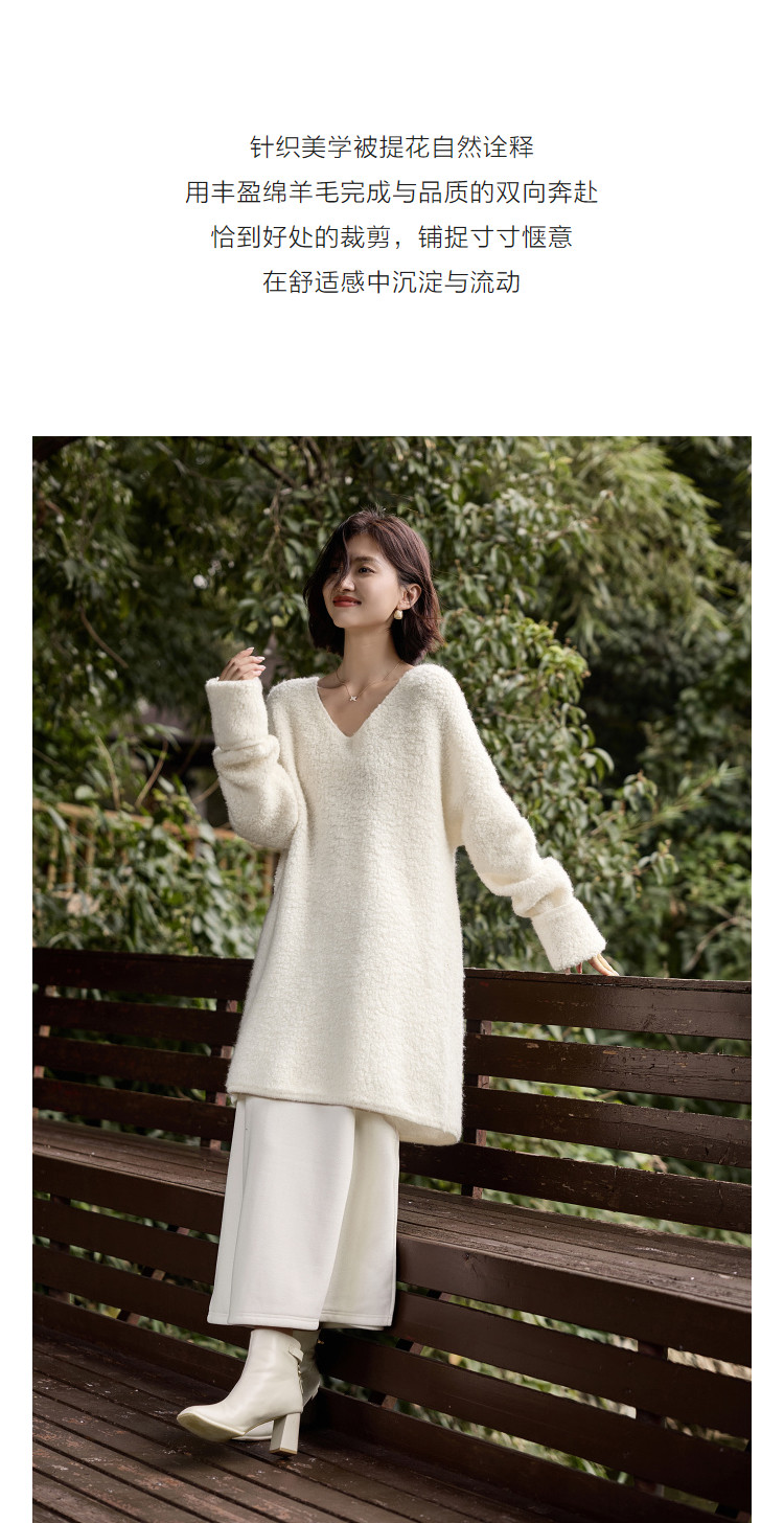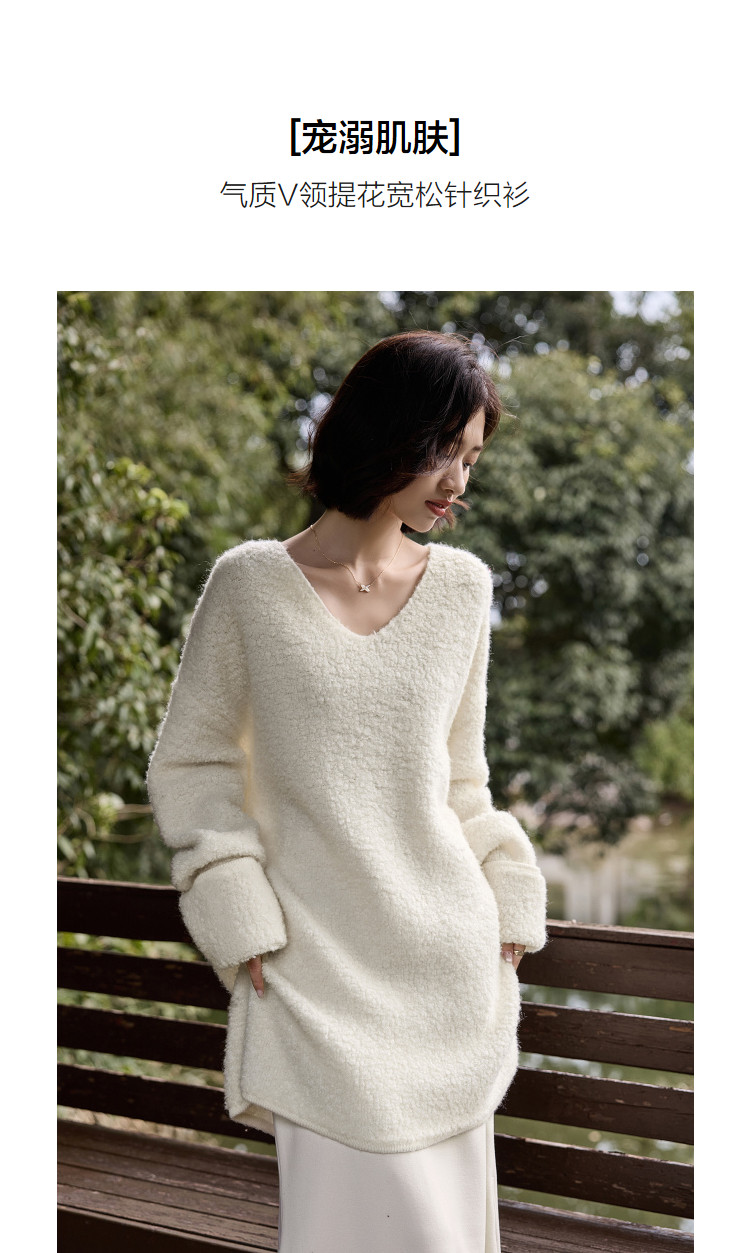 【100绵羊毛】冬季气质V领提花线衫翻边袖宽松针织衫女上衣