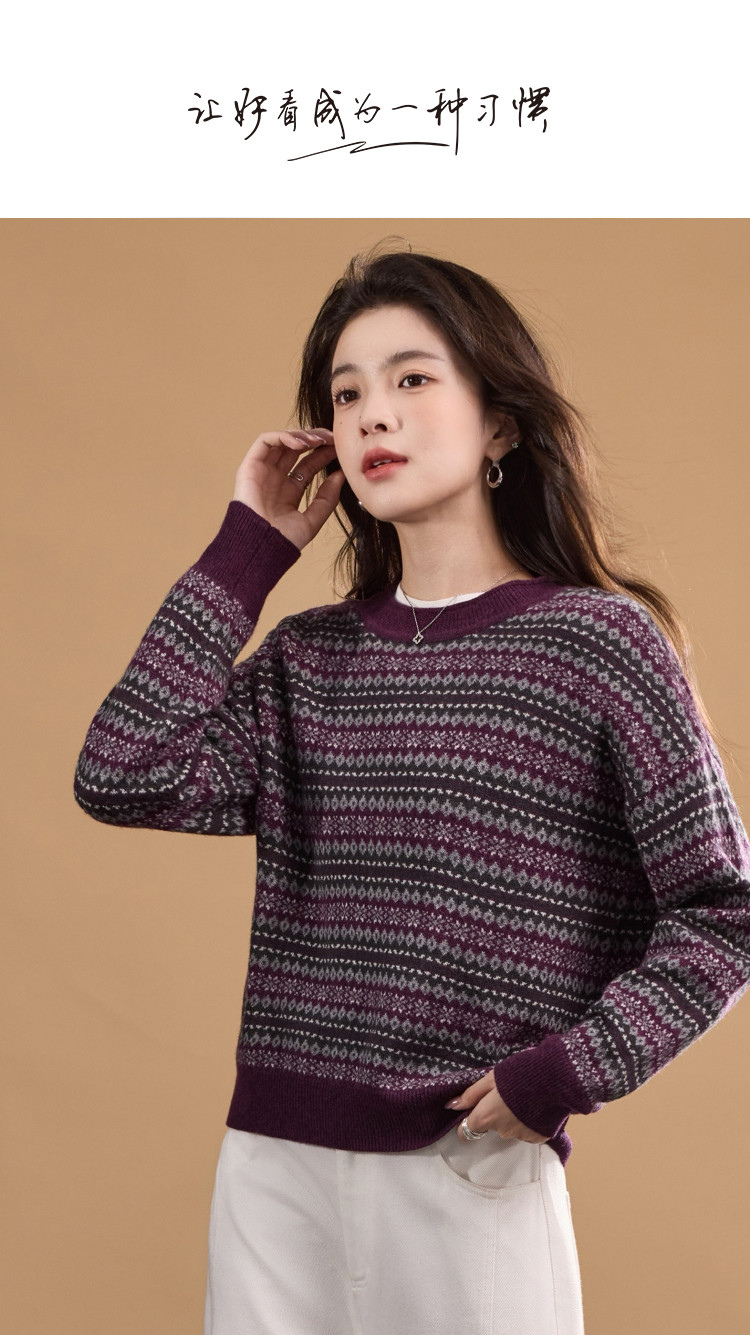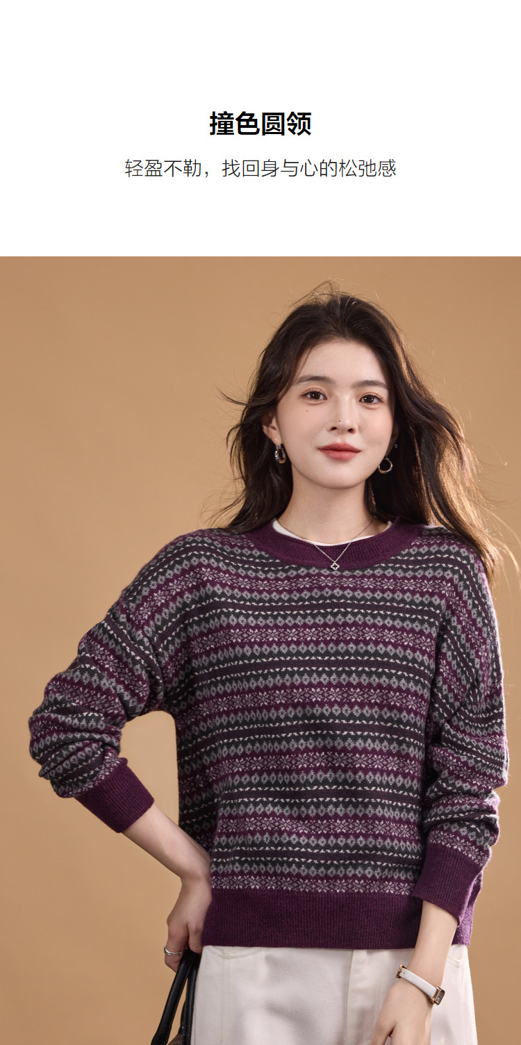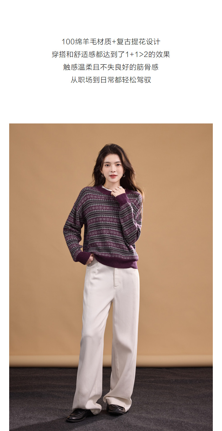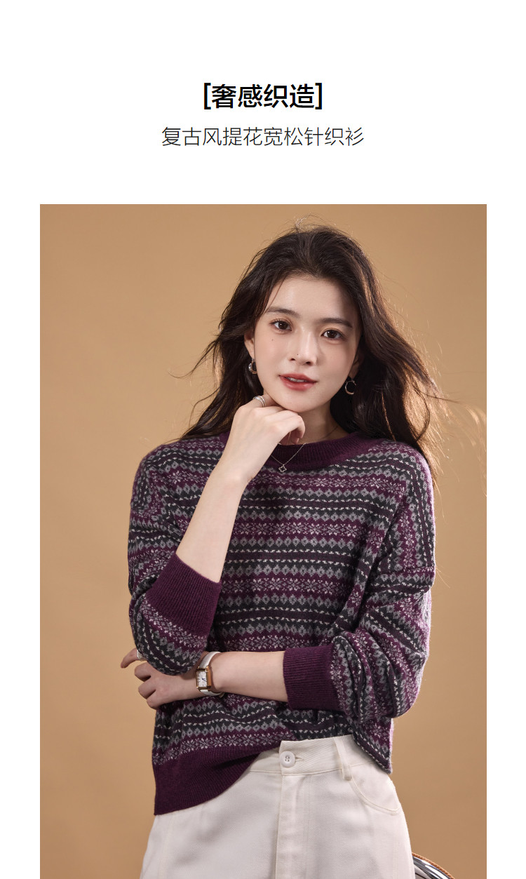 【奢感100绵羊毛】冬季复古提花线衫撞色圆领宽松针织衫女上衣
