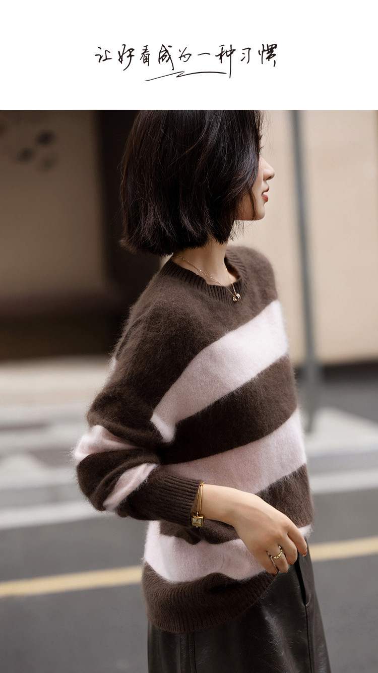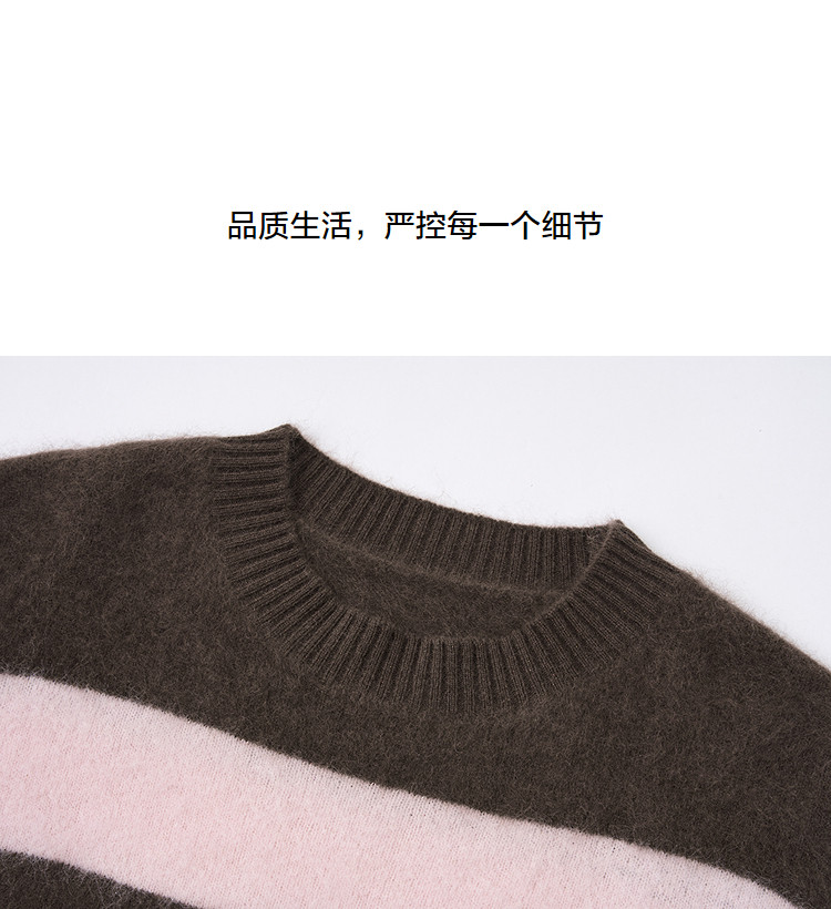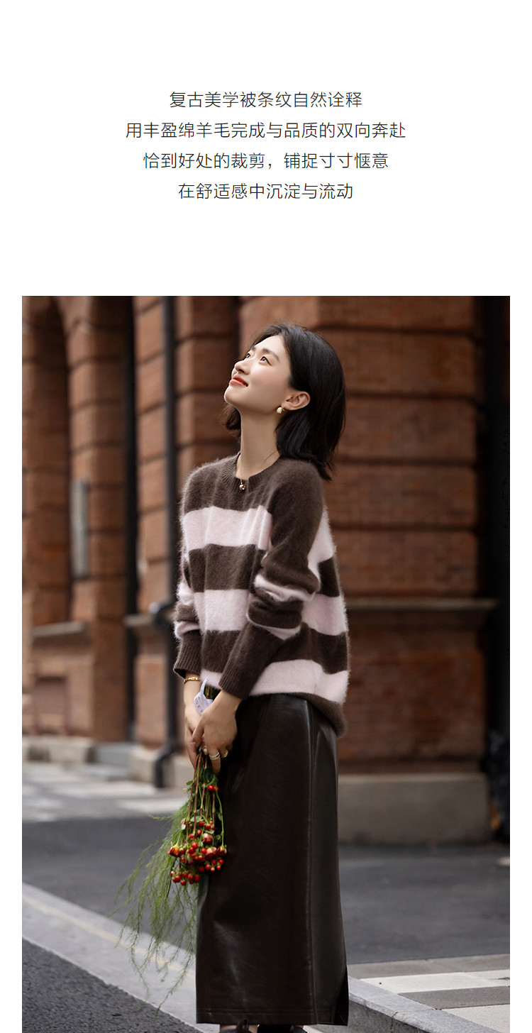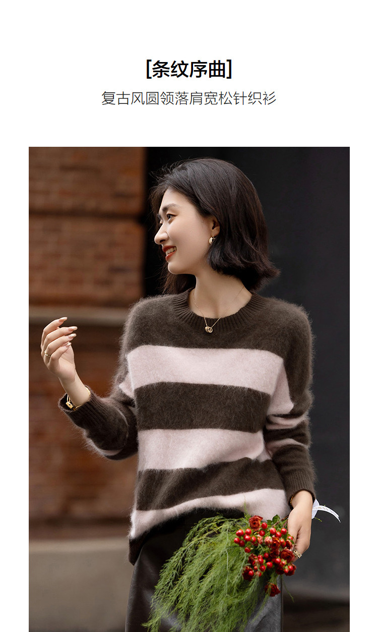【100绵羊毛】冬季复古风圆领撞色条纹落肩宽松针织衫女上衣