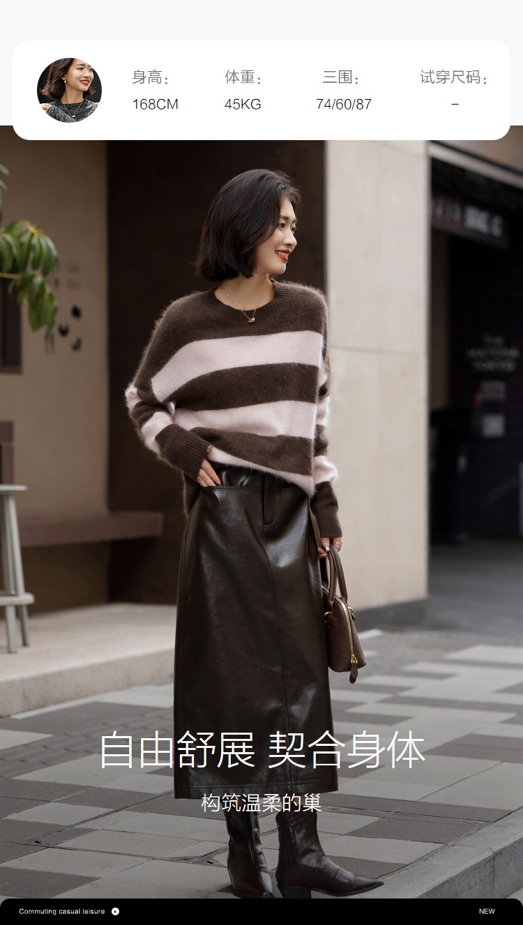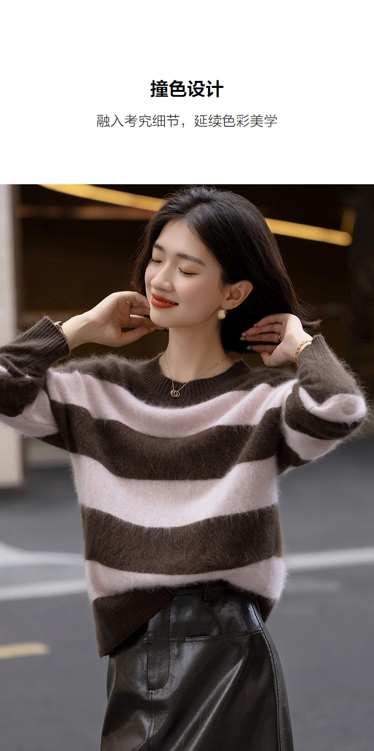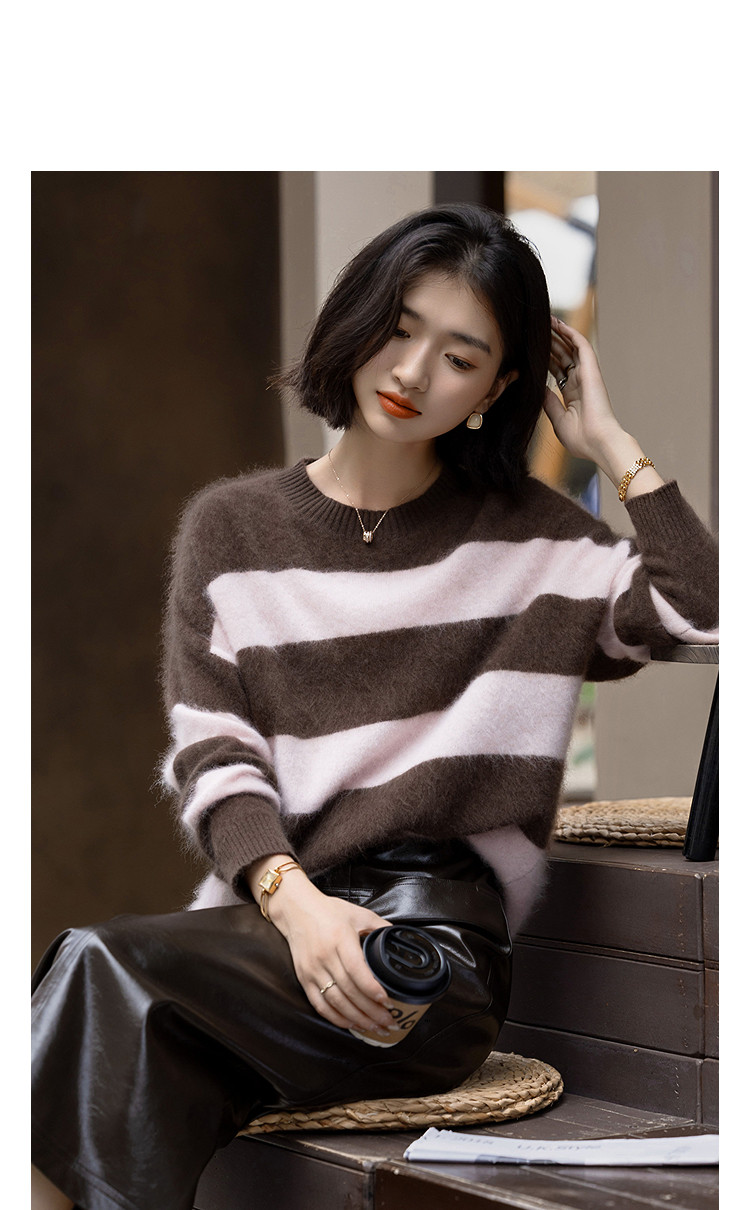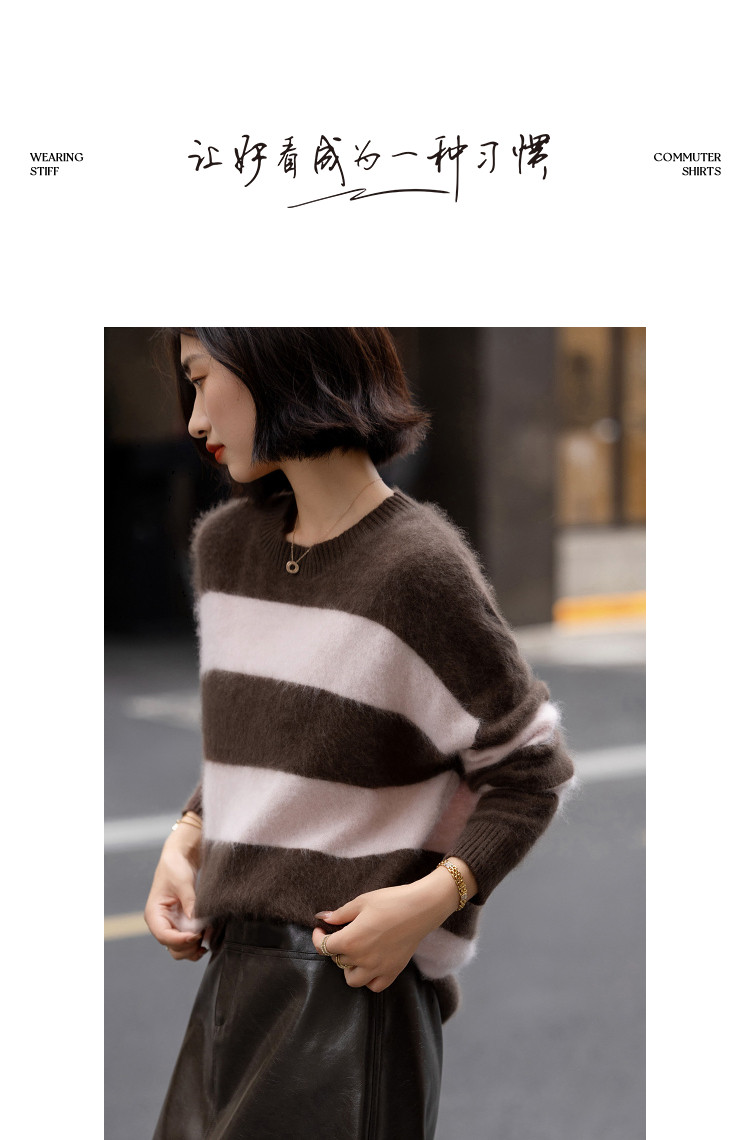 【100绵羊毛】冬季复古风圆领撞色条纹落肩宽松针织衫女上衣
