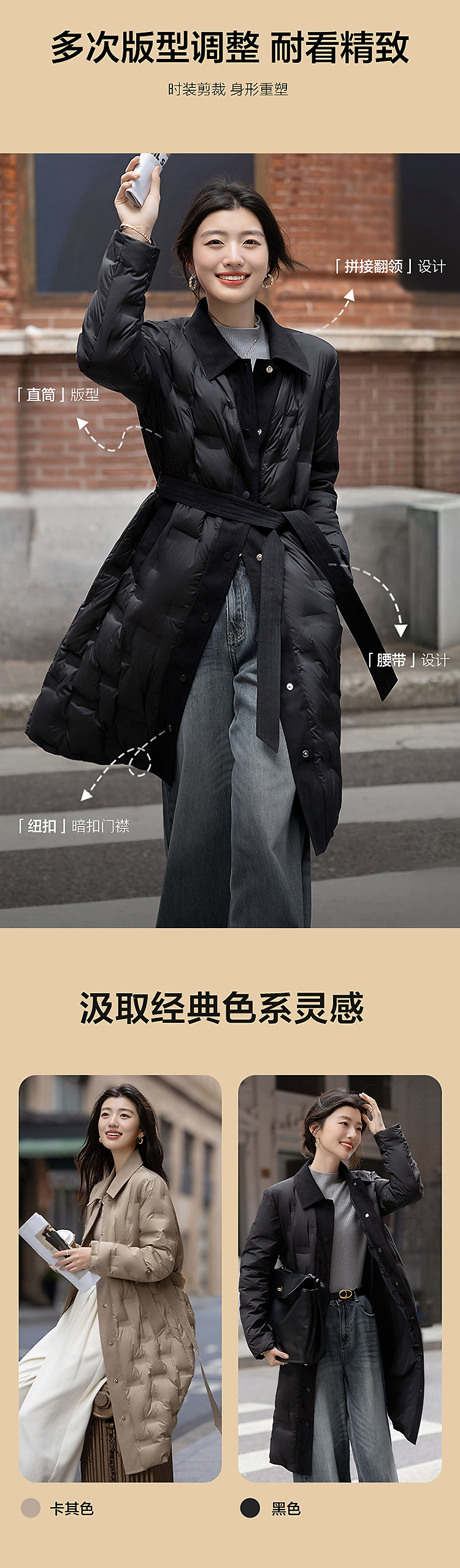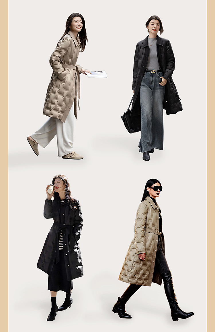 【暗夜星河】冬季高保暖90鸭绒撞色拼接翻领直筒风衣式女羽绒服