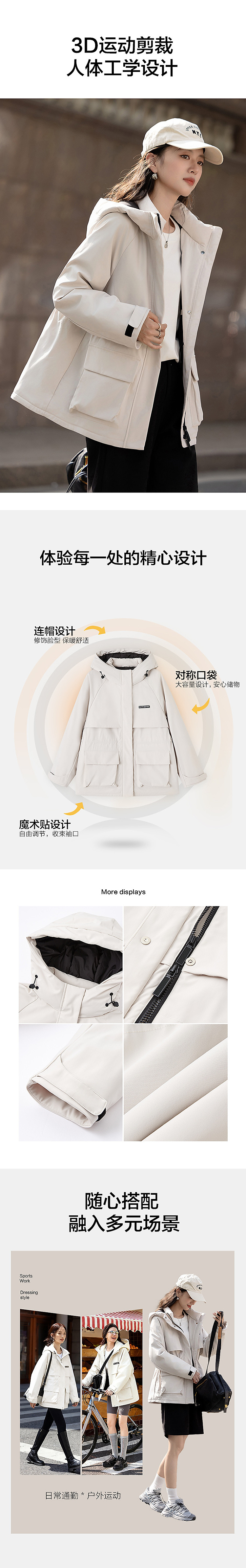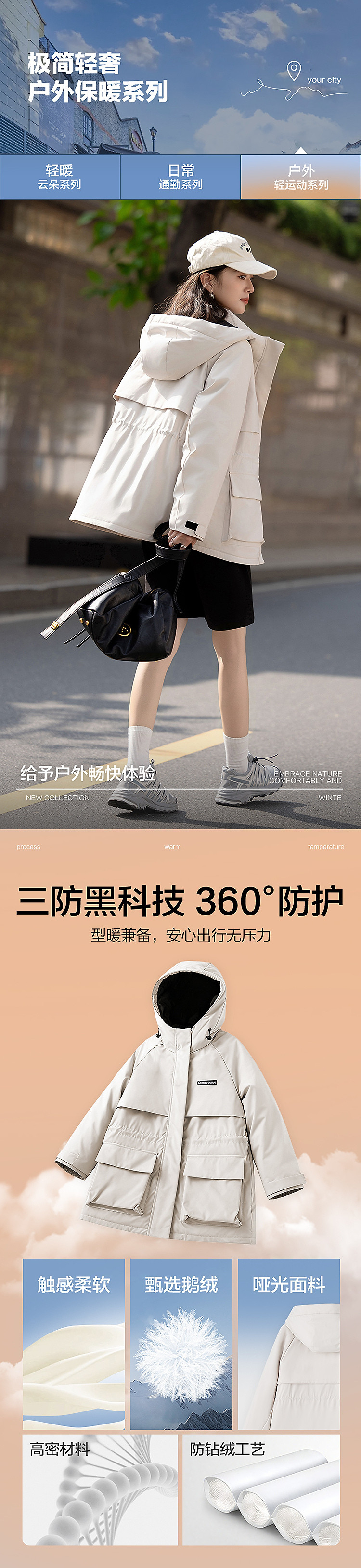 【三防黑科技】冬季保暖90鹅绒小提花北欧棉连帽魔术贴女羽绒服