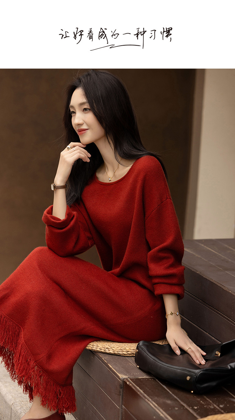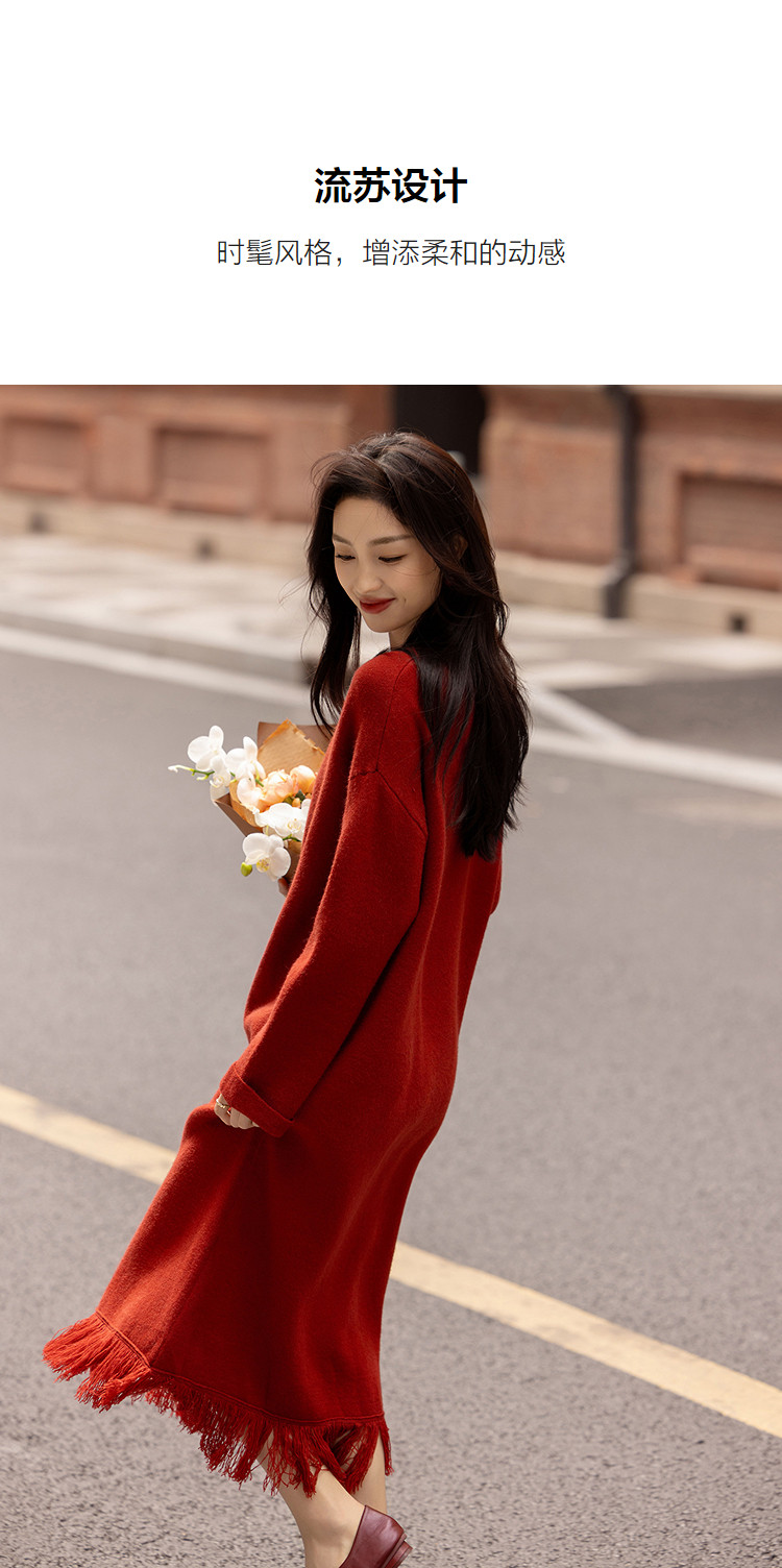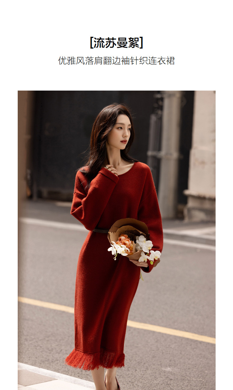 【浸染节庆的红】冬季温润纤绒纱流苏翻边袖气质针织连衣裙女长款