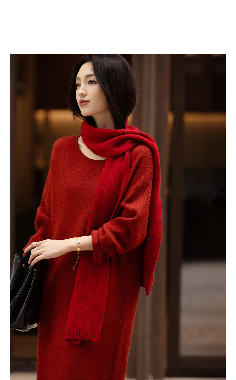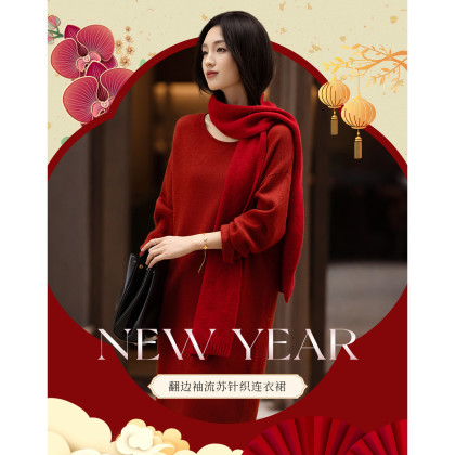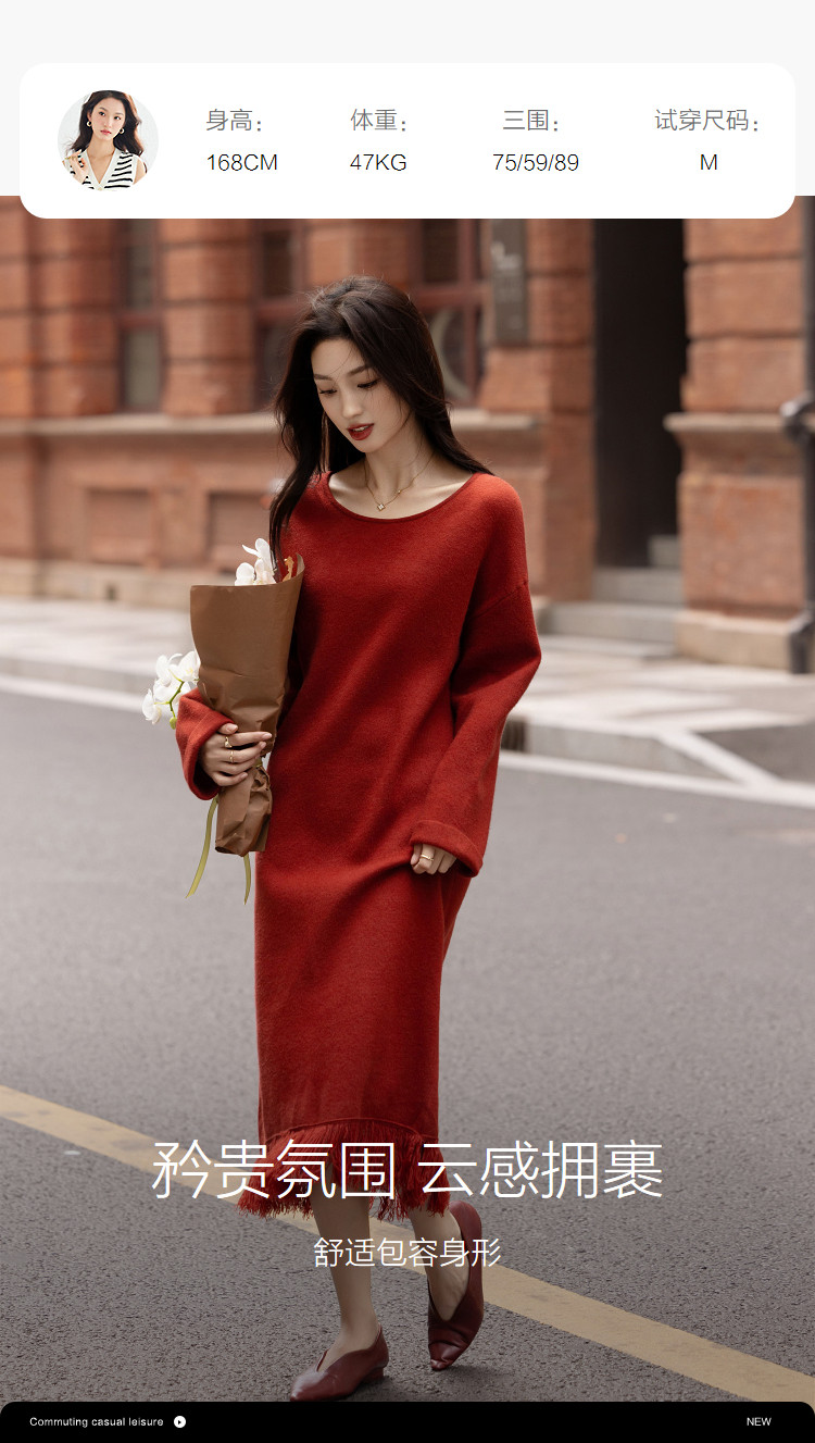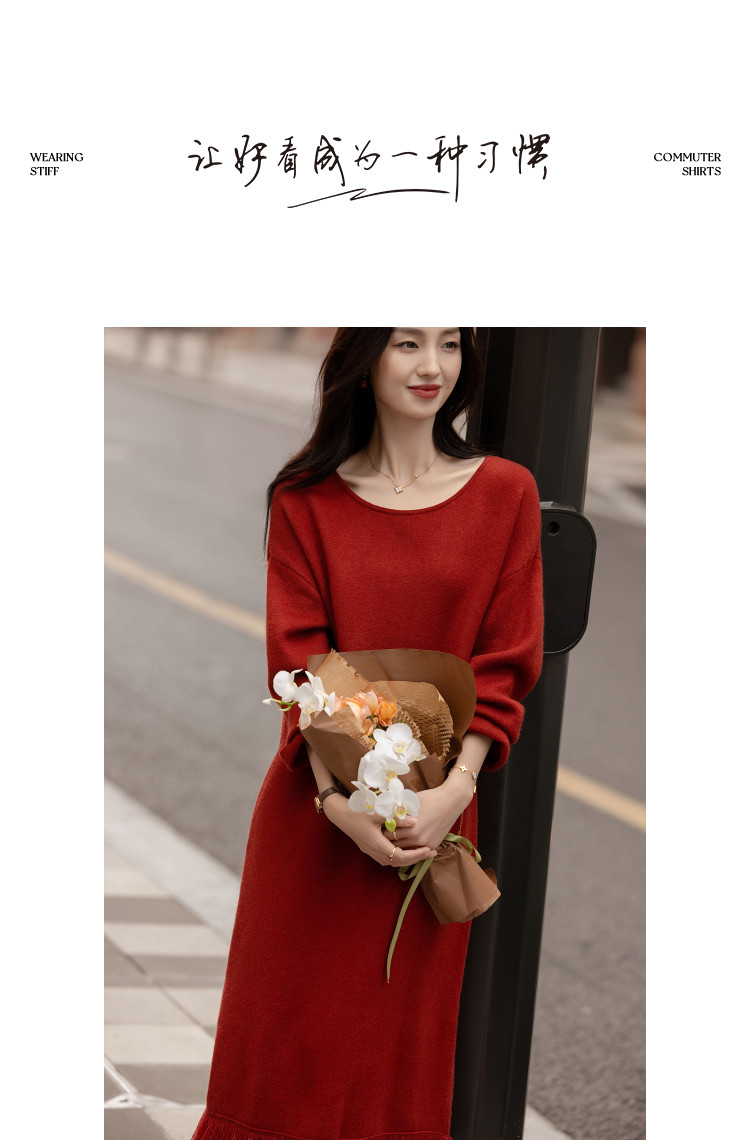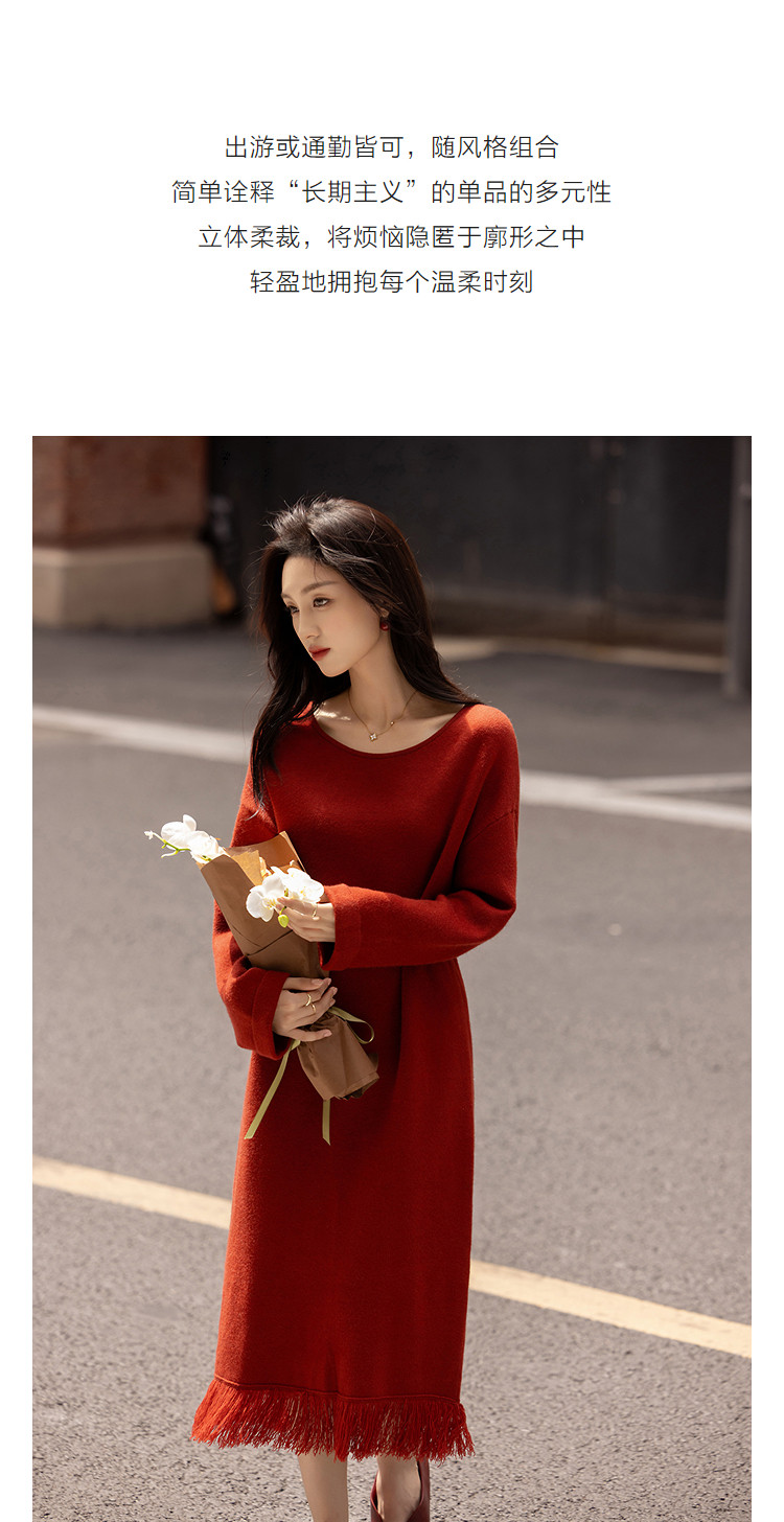【浸染节庆的红】冬季温润纤绒纱流苏翻边袖气质针织连衣裙女长款