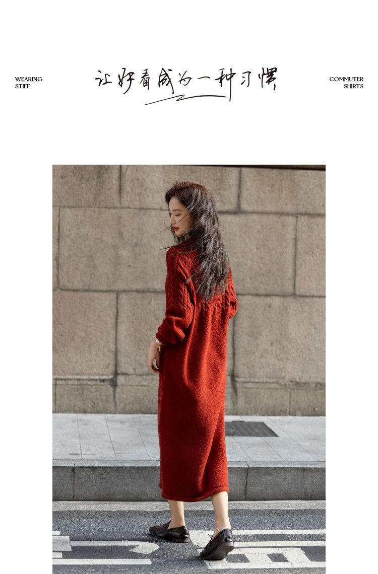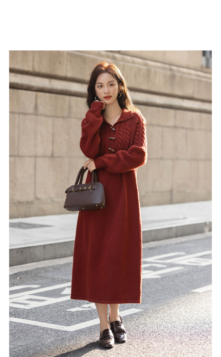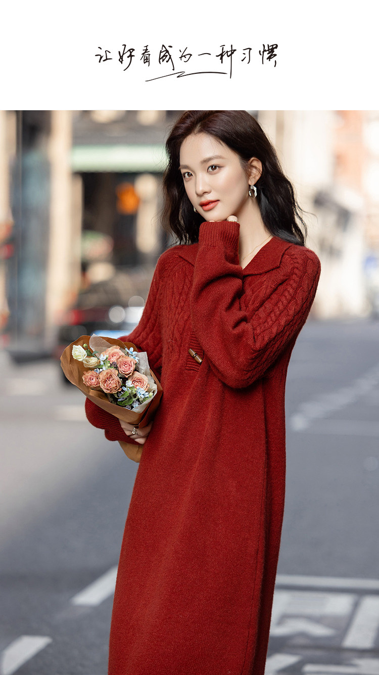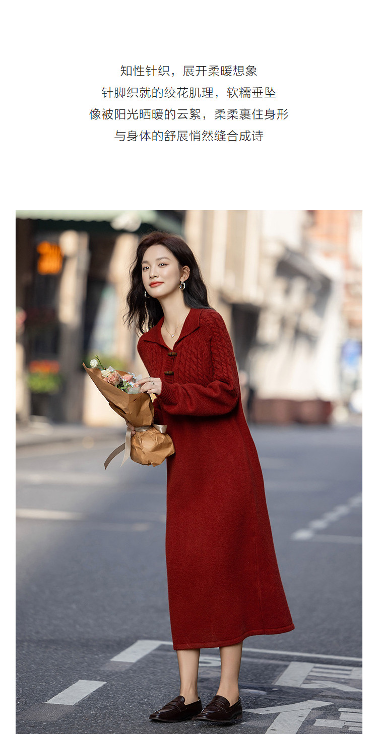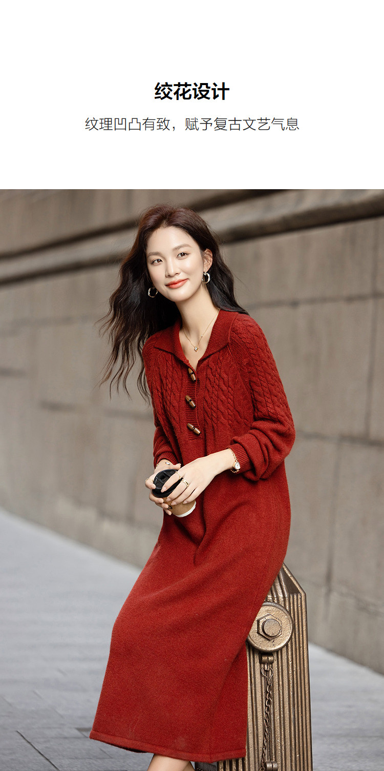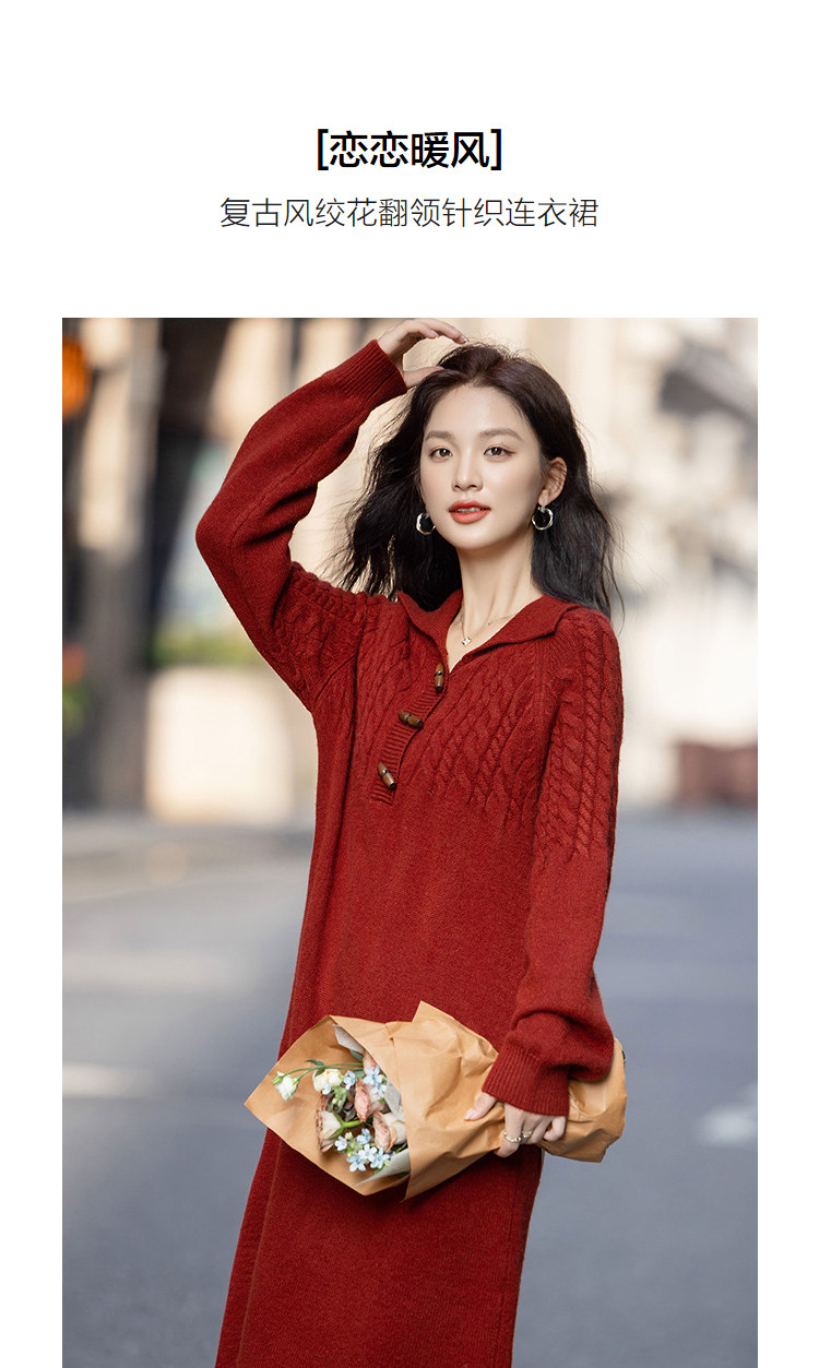 【恋恋暖风】冬季复古绞花翻领舒柔纤绒纱气质针织连衣裙女中长款