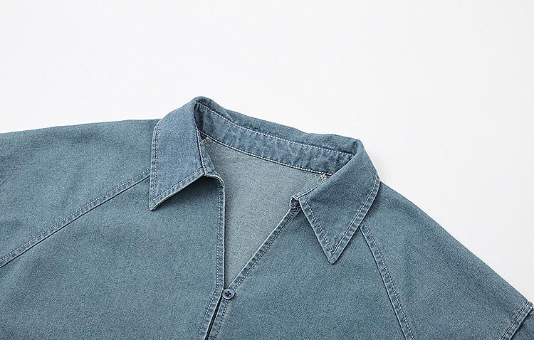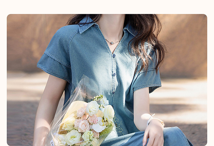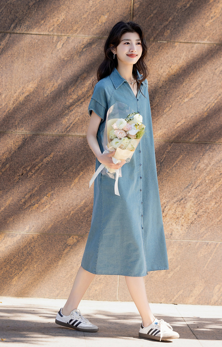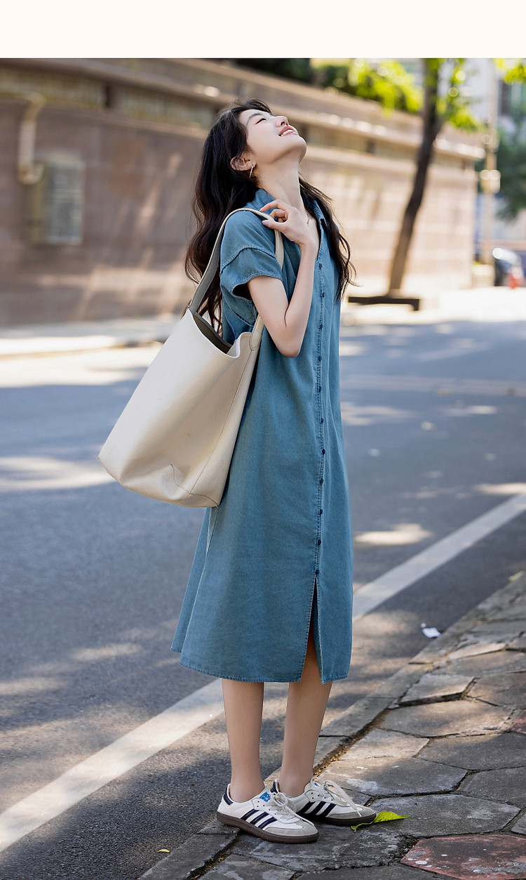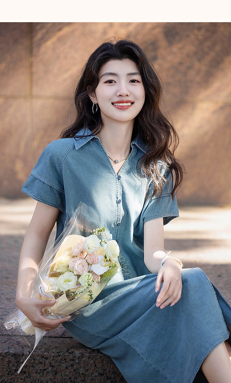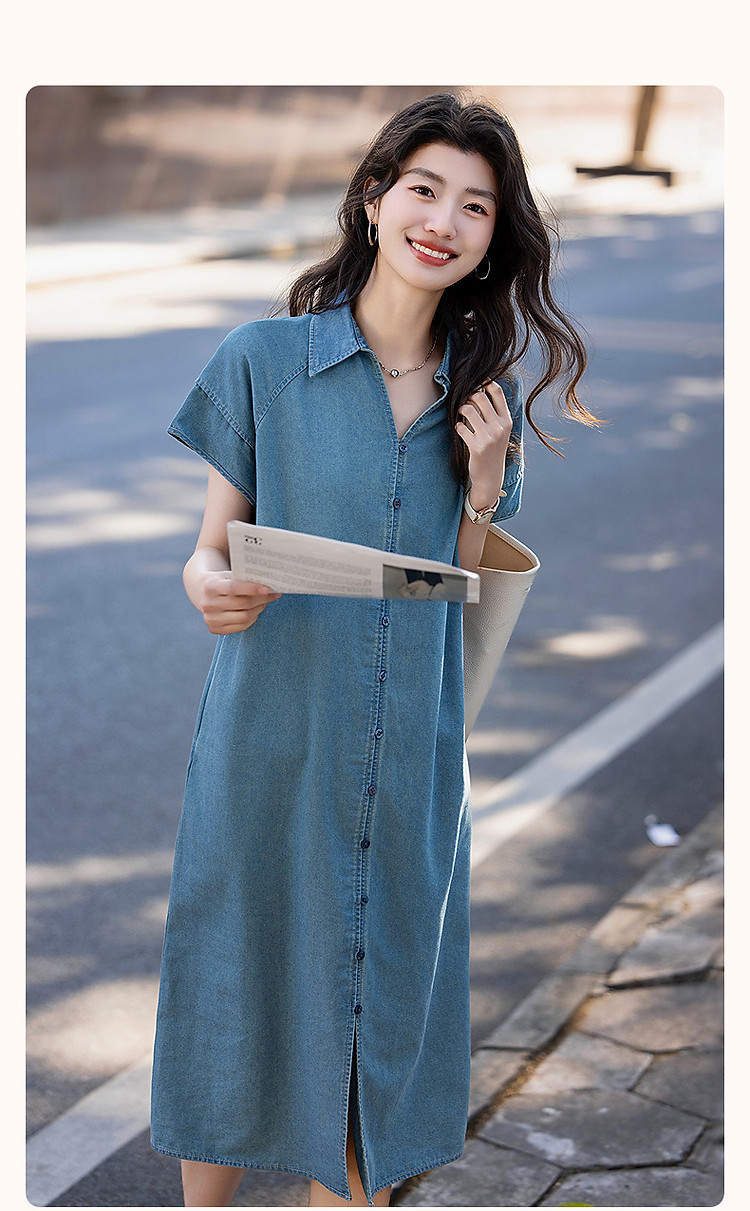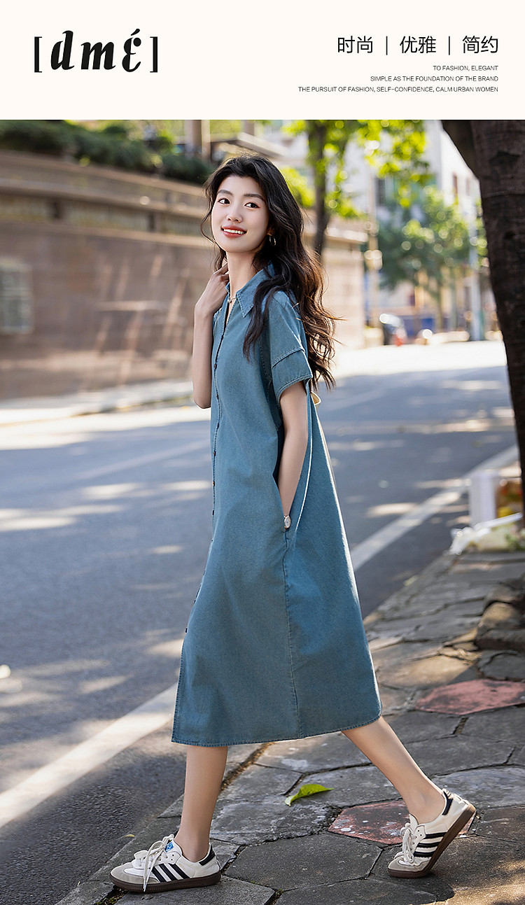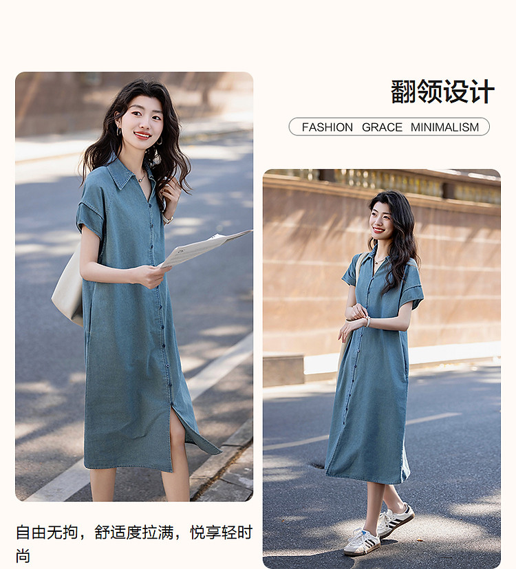 【实穿主义】简约风翻领云朵棉宽松舒适短袖女式牛仔连衣裙