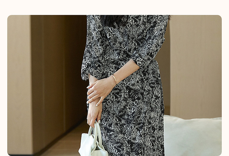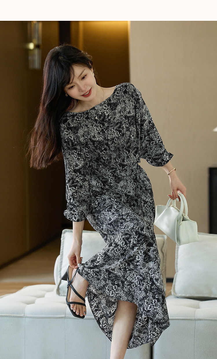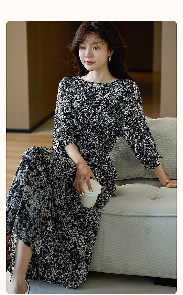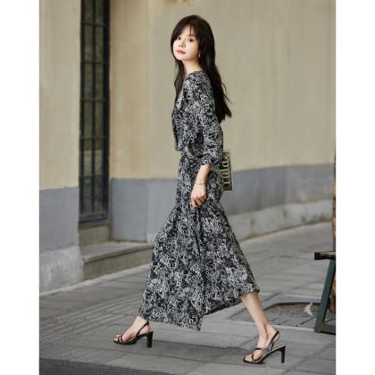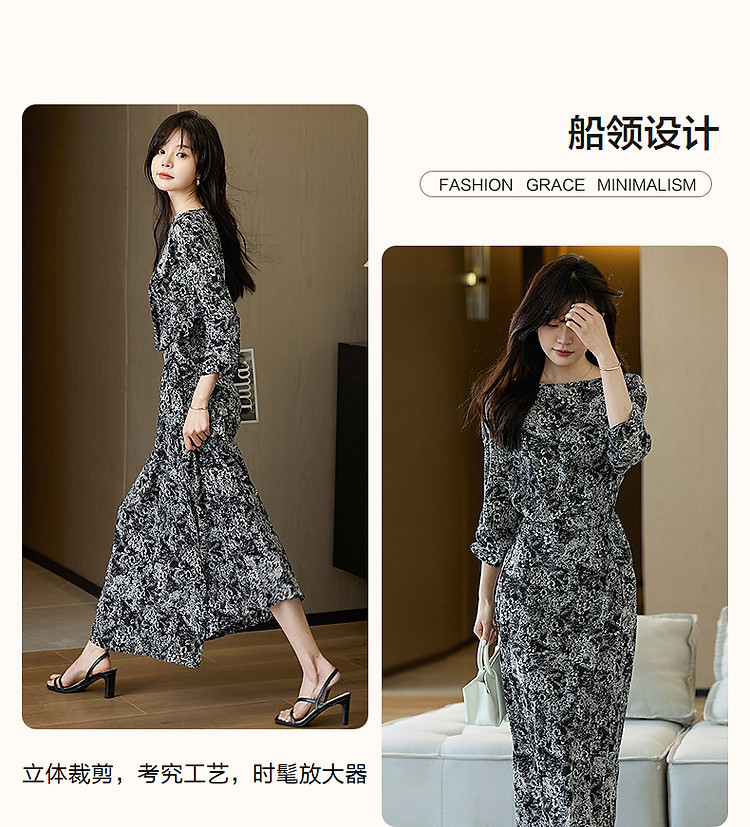 【优雅的律动】春季法式船领收腰碎花连肩围裹复片式女连衣裙