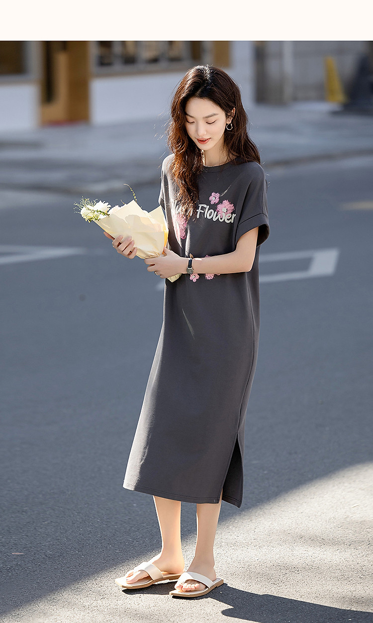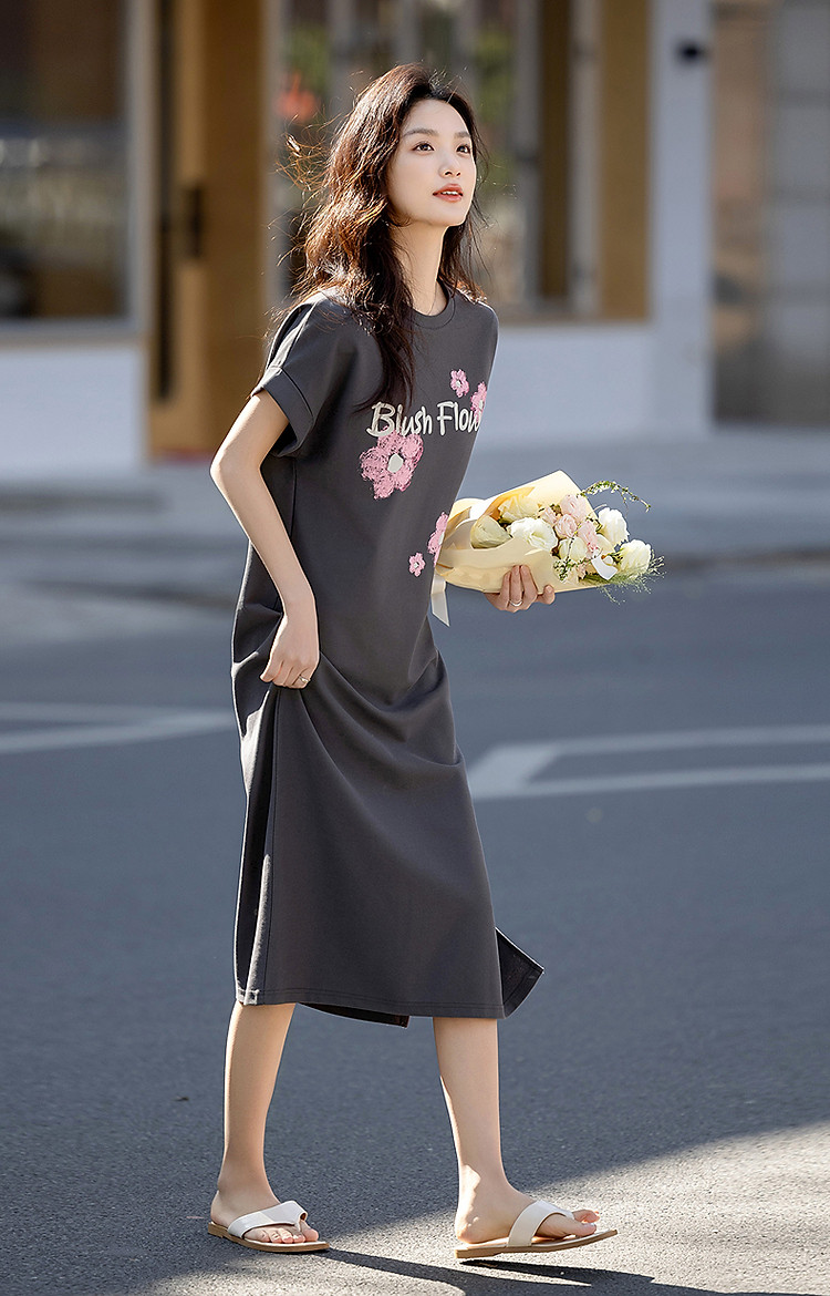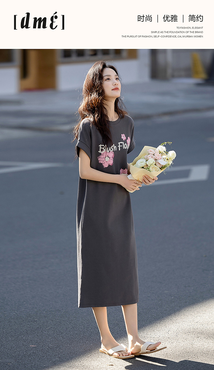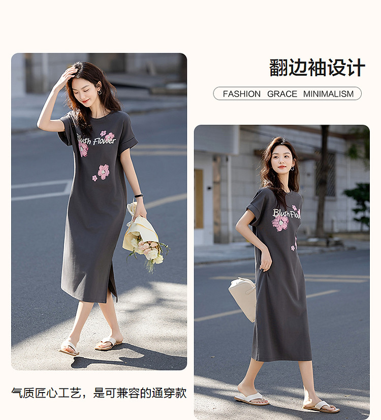 【215G珠地网眼】夏季气质字母印花宽边翻折袖圆领宽松连衣裙