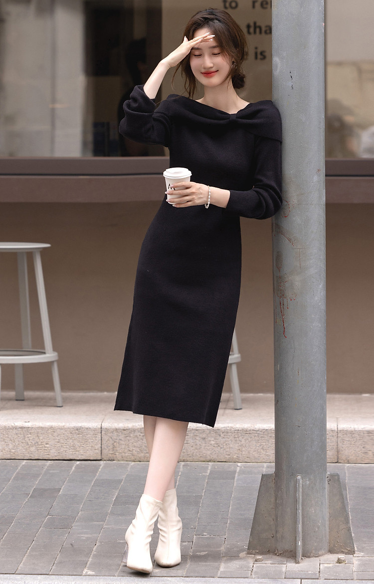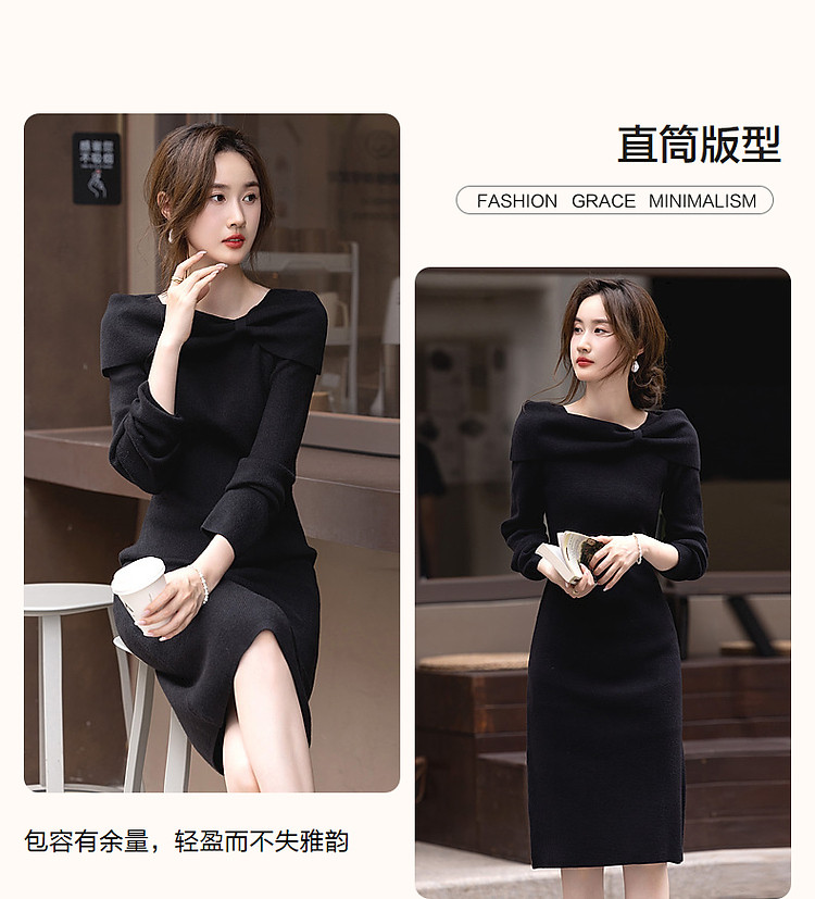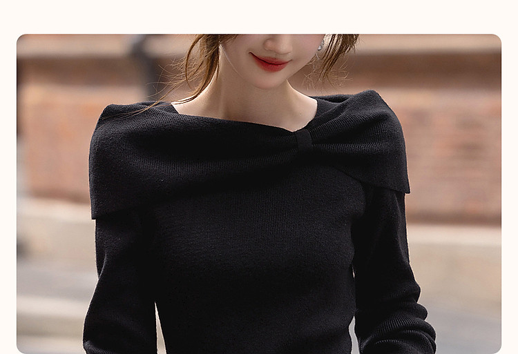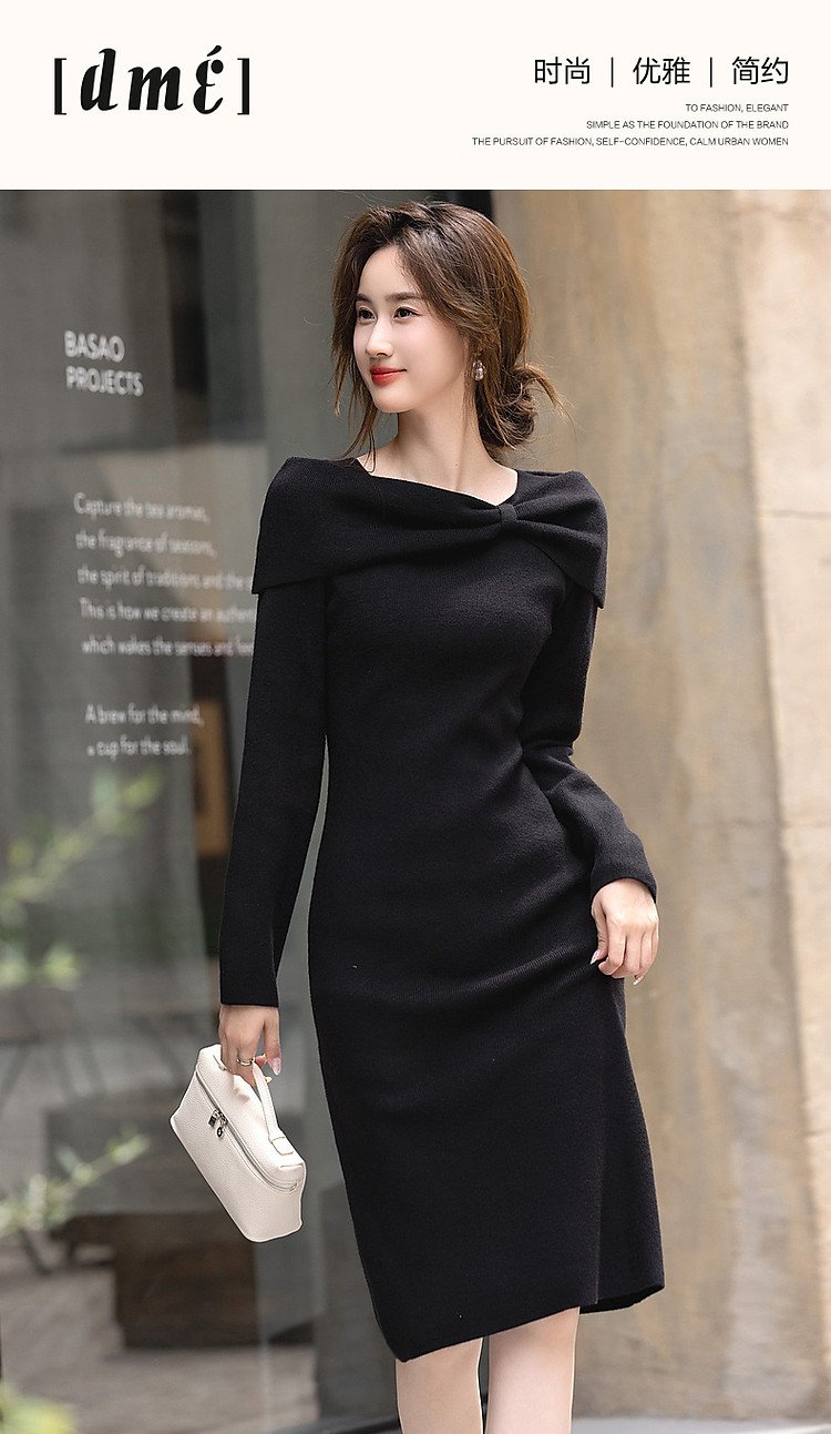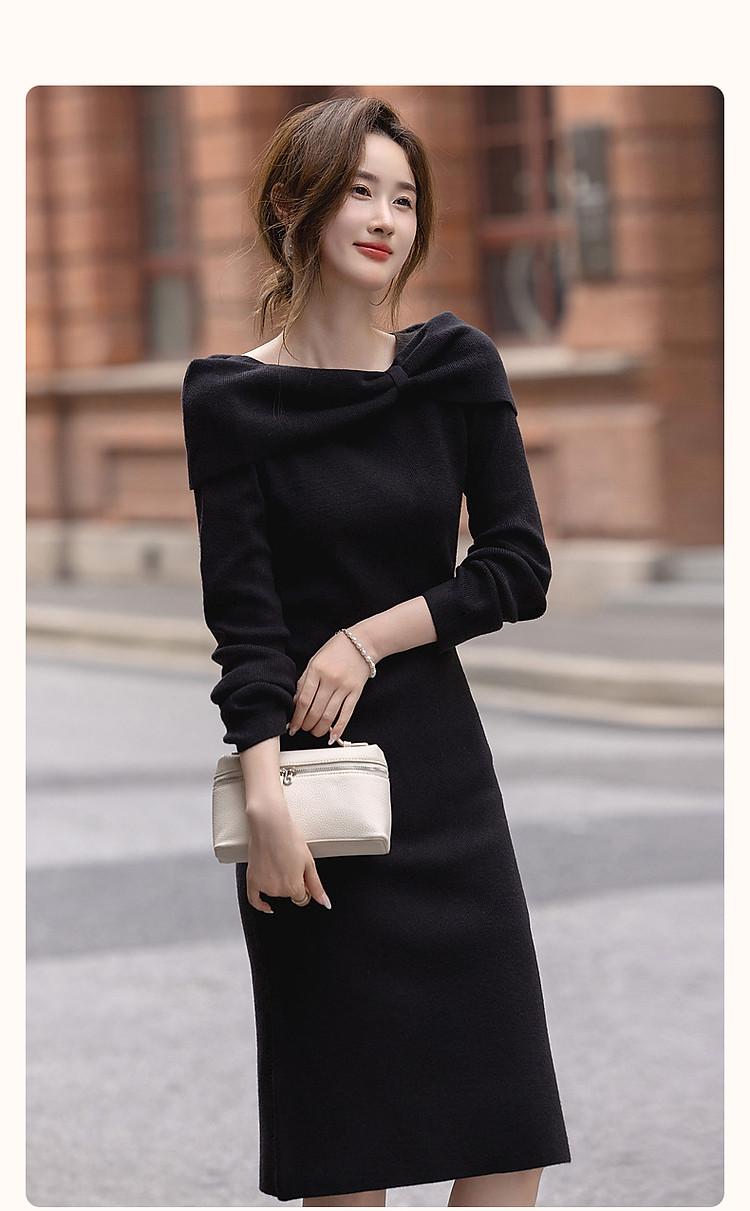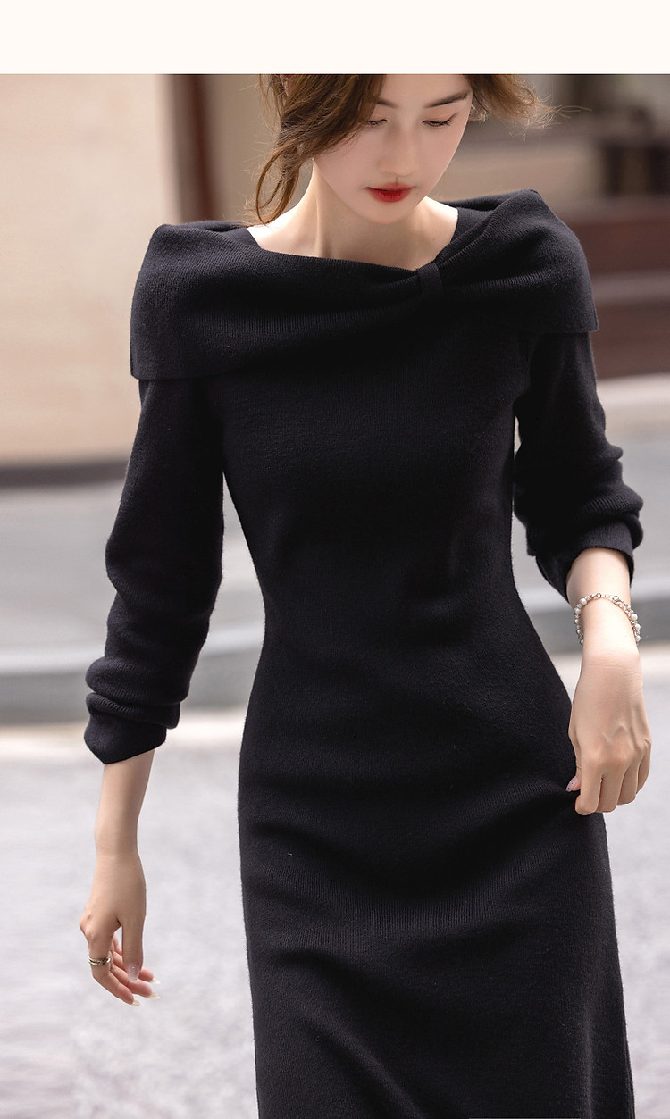 【双旦日C位】秋冬法式知性蝴蝶结一字领显瘦针织连衣裙女高级感