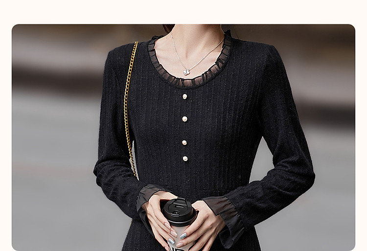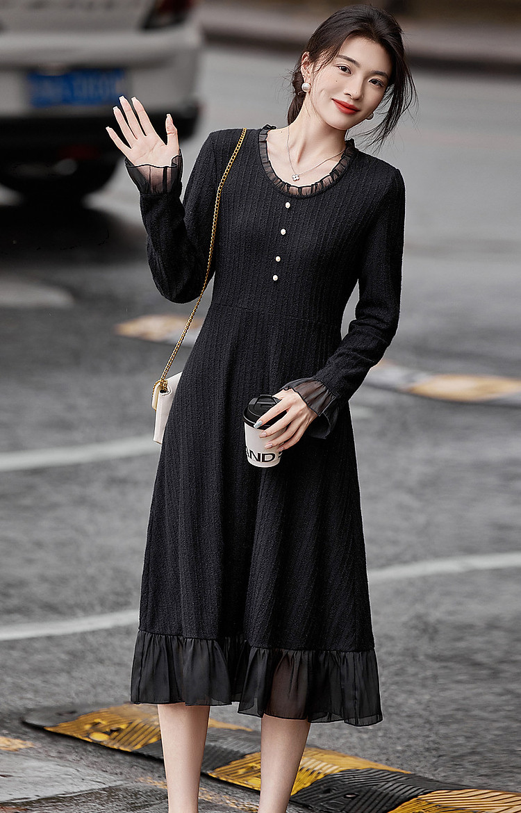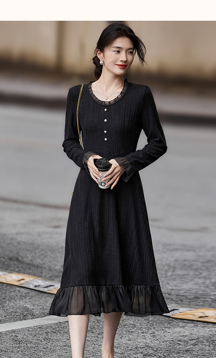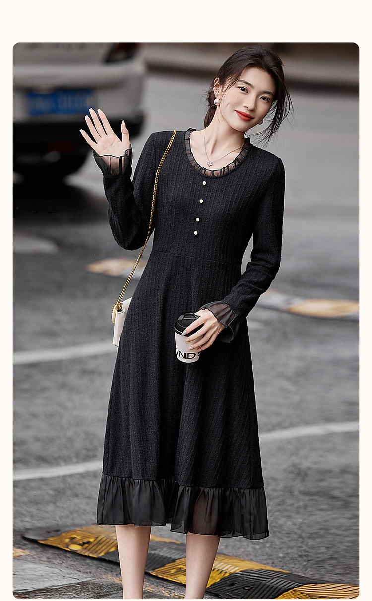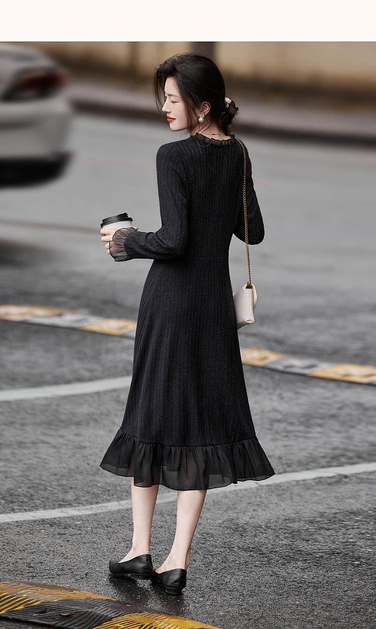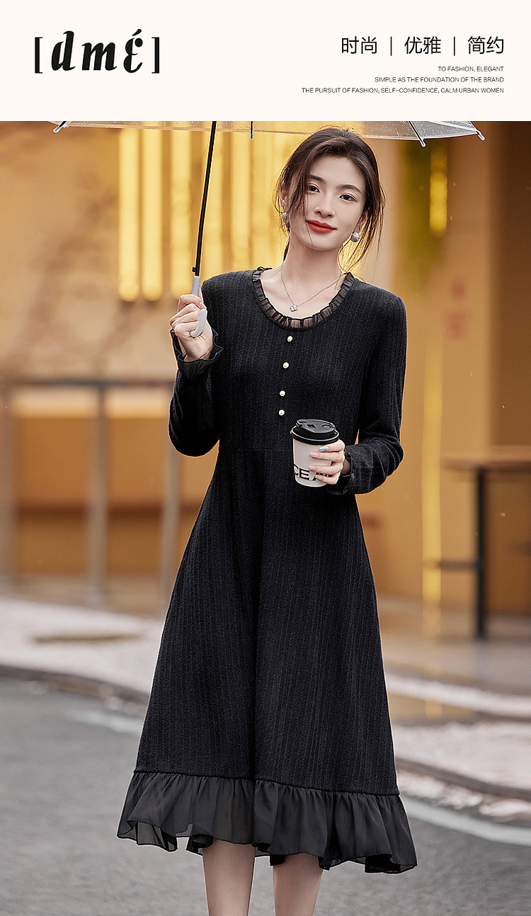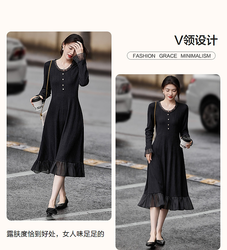 【韩风天花板】春秋高智涵养V领拼接花边收腰A字遮肉女式连衣裙