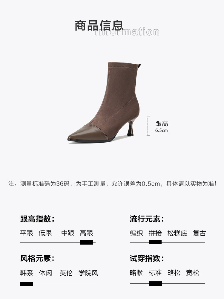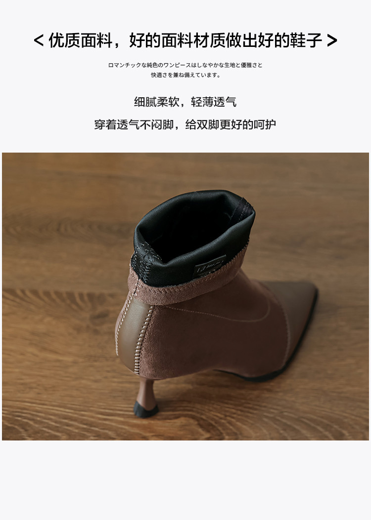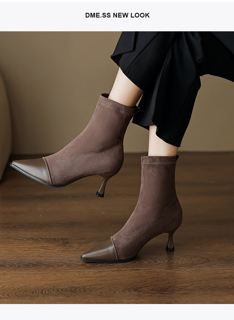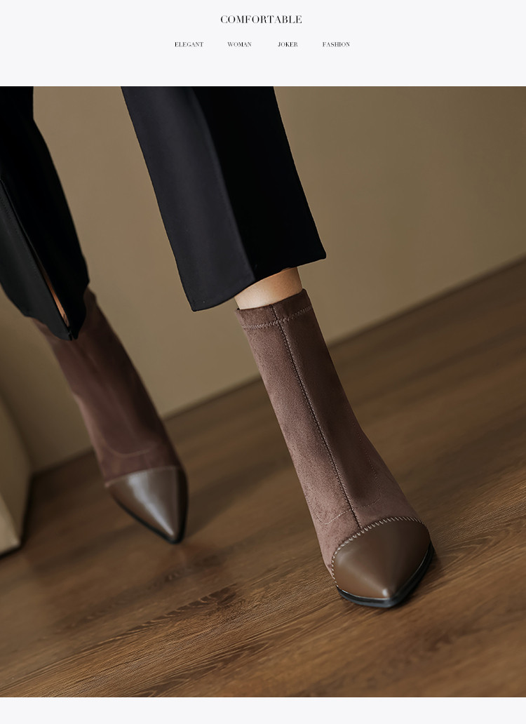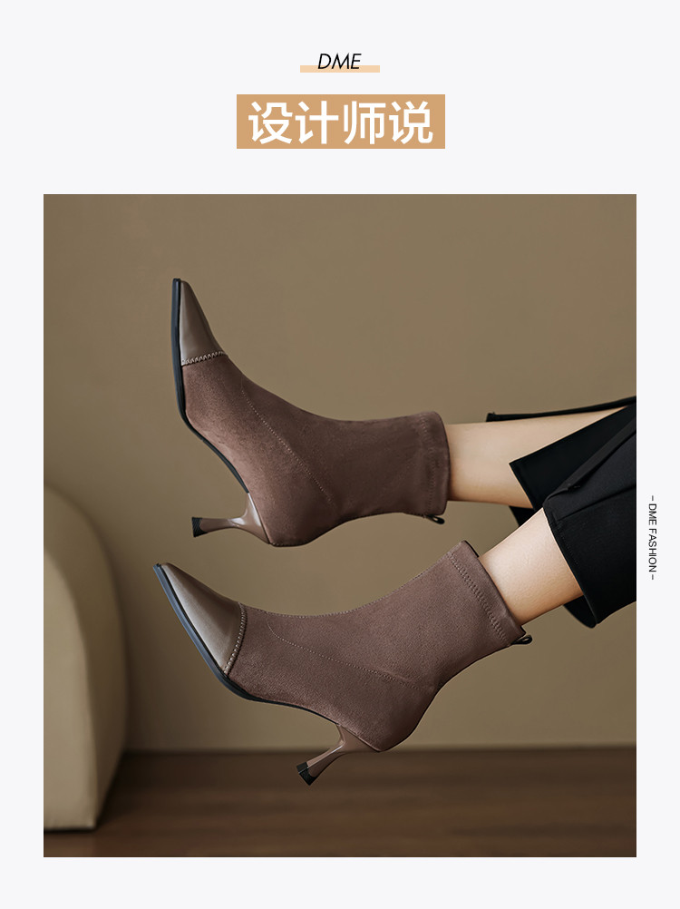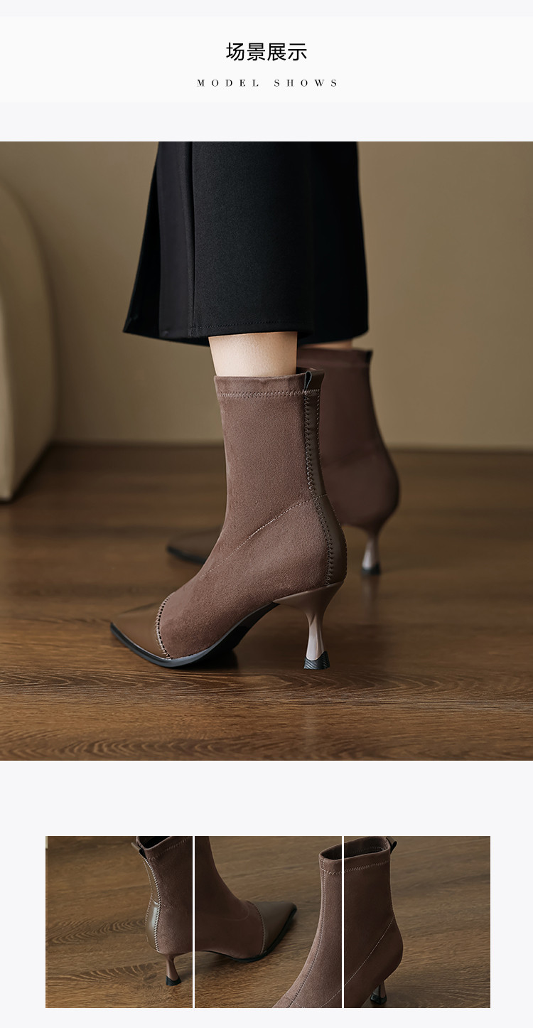 2024秋冬美拉德色系新款简约百搭韩版拼接绒面细跟尖头弹力靴女靴