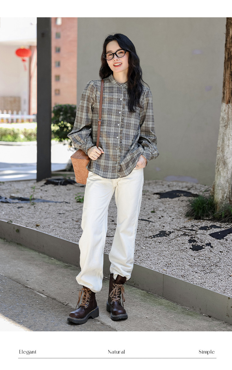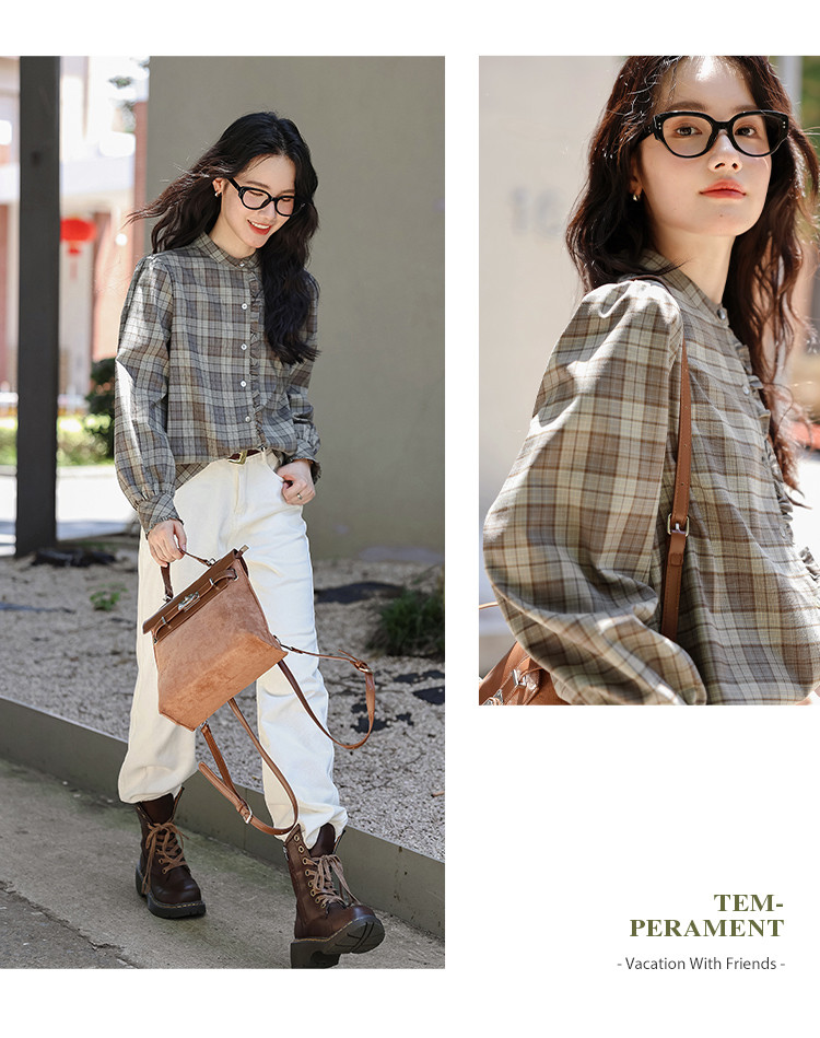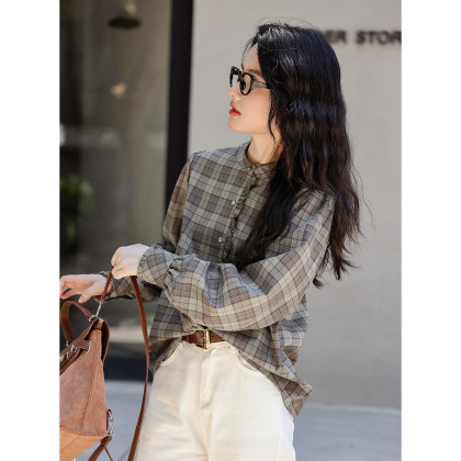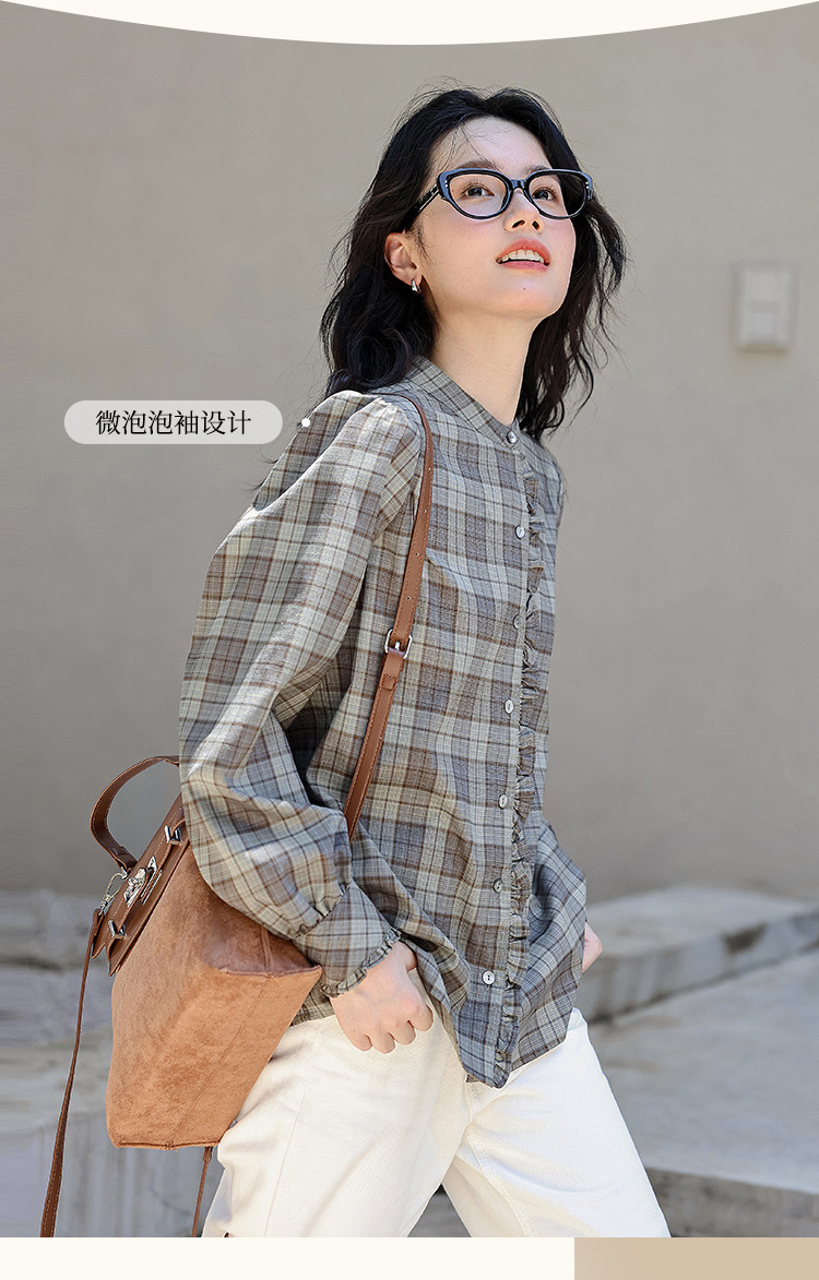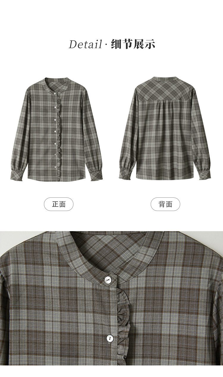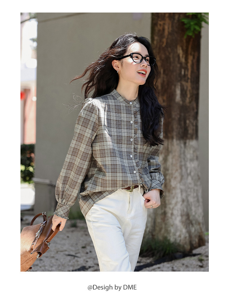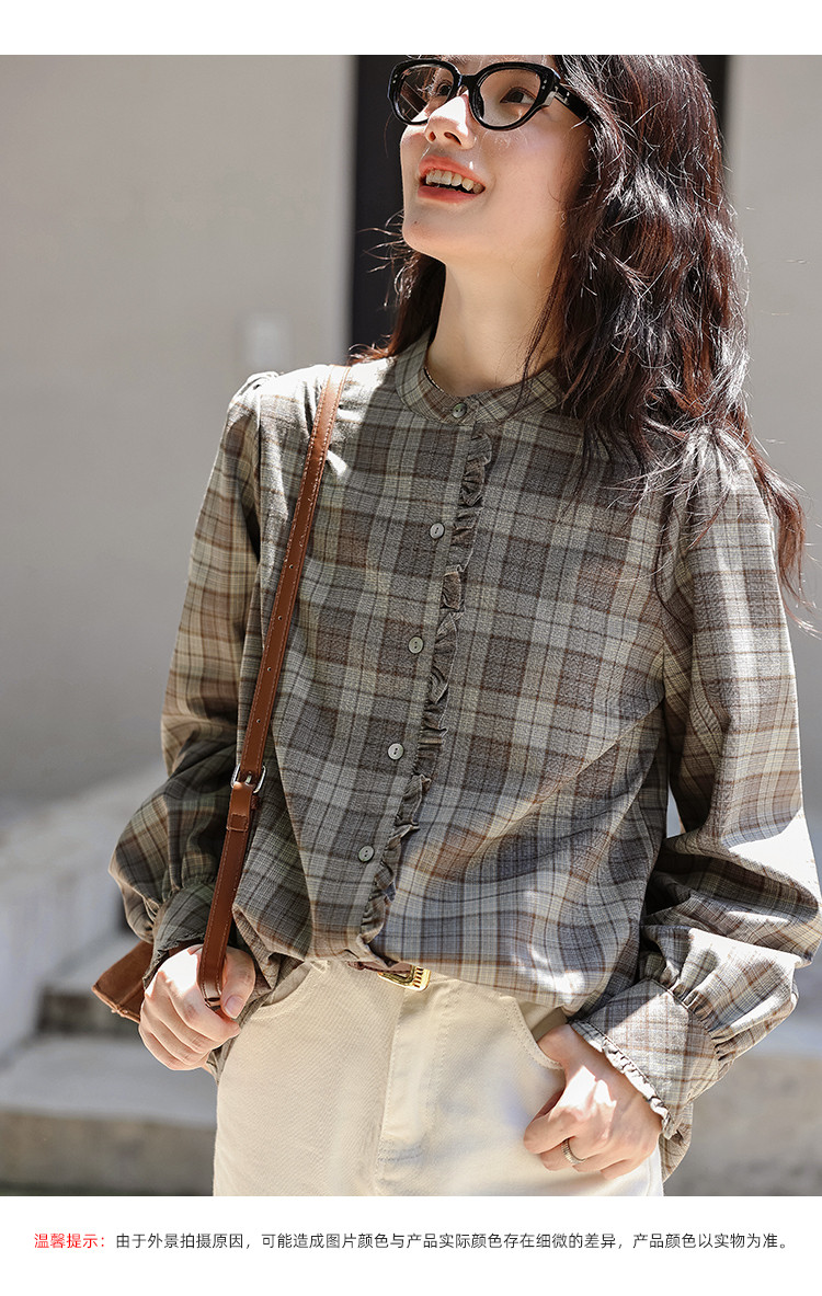 【格调职场】春秋立领叠穿花边拼接衬衣女高级感减龄格子衬衫女
