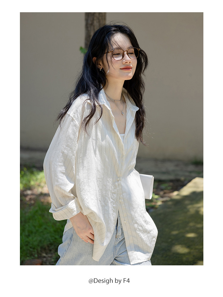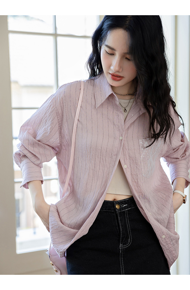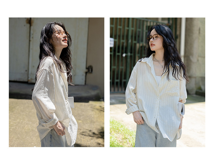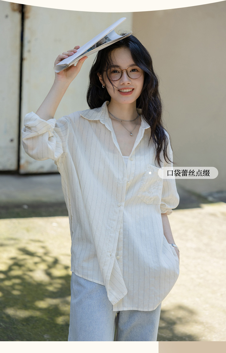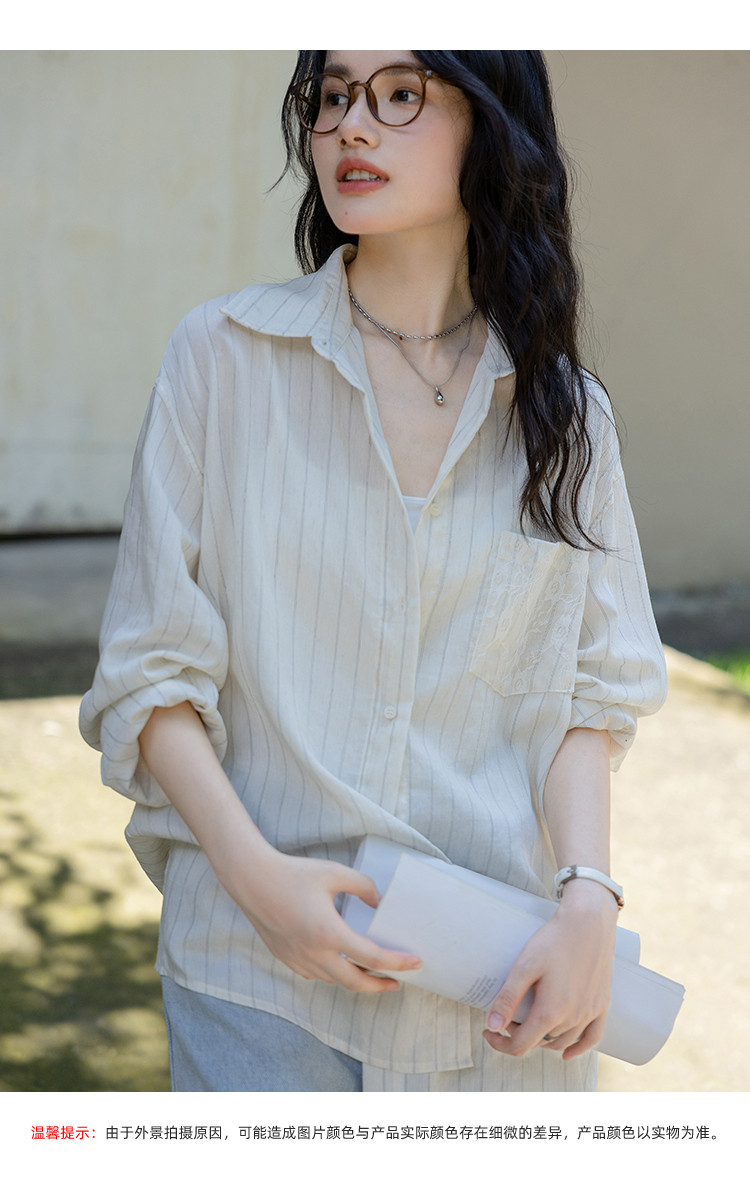 【蕾丝点缀慵懒学院风衬衫】新款优雅条纹拼接随性宽松长袖衬衫女