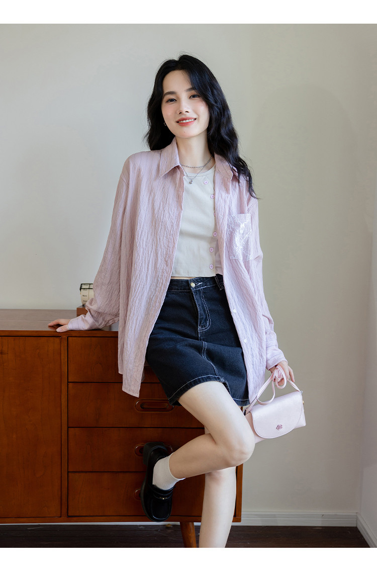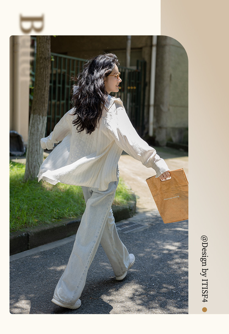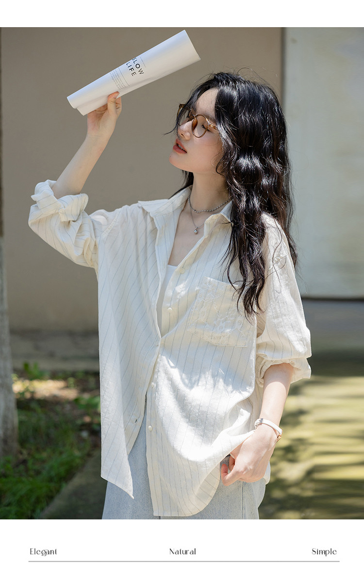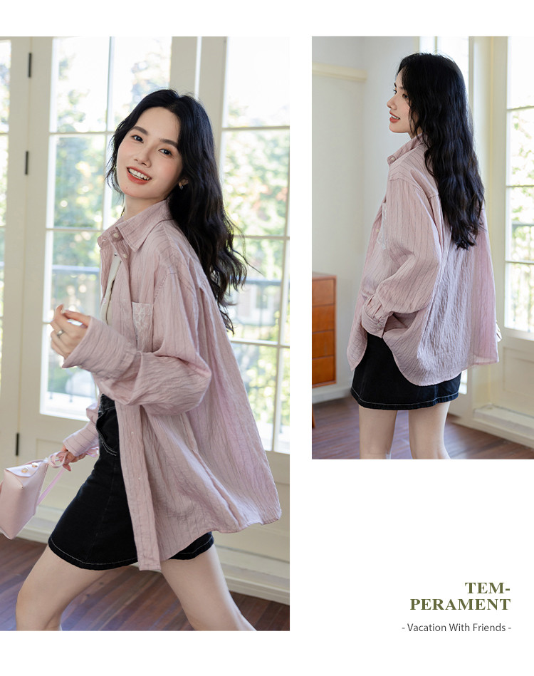 【蕾丝点缀慵懒学院风衬衫】新款优雅条纹拼接随性宽松长袖衬衫女