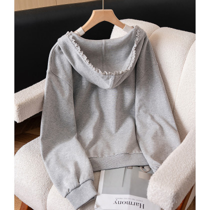 唐狮2026秋季新款卫衣女灰色木耳领高级感连帽甜美宽松减龄上衣