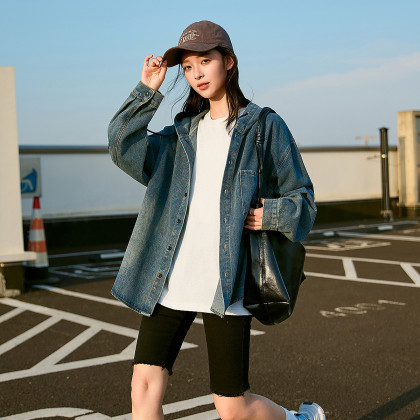 唐狮2026秋季衬衫女新款长袖水洗牛仔连帽复古时尚设计感上衣