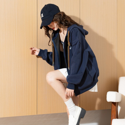 唐狮2025秋季开衫外套女士连帽字母印花藏青短款外套宽松休闲风
